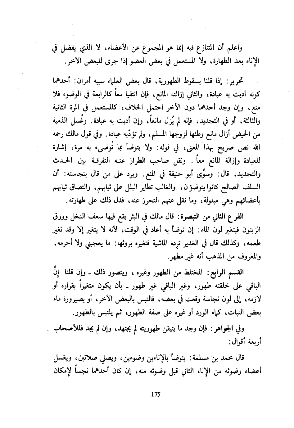 وَاعْلَمْ أَنَّ الْمُتَنَازَعَ فِيهِ إِنَّمَا هُوَ الْمَجْمُوعُ عَنِ الْأَعْضَاءِ لَا الَّذِي يَفْضُلُ فِي الْإِنَاءِ بَعْدَ الطَّهَارَةِ وَلَا الْمُسْتَعْمَلُ فِي بَعْضِ الْعُضْوِ إِذَا جَرَى لِلْبَعْضِ الْآخَرِ تَحْرِيرٌ إِذَا قُلْنَا بِسُقُوطِ الطَّهُورِيَّةِ قَالَ بَعْضُ الْعُلَمَاءِ سَبَبُهُ أَمْرَانِ أَحَدُهُمَا كَوْنُهُ أُدِّيَتْ بِهِ عِبَادَةٌ وَالثَّانِي إِزَالَتُهُ الْمَانِعَ فَإِنِ انْتَفَيَا مَعًا كَالرَّابِعَةِ فِي الْوُضُوءِ فَلَا مَنْعَ وَإِنْ وُجِدَ أَحَدُهُمَا دُونَ الْآخَرِ احْتَمَلَ الْخِلَافَ كَالْمُسْتَعْمَلِ فِي الْمَرَّةِ الثَّانِيَةِ وَالثَّالِثَةِ أَوْ فِي التَّجْدِيدِ فَإِنَّهُ لَمْ يَزَلْ مَانِعًا وَإِنْ أُدِّيَتْ بِهِ عِبَادَةٌ وَغُسْلُ الذِّمِّيَّةِ مِنَ الْحَيْضِ أَزَالَ مَانِعَ وَطْئِهَا لِزَوْجِهَا الْمُسْلِمِ وَلَمْ تؤدبه عِبَادَةٌ وَفِي قَوْلِ مَالِكٍ رَحِمَهُ اللَّهُ نَصٌّ صَرِيحٌ بِهَذَا الْمَعْنَى فِي قَوْلِهِ وَلَا يُتَوَضَّأُ بِمَا توضىء بِهِ مَرَّةً إِشَارَةً لِلْعِبَادَةِ وَإِزَالَةِ الْمَانِعِ مَعًا وَنقل صَاحب الطّراز عِنْد التَّفْرِقَة بَين الْحَدث والتجديد قَالَ وَسوى أَبُو حنيفَة فِي الْمَنْعِ وَيُرَدُّ عَلَى مَنْ قَالَ بِنَجَاسَتِهِ أَن السّلف الصَّالح كَانُوا يتوضؤن وَالْغَالِبُ تَطَايُرُ الْبَلَلِ عَلَى ثِيَابِهِمْ وَالْتِصَاقُ ثِيَابِهِمْ بِأَعْضَائِهِمْ وَهِيَ مَبْلُولَةٌ وَمَا نُقِلَ عَنْهُمُ التَّحَرُّزُ عَنْهُ فَدَلَّ ذَلِكَ عَلَى طَهَارَتِهِ الْفَرْعُ الثَّانِي مِنَ التَّبْصِرَةِ قَالَ مَالِكٌ فِي الْبِئْرِ يَقَعُ فِيهَا سَعَفُ النَّخْلِ وَوَرَقُ الزَّيْتُونِ فَيَتَغَيَّرُ لَوْنُ الْمَاءِ إِنْ تَوَضَّأَ بِهِ أَعَادَ فِي الْوَقْتِ لِأَنَّه لَا يَتَغَيَّرُ إِلَّا وَقَدْ تَغَيَّرَ طَعْمُهُ وَكَذَلِكَ قَالَ فِي الْغَدِيرِ تَرِدُهُ الْمَاشِيَةُ فَتُغَيِّرُهُ بِرَوْثِهَا مَا يُعْجِبُنِي وَلَا أُحَرِّمُهُ وَالْمَعْرُوفُ مِنَ الْمَذْهَبِ أَنَّهُ غَيْرُ مُطَهِّرٍ الْقِسْمُ الرَّابِعُ الْمُخْتَلِطُ مِنَ الطَّهُورِ وَغَيْرِهِ وَيُتَصَوَّرُ ذَلِكَ وَإِنْ قُلْنَا إِنَّ الْبَاقِيَ عَلَى خِلْقَتِهِ طَهُورٌ وَغَيْرَ الْبَاقِي غَيْرُ طَهُورٍ بِأَنْ يَكُونَ مُتَغَيِّرًا بِقَرَارِهِ أَوْ لَازِمِهِ إِلَى لَوْنِ نَجَاسَةٍ وَقَعَتْ فِي بَعْضِهِ فَالْتَبَسَ بِالْبَعْضِ الْآخَرِ أَوْ بِصَيْرُورَةِ مَاءِ بَعْضِ النَّبَاتِ كَمَاءِ الْوَرْدِ أَوْ غَيْرِهِ عَلَى صِفَةِ الطَّهُورِ ثُمَّ يَلْتَبِسُ بِالطَّهُورِ وَفِي الْجَوَاهِرِ فَإِنْ وَجَدَ مَا يَتَيَقَّنُ طَهُورِيَّتَهُ لَمْ يَجْتَهِدْ وَإِنْ لَمْ يَجِدْ فَلِلْأَصْحَابِ أَرْبَعَةُ أَقْوَالٍ قَالَ مُحَمَّدُ بْنُ مَسْلَمَةَ يَتَوَضَّأُ بِالْإِنَاءَيْنِ وُضُوءَيْنِ وَيُصَلِّي صَلَاتَيْنِ وَيَغْسِلُ أَعْضَاءَ وُضُوئِهِ مِنَ الْإِنَاءِ الثَّانِي قَبْلَ وُضُوئِهِ مِنْهُ إِنْ كَانَ أَحَدُهُمَا نَجِسًا لِإِمْكَانِ