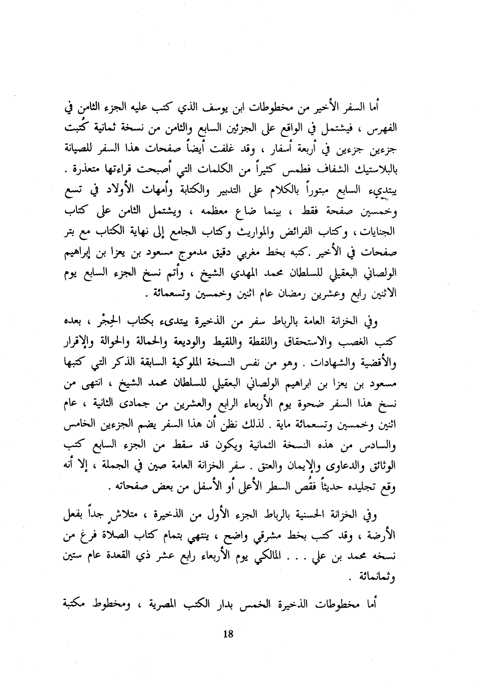 أما السّفر الْأَخير من مخطوطات ابْن يُوسُف الَّذِي كتب عَلَيْهِ الْجُزْء الثَّامِن فِي الفهرس فيشتمل فِي الْوَاقِع على الجزئين السَّابِع وَالثَّامِن من نُسْخَة ثَمَانِيَة كتبت جزءين جزءين فِي أَرْبَعَة أسفار وَقد غلفت أَيْضا صفحات هَذَا السّفر للصيانة بالبلاستيك الشفاف فطمس كثيرا من الْكَلِمَات الَّتِي أَصبَحت قرَاءَتهَا متعذرة يَبْتَدِئ السَّابِع مبتورا بالْكلَام على التَّدْبِير وَالْكِتَابَة وَأُمَّهَات الْأَوْلَاد فِي تسع وَخمسين صفحة فَقَط بَيْنَمَا ضَاعَ معظمه ويشتمل الثَّامِن على كتاب الْجِنَايَات وَكتاب الْفَرَائِض والمواريث وَكتاب الْجَامِع إِلَى نِهَايَة الْكتاب مَعَ بتر صفحات فِي الْأَخير كتبه بِخَط مغربي دَقِيق مدموج مَسْعُود بن يعزا بن إِبْرَاهِيم الولصاني البعقيلي للسُّلْطَان مُحَمَّد الْمهْدي الشَّيْخ وَأتم نسخ الْجُزْء السَّابِع يَوْم الِاثْنَيْنِ رَابِع وَعشْرين رَمَضَان عَام اثْنَيْنِ وَخمسين وَتِسْعمِائَة وَفِي الخزانة الْعَامَّة بالرباط سفر من الذَّخِيرَة يَبْتَدِئ بِكِتَاب الْحجر بعده كتب الْغَصْب والاستحقاق واللقطة واللقيط والوديعة والحمالة وَالْحوالَة وَالْإِقْرَار والأقضية والشهادات وَهُوَ من نفس النُّسْخَة الملوكية السَّابِقَة الذّكر الَّتِي كتبهَا مَسْعُود بن يعزا بن إِبْرَاهِيم الولصاني البعقيلي للسُّلْطَان مُحَمَّد الشَّيْخ انْتهى من نسخ هَذَا السّفر ضحوة يَوْم الْأَرْبَعَاء الرَّابِع وَالْعِشْرين من جُمَادَى الثَّانِيَة عَام اثْنَيْنِ وَخمسين وَتِسْعمِائَة ماية لذَلِك نظن أَن هَذَا السّفر يضم الجزءين الْخَامِس وَالسَّادِس من هَذِه النُّسْخَة الثَّمَانِية وَيكون قد سقط من الْجُزْء السَّابِع كتب الوثائق والدعاوى وَالْإِيمَان وَالْعِتْق سفر الخزانة الْعَامَّة صين فِي الْجُمْلَة إِلَّا أَنه وَقع تجليده حَدِيثا فَقص السطر الْأَعْلَى أَو الْأَسْفَل من بعض صفحاته وَفِي الخزانة الحسنية بالرباط الْجُزْء الأول من الذَّخِيرَة متلاش جدا بِفعل الأرضة وَقد كتب بِخَط مشرقي وَاضح يَنْتَهِي بِتمَام كتاب الصَّلَاة فرغ من نسخه مُحَمَّد بن عَليّ الْمَالِكِي يَوْم الْأَرْبَعَاء رَابِع عشر ذِي الْقعدَة عَام سِتِّينَ وَثَمَانمِائَة أما مخطوطات الذَّخِيرَة الْخمس بدار الْكتب المصرية ومخطوط مكتبة