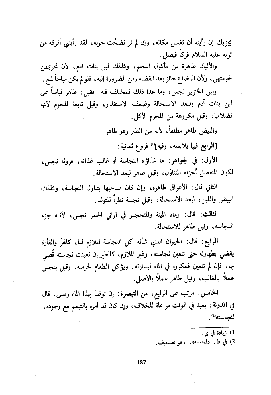 يَجْزِيكَ إِنْ رَأَيْتَهُ أَنْ تَغْسِلَ مَكَانَهُ وَإِنْ لَمْ تَرَ نَضَحْتَ حَوْلَهُ لَقَدْ رَأَيْتُنِي أَفْرُكُهُ مِنْ ثَوْبِهِ عَلَيْهِ السَّلَامُ فَرْكًا فَيُصَلِّي وَالْأَلْبَانُ طَاهِرَةٌ مِنْ مَأْكُولِ اللَّحْمِ وَكَذَلِكَ لَبَنُ بَنَاتِ آدَمَ لِأَنَّ تَحْرِيمَهُنَّ لِحُرْمَتِهِنَّ وَلِأَنَّ الرَّضَاعَ جَائِزٌ وَبعد انْقِضَاءِ زَمَنِ الضَّرُورَةِ إِلَيْهِ فَلَوْ لَمْ يَكُنْ مُبَاحًا لَمُنِعَ وَلَبَنُ الْخِنْزِيرِ نَجِسٌ وَمَا عَدَا ذَلِك فمختلف فِيهِ فَقيل طَاهِر قياسيا عَلَى لَبَنِ بَنَاتِ آدَمَ وَلِبُعْدِ الِاسْتِحَالَةِ وَضَعْفِ الِاسْتِقْذَارِ وَقِيلَ تَابِعَةٌ لِلُّحُومِ لِأَنَّهَا فَضَلَاتُهَا وَقِيلَ مَكْرُوهَةٌ مِنَ الْمُحَرَّمِ الْأَكْلِ وَالْبَيْضُ طَاهِرٌ مُطْلَقًا لِأَنَّه مِنَ الطَّيْرِ وَهُوَ طَاهِرٌ الرَّابِعُ فِيمَا يُلَابِسُهُ وَفِيهِ فُرُوعٌ ثَمَانِيَةٌ الْأَوَّلُ فِي الْجَوَاهِرِ مَا غِذَاؤُهُ النَّجَاسَةُ أَوْ غَالِبُ غِذَائِهِ فَرَوْثُهُ نَجِسٌ لِكَوْنِ الْمُنْفَصِلِ أَجْزَاءَ الْمُتَنَاوَلِ وَقِيلَ طَاهِرٌ لِبُعْدِ الِاسْتِحَالَةِ الثَّانِي قَالَ الْأَعْرَاقُ طَاهِرَةٌ وَإِنْ كَانَ صَاحِبُهَا يَتَنَاوَلُ النَّجَاسَةَ وَكَذَلِكَ الْبَيْضُ وَاللَّبَنُ لِبُعْدِ الِاسْتِحَالَةِ وَقِيلَ نَجِسَةٌ نَظَرًا لِلتَّوَلُّدِ الثَّالِثُ قَالَ رَمَادُ الْمَيْتَةِ وَالْمُتَحَجِّرُ فِي أَوَانِي الْخَمْرِ نَجِسٌ لِأَنَّه جُزْءُ النَّجَاسَةِ وَقِيلَ طَاهِرٌ لِلِاسْتِحَالَةِ الرَّابِعُ قَالَ الْحَيَوَانُ الَّذِي شَأْنُهُ أَكْلُ النَّجَاسَةِ الْمُلَازِمُ لَنَا كَالْهِرِّ وَالْفَأْرَةِ يُقْضَى بِطَهَارَتِهِ حَتَّى تَتَعَيَّنَ نَجَاسَتُهُ وَغَيْرُ الْمُلَازِمِ كَالطَّيْرِ إِنْ تَعَيَّنَتْ نَجَاسَتُهُ قُضِيَ بِهَا فَإِنْ لَمْ تَتَعَيَّنْ فَمَكْرُوهٌ فِي الْمَاءِ لِيَسَارَتِهِ وَيُؤْكَلُ الطَّعَامُ لِحُرْمَتِهِ وَقِيلَ يَنْجَسُ عَمَلًا بِالْغَالِبِ وَقِيلَ طَاهِرٌ عَمَلًا بِالْأَصْلِ الْخَامِسُ مُرَتَّبٌ عَلَى الرَّابِعِ مِنَ التَّبْصِرَةِ إِنْ تَوَضَّأَ بِهَذَا الْمَاءِ وَصَلَّى قَالَ فِي الْمُدَوَّنَةِ يُعِيدُ فِي الْوَقْتِ مُرَاعَاةً لِلْخِلَافِ وَإِنْ كَانَ قَدْ أَمَرَهُ بِالتَّيَمُّمِ مَعَ وُجُودِهِ لِنَجَاسَتِهِ