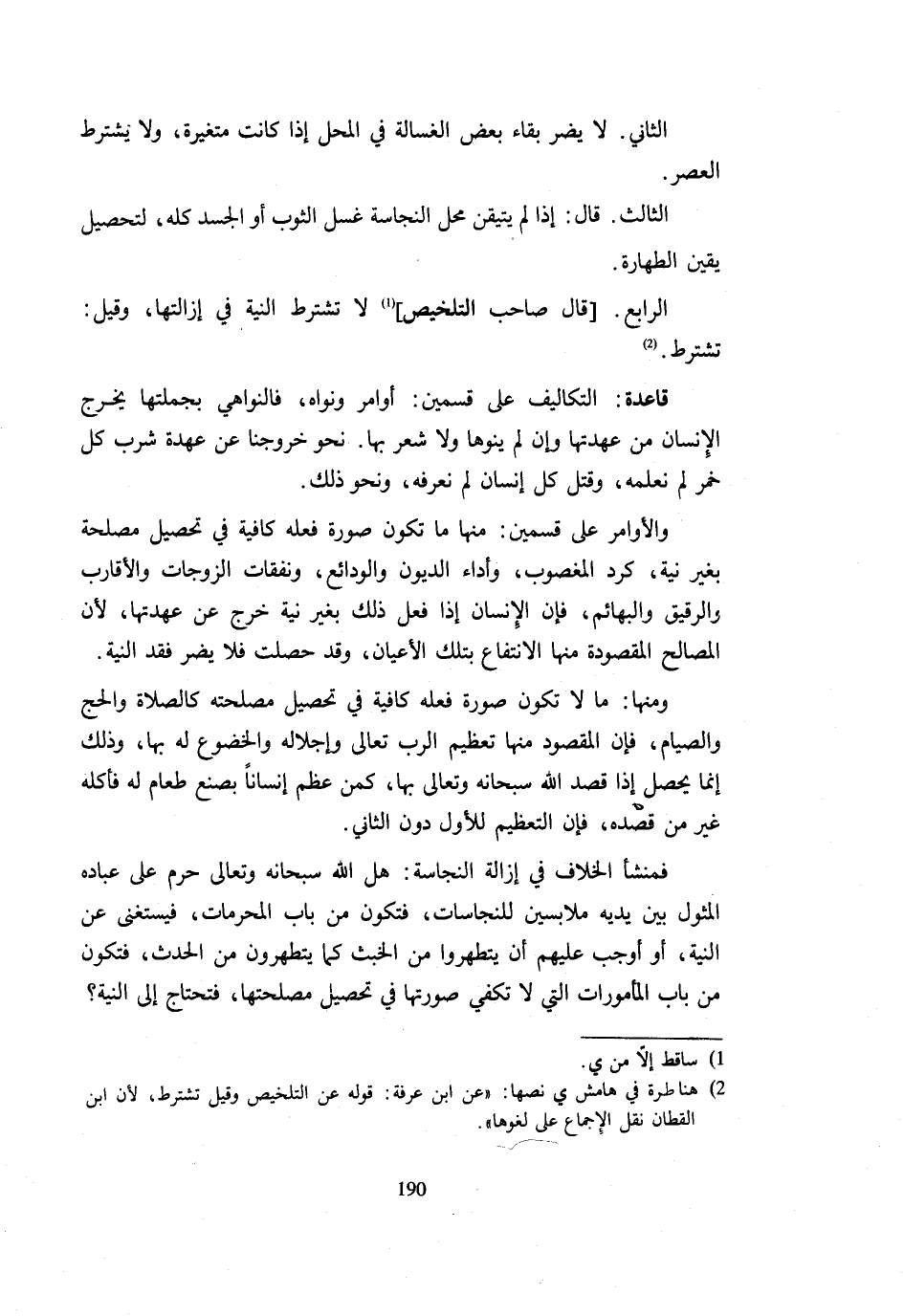 الثَّانِي لَا يَضُرُّ بَقَاءُ بَعْضِ الْغُسَالَةِ فِي الْمَحَلِّ إِذَا كَانَتْ مُتَغَيِّرَةً وَلَا يُشْتَرَطُ الْعَصْرُ الثَّالِثُ قَالَ إِذَا لَمْ يُتَيَقَّنْ مَحَلُّ النَّجَاسَةِ غُسِلَ الثَّوْبُ أَوِ الْجَسَدُ كُلُّهُ لِتَحْصِيلِ يَقِينِ الطَّهَارَةِ الرَّابِعُ قَالَ صَاحِبُ التَّلْخِيصِ لَا تُشْتَرَطُ النِّيَّةُ فِي إِزَالَتِهَا وَقِيلَ تُشْتَرَطُ قَاعِدَةٌ التَّكَالِيفُ عَلَى قِسْمَيْنِ أَوَامِرُ وَنَوَاهٍ فَالنَّوَاهِي بِجُمْلَتِهَا يَخْرُجُ الْإِنْسَانُ مِنْ عُهْدَتِهَا وَإِنْ لَمْ يَنْوِهَا وَلَا شَعَرَ بِهَا نَحْوَ خُرُوجِنَا عَنْ عُهْدَةِ شُرْبِ كُلِّ خَمْرٍ لَمْ نَعْلَمْهُ وَقَتْلِ كُلِّ إِنْسَانٍ لَمْ نَعْرِفْهُ وَنَحْوِ ذَلِكَ وَالْأَوَامِرُ عَلَى قِسْمَيْنِ مِنْهَا مَا تَكُونُ صُورَةُ فِعْلِهِ كَافِيَةً فِي تَحْصِيلِ مَصْلَحَةٍ بِغَيْرِ نِيَّةٍ كَرَدِّ الْمَغْصُوبِ وَأَدَاءِ الدُّيُونِ وَالْوَدَائِعِ وَنَفَقَاتِ الزَّوْجَاتِ وَالْأَقَارِبِ وَالرَّقِيقِ وَالْبَهَائِمِ فَإِنَّ الْإِنْسَانَ إِذَا فَعَلَ ذَلِكَ بِغَيْرِ نِيَّةٍ خرج عَن عهدتها لِأَن الْمصَالح المفصودة مِنْهَا الِانْتِفَاعُ بِتِلْكَ الْأَعْيَانِ وَقَدْ حَصَلَتْ فَلَا يَضُرُّ فَقْدُ النِّيَّةِ وَمِنْهَا مَا لَا تَكُونُ صُورَةُ فِعْلِهِ كَافِيَةً فِي تَحْصِيلِ مَصْلَحَةٍ كَالصَّلَاةِ وَالْحَجِّ وَالصِّيَامِ فَإِنَّ الْمَقْصُودَ مِنْهَا تَعْظِيمُ الرَّبِّ تَعَالَى وَإِجْلَالُهُ وَالْخُضُوعُ لَهُ بِهَا وَذَلِكَ إِنَّمَا يَحْصُلُ إِذَا قَصَدَ اللَّهَ سُبْحَانَهُ وَتَعَالَى بِهَا كَمَنْ عَظَّمَ إِنْسَانًا بِصُنْعِ طَعَامٍ لَهُ فَأَكَلَهُ غَيْرُ مَنْ قَصَدَهُ فَإِنَّ التَّعْظِيمَ لِلْأَوَّلِ دُونَ الثَّانِي فَمَنْشَأُ الْخِلَافِ فِي إِزَالَةِ النَّجَاسَةِ هَلِ اللَّهُ سُبْحَانَهُ وَتَعَالَى حَرَّمَ عَلَى عِبَادِهِ الْمُثُولَ بَيْنَ يَدَيْهِ مُلَابِسِينَ لِلنَّجَاسَاتِ فَتَكُونُ مِنْ بَابِ الْمُحَرَّمَاتِ فَيُسْتَغْنَى عَنِ النِّيَّةِ أَوْ أَوْجَبَ عَلَيْهِمْ أَنْ يَتَطَهَّرُوا مِنَ الْخَبَثِ كَمَا يَتَطَهَّرُونَ مِنَ الْحَدَثِ فَتَكُونُ مِنْ بَابِ الْمَأْمُورَاتِ الَّتِي لَا تَكْفِي صُورَتُهَا فِي تَحْصِيلِ مَصْلَحَتِهَا فَتَحْتَاجُ إِلَى النِّيَّة؟