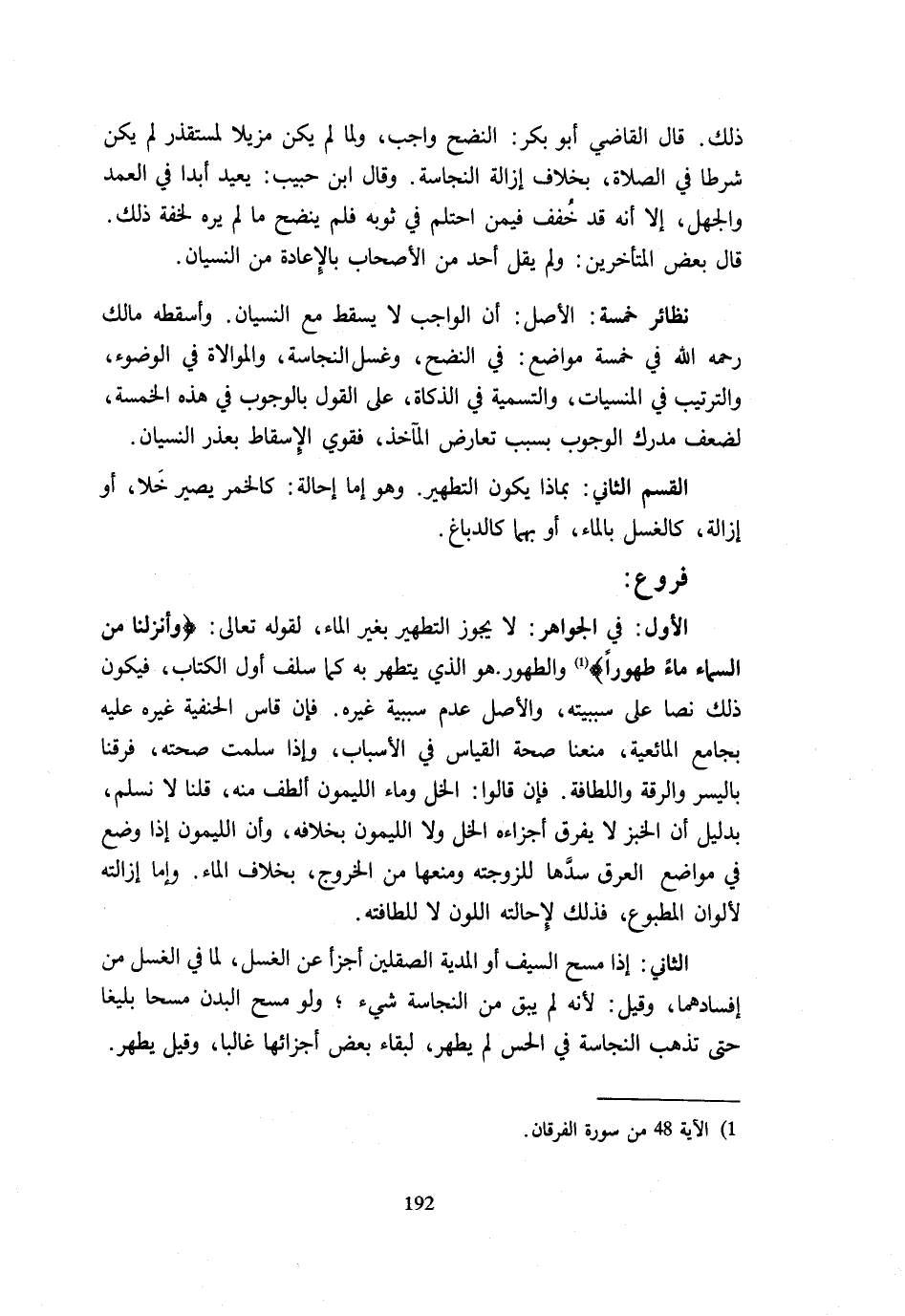 ذَلِكَ قَالَ الْقَاضِي أَبُو بَكْرٍ النَّضْحُ وَاجِبٌ وَلَمَّا لَمْ يَكُنْ مُزِيلًا لِمُسْتَقْذَرٍ لَمْ يَكُنْ شَرْطًا فِي الصَّلَاةِ بِخِلَافِ إِزَالَةِ النَّجَاسَةِ وَقَالَ ابْنُ حَبِيبٍ يُعِيدُ أَبَدًا فِي الْعَمْدِ وَالْجَهْلِ إِلَّا أَنَّهُ قَدْ خُفِّفَ فِيمَنِ احْتَلَمَ فِي ثَوْبِهِ فَلَمْ يَنْضَحْ مَا لَمْ يَرَهُ لِخِفَّةِ ذَلِكَ قَالَ بَعْضُ الْمُتَأَخِّرِينَ وَلَمْ يَقُلْ أَحَدٌ مِنَ الْأَصْحَابِ بِالْإِعَادَةِ مِنَ النِّسْيَانِ نَظَائِرُ خَمْسَةٌ الْأَصْلُ أَنَّ الْوَاجِبَ لَا يَسْقُطُ مَعَ النِّسْيَانِ وَأَسْقَطَهُ مَالِكٌ رَحِمَهُ اللَّهُ فِي خَمْسَةِ مَوَاضِعَ فِي النَّضْحِ وَغَسْلِ النَّجَاسَةِ وَالْمُوَالَاةِ فِي الْوُضُوءِ وَالتَّرْتِيبِ فِي الْمَنْسِيَّاتِ وَالتَّسْمِيَةِ فِي الذَّكَاةِ عَلَى الْقَوْلِ بِالْوُجُوبِ فِي هَذِهِ الْخَمْسَةِ لِضَعْفِ مَدْرَكِ الْوُجُوبِ بِسَبَبِ تَعَارُضِ الْمَآخِذِ فَقَوِيَ الْإِسْقَاطُ بِعُذْرِ النِّسْيَانِ الْقِسْمُ الثَّانِي بِمَاذَا يَكُونُ التَّطْهِيرُ وَهُوَ إِمَّا إِحَالَةٌ كَالْخَمْرِ يَصِيرُ خَلًّا أَوْ إِزَالَةٌ كَالْغَسْلِ بِالْمَاءِ أَوْ بِهِمَا كَالدِّبَاغِ فُرُوعٌ الْأَوَّلُ فِي الْجَوَاهِرِ لَا يَجُوزُ التَّطْهِيرُ بِغَيْرِ الْمَاءِ لِقَوْلِهِ تَعَالَى {وَأَنْزَلْنَا مِنَ السَّمَاءِ مَاءً طَهُورًا} وَالطَّهُورُ هُوَ الَّذِي يُتَطَهَّرُ بِهِ كَمَا سَلَفَ أَوَّلَ الْكِتَابِ فَيَكُونُ ذَلِكَ نَصًّا عَلَى سَبَبِيَّتِهِ وَالْأَصْلُ عَدَمُ سَبَبِيَّةِ غَيْرِهِ فَإِنْ قَاسَ الْحَنَفِيَّةُ غَيْرَهَ عَلَيْهِ بِجَامِعِ الْمَائِعِيَّةِ مَنَعْنَا صِحَّةَ الْقِيَاسِ فِي الْأَسْبَابِ وَإِذَا سَلِمَتْ صِحَّتُهُ فَرَّقْنَا بِالْيُسْرِ وَالرِّقَّةِ وَاللَّطَافَةِ فَإِنْ قَالُوا الْخَلُّ وَمَاءُ اللَّيْمُونِ أَلْطَفُ مِنْهُ قُلْنَا لَا نُسَلِّمُ بِدَلِيلِ أَنَّ الْخُبْزَ لَا يُفَرِّقُ أَجْزَاءَهُ الْخَلُّ وَلَا اللَّيْمُونُ بِخِلَافِهِ وَأَنَّ اللَّيْمُونَ إِذَا وُضِعَ فِي مَوَاضِعِ الْعَرَقِ سَدَّهَا لِلُزُوجَتِهِ وَمَنَعَهَا مِنَ الْخُرُوجِ بِخِلَافِ الْمَاءِ وَإِمَّا إِزَالَتُهُ لِأَلْوَانِ الْمَطْبُوعِ فَذَلِكَ لِإِحَالَتِهِ اللَّوْنَ لَا لِلَطَافَتِهِ الثَّانِي إِذَا مَسَحَ السَّيْفَ أَوِ الْمُدْيَةَ الصَّقِلَيْنِ أَجْزَأَ عَنِ الْغَسْلِ لِمَا فِي الْغَسْلِ مِنْ إِفْسَادِهِمَا وَقِيلَ لِأَنَّه لَمْ يَبْقَ مِنَ النَّجَاسَةِ شَيْءٌ وَلَوْ مَسَحَ الْبَدَنَ مَسْحًا بَلِيغًا حَتَّى تَذْهَبَ النَّجَاسَةُ فِي الْحِسِّ لَمْ يَطْهُرْ لِبَقَاءِ بَعْضِ أَجْزَائِهَا غَالِبًا وَقِيلَ يطهر