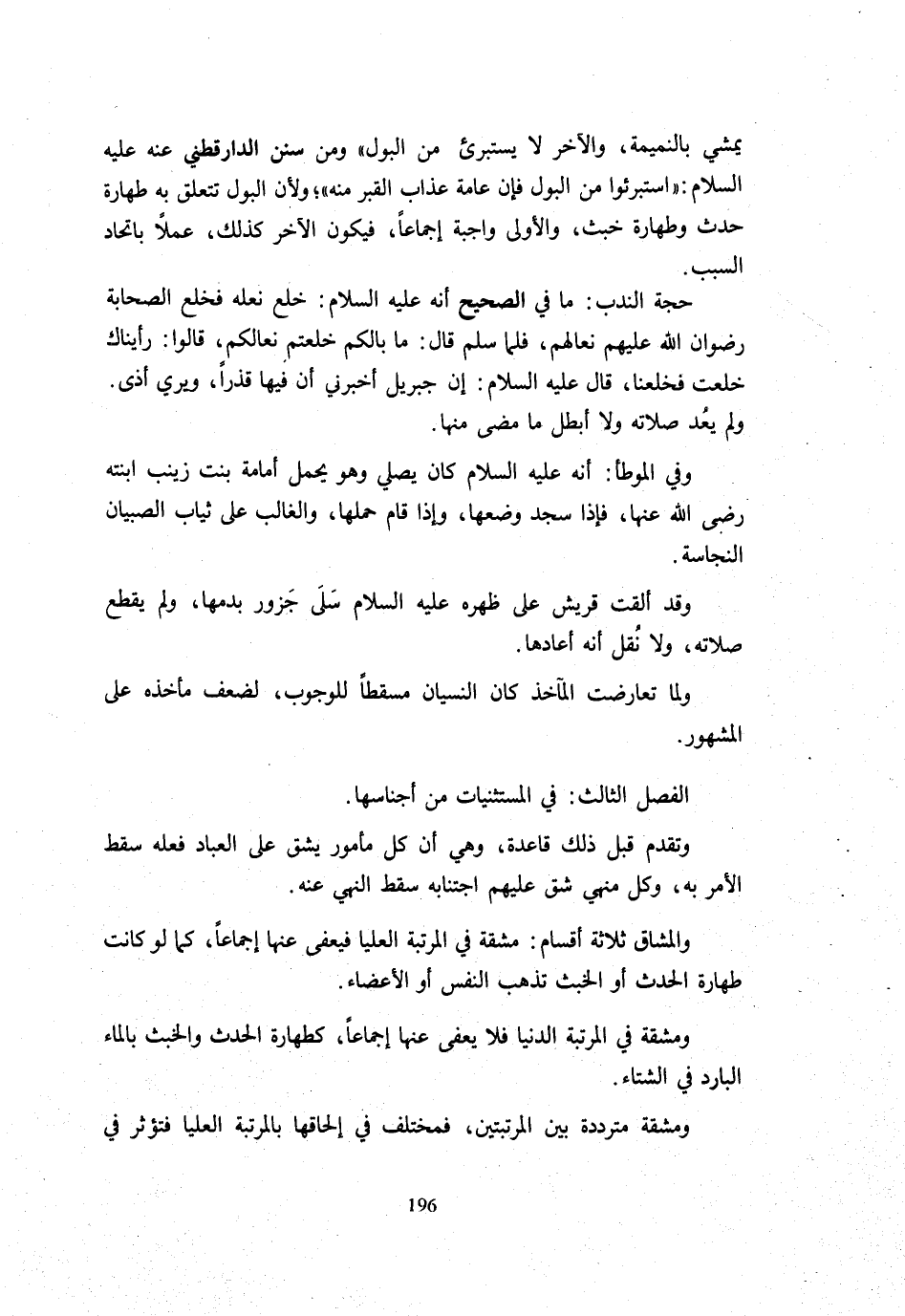 وَلِأَنَّ الْبَوْلَ تَتَعَلَّقُ بِهِ طَهَارَةُ حَدَثٍ وَطَهَارَةُ خَبَثٍ وَالْأُولَى وَاجِبَةٌ إِجْمَاعًا فَيَكُونُ الْآخَرُ كَذَلِكَ عَمَلًا بِاتِّحَادِ السَّبَبِ حُجَّةُ النَّدْبِ مَا فِي الصَّحِيحِ أَنَّهُ عَلَيْهِ السَّلَامُ خَلَعَ نَعْلَهُ فَخَلَعَ الصَّحَابَةُ رِضْوَانُ اللَّهِ عَلَيْهِمْ نِعَالَهُمْ فَلَمَّا سَلَّمَ قَالَ مَا بَالُكُمْ خَلَعْتُمْ نِعَالَكُمْ قَالُوا رَأَيْنَاكَ خَلَعْتَ فَخَلَعْنَا قَالَ عَلَيْهِ السَّلَامُ إِن جِبْرِيل أَخْبرنِي أَن فِيهَا قذرا وَيرى أَذًى وَلَمْ يُعِدْ صَلَاتَهُ وَلَا أَبْطَلَ مَا مَضَى مِنْهَا وَفِي الْمُوَطَّأِ أَنَّهُ عَلَيْهِ السَّلَامُ كَانَ يُصَلِّي وَهُوَ يَحْمِلُ أُمَامَةَ بِنْتَ زَيْنَبَ ابْنَتَهُ رَضِيَ اللَّهُ عَنْهَا فَإِذَا سَجَدَ وَضَعَهَا وَإِذَا قَامَ حَمَلَهَا وَالْغَالِبُ عَلَى ثِيَابِ الصِّبْيَانِ النَّجَاسَةُ وَقَدْ أَلْقَتْ قُرَيْشٌ عَلَى ظَهْرِهِ عَلَيْهِ السَّلَامُ سَلَى جَزُورٍ بِدَمِهَا وَلَمْ يَقْطَعْ صَلَاتَهُ وَلَا نُقِلَ أَنَّهُ أَعَادَهَا وَلَمَّا تَعَارَضَتِ الْمَآخِذُ كَانَ النِّسْيَانُ مُسْقِطًا لِلْوُجُوبِ لِضَعْفِ مَأْخَذِهِ عَلَى الْمَشْهُورِ الْفَصْلُ الثَّالِثُ فِي الْمُسْتَثْنَيَاتِ مِنْ أَجْنَاسِهَا وَتَقَدَّمَ قَبْلَ ذَلِكَ قَاعِدَةٌ وَهِيَ أَنَّ كُلَّ مَأْمُورٍ يَشُقُّ عَلَى الْعِبَادِ فِعْلُهُ سَقَطَ الْأَمْرُ بِهِ وَكُلَّ مَنْهِيٍّ شَقَّ عَلَيْهِمُ اجْتِنَابُهُ سَقَطَ النَّهْيُ عَنْهُ وَالْمَشَاقُّ ثَلَاثَةُ أَقْسَامٍ مَشَقَّةٌ فِي الْمَرْتَبَةِ الْعُلْيَا فَيُعْفَى عَنْهَا إِجْمَاعًا كَمَا لَوْ كَانَتْ طَهَارَةُ الْحَدَثِ أَوِ الْخَبَثِ تُذْهِبُ النَّفْسَ أَوِ الْأَعْضَاءَ وَمَشَقَّةٌ فِي الْمَرْتَبَةِ الدُّنْيَا فَلَا يُعْفَى عَنْهَا إِجْمَاعًا كَطَهَارَةِ الْحَدَثِ وَالْخَبَثِ بِالْمَاءِ الْبَارِدِ فِي الشِّتَاءِ وَمَشَقَّةٌ مُتَرَدِّدَةٌ بَيْنَ الْمَرْتَبَتَيْنِ فَمُخْتَلَفٌ فِي إِلْحَاقِهَا بِالْمَرْتَبَةِ الْعُلْيَا فَتُؤَثِّرُ فِي