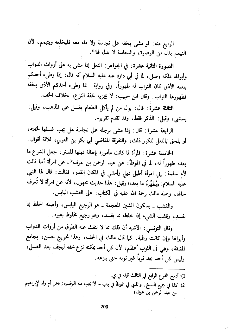 الرَّابِعُ مِنْهُ لَوْ مَشَى بِخُفِّهِ عَلَى نَجَاسَةٍ وَلَا مَاءَ مَعَهُ فَلْيَخْلَعْهُ وَيَتَيَمَّمْ لِأَنَّ التَّيَمُّمَ بَدَلٌ مِنَ الْوُضُوءِ وَالنَّجَاسَةُ لَا بَدَلَ لَهَا الصُّورَةُ الثَّانِيَةَ عَشْرَةَ فِي الْجَوَاهِرِ النَّعْلُ إِذَا مَشَى بِهِ عَلَى أَرْوَاثِ الدَّوَابِّ وَأَبْوَالِهَا دَلَّكَهُ وَصَلَّى لِمَا فِي أَبِي دَاوُدَ عَنْهُ عَلَيْهِ السَّلَام أَنه قَالَ إِذا وطىء أَحَدُكُمْ بِنَعْلِهِ الْأَذَى كَانَ التُّرَابُ لَهُ طَهُورًا وَفِي رِوَايَةٍ إِذَا وَطِئَ أَحَدُكُمُ الْأَذَى بِخُفِّهِ فَطَهُورُهَا التُّرَابُ وَقَالَ ابْنُ حَبِيبٍ لَا يَجْزِيه لِخِفَّةِ النَّزْعِ بِخِلَافِ الْخُفِّ الثَّالِثَةَ عَشْرَةَ قَالَ بَوْلُ مَنْ لَمْ يَأْكُلِ الطَّعَامَ يُغْسَلُ عَلَى الْمَذْهَبِ وَقِيلَ يُسْتَثْنَى وَقِيلَ الذَّكَرُ فَقَطْ وَقَدْ تَقَدَّمَ تَقْرِيرُهُ الرَّابِعَةَ عَشْرَةَ قَالَ إِذَا مَشَى بِرِجْلِهِ عَلَى نَجَاسَةٍ هَلْ يَجِبُ غَسْلُهَا لِخِفَّتِهِ أَوْ يَلْحَقُ بِالنَّعْلِ لِتَكَرُّرِ ذَلِكَ وَالتَّفْرِقَةُ لِلْقَاضِي أَبِي بَكْرِ بْنِ الْعَرَبِيِّ ثَلَاثَةُ أَقْوَالٍ الْخَامِسَةَ عَشْرَةَ الْمَرْأَةُ لَمَّا كَانَتْ مَأْمُورَةً بِإِطَالَةِ ذَيْلِهَا لِلسَّتْرِ جَعْلَ الشَّرْعُ مَا بَعْدَهُ طَهُورًا لَهُ لِمَا فِي الْمُوَطَّأِ عَنْ عَبْدِ الرَّحْمَنِ بْنِ عَوْفٍ عَنِ امْرَأَةٍ أَنَّهَا قَالَتْ لِأُمِّ سَلَمَةَ إِنِّي امْرَأَةٌ أُطِيلُ ذَيْلِي وَأَمْشِي فِي الْمَكَانِ الْقَذِرِ فَقَالَتْ قَالَ لَهَا النَّبِيُّ عَلَيْهِ السَّلَامُ