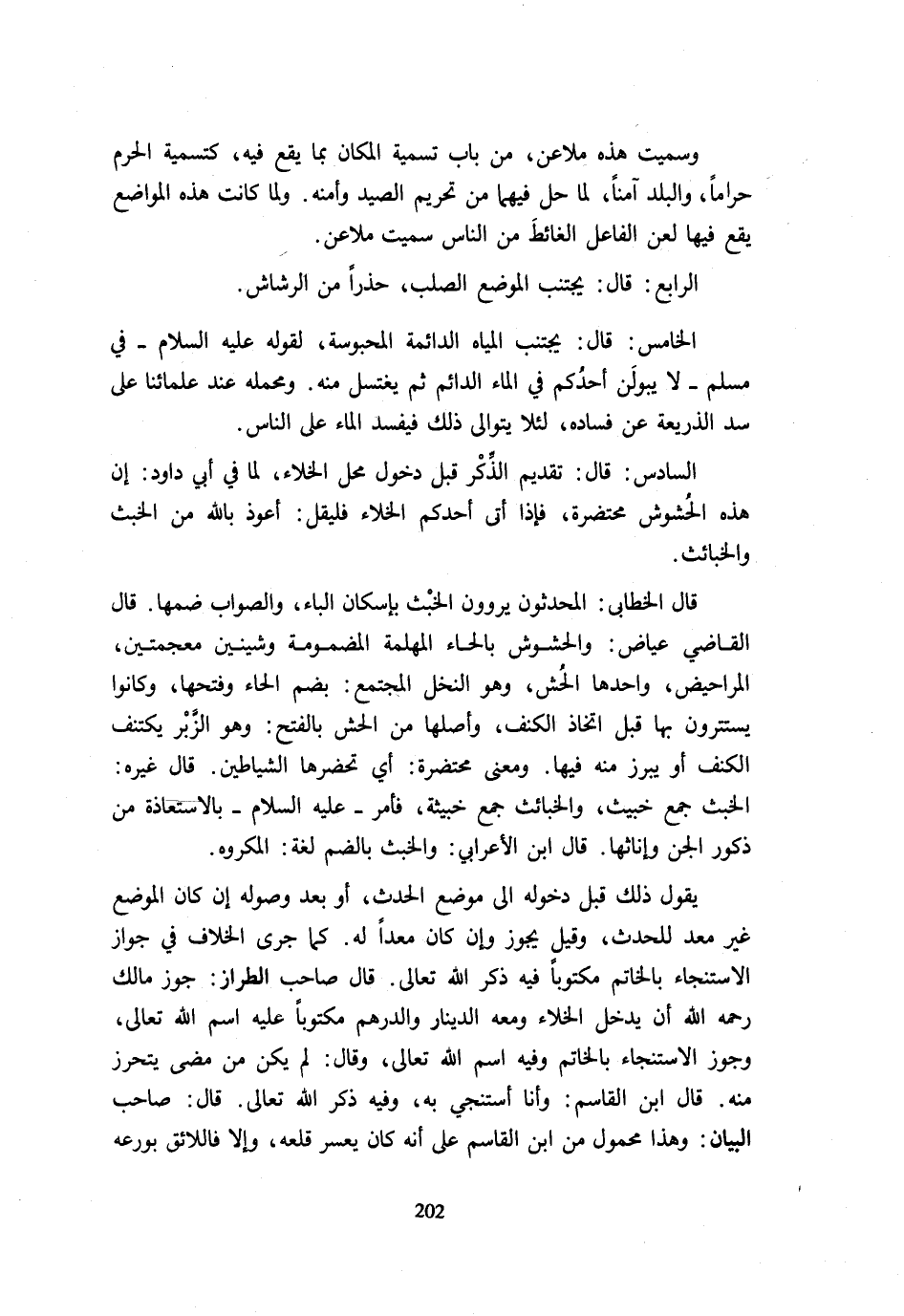 وَسُمِّيَتْ هَذِهِ مَلَاعِنَ مِنْ بَابِ تَسْمِيَةِ الْمَكَانِ بِمَا يَقَعُ فِيهِ كَتَسْمِيَةِ الْحَرَمِ حَرَامًا وَالْبَلَدِ آمِنًا لِمَا حَلَّ فِيهِمَا مِنْ تَحْرِيمِ الصَّيْدِ وَأَمْنِهِ وَلَمَّا كَانَتْ هَذِهِ الْمَوَاضِعُ يَقَعُ فِيهَا لَعْنُ الْفَاعِلِ الْغَائِطِ مِنَ النَّاسِ سُمِّيَتْ مَلَاعِنَ الرَّابِعُ قَالَ يَجْتَنِبُ الْمَوْضِعَ الصُّلْبَ حَذَرًا مِنَ الرَّشَاشِ الْخَامِسُ قَالَ يَجْتَنِبُ الْمِيَاهَ الدَّائِمَةَ الْمَحْبُوسَةَ لِقَوْلِهِ عَلَيْهِ السَّلَامُ فِي مُسْلِمٍ