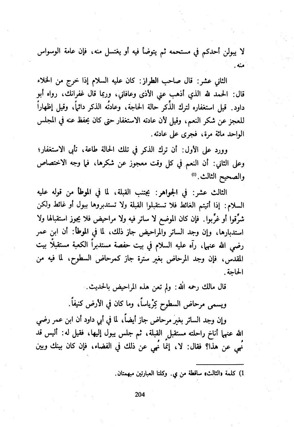 لَا يَبُولَنَّ أَحَدُكُمْ فِي مُسْتَحَمِّهِ ثُمَّ يَتَوَضَّأَ فِيهِ أَوْ يَغْتَسِلَ مِنْهُ فَإِنَّ عَامَّةَ الْوَسْوَاسِ مِنْهُ الثَّانِي عَشَرَ قَالَ صَاحِبُ الطَّرَّازِ كَانَ عَلَيْهِ السَّلَامُ إِذَا خَرَجَ مِنَ الْخَلَاءِ قَالَ الْحَمْدُ لِلَّهِ الَّذِي أَذْهَبَ عَنِّي الْأَذَى وَعَافَانِي وَرُبَّمَا قَالَ غُفْرَانَكَ رَوَاهُ أَبُو دَاوُدَ قِيلَ اسْتِغْفَارُهُ لِتَرْكِ الذِّكْرِ حَالَةَ الْحَاجَةِ وَعَادَتُهُ الذِّكْرُ دَائِمًا وَقِيلَ إِظْهَارًا لِلْعَجْزِ عَنْ شُكْرِ النِّعَمِ وَقِيلَ لِأَنَّ عَادَتَهُ الِاسْتِغْفَارُ حَتَّى كَانَ يُحْفَظُ عَنْهُ فِي الْمَجْلِسِ الْوَاحِدِ مِائَةُ مَرَّةٍ فَجَرَى عَلَى عَادَتِهِ وَوَرَدَ عَلَى الْأَوَّلِ أَنَّ تَرْكَ الذِّكْرِ فِي تِلْكَ الْحَالَةِ طَاعَةٌ تَأْبَى الِاسْتِغْفَارَ وَعَلَى الثَّانِي أَنَّ النِّعَمَ فِي كُلِّ وَقْتٍ مَعْجُوزٌ عَنْ شُكْرِهَا فَمَا وَجْهُ الِاخْتِصَاصِ وَالصَّحِيحُ الثَّالِثُ الثَّالِثَ عَشَرَ فِي الْجَوَاهِرِ يَجْتَنِبُ الْقِبْلَةَ لِمَا فِي الْمُوَطَّأِ مِنْ قَوْلِهِ عَلَيْهِ السَّلَامُ إِذَا أَتَيْتُمُ الْغَائِطَ فَلَا تَسْتَقْبِلُوا الْقِبْلَةَ وَلَا تَسْتَدْبِرُوهَا بِبَوْلٍ أَوْ غَائِطٍ وَلَكِنْ شَرِّقُوا أَوْ غَرِّبُوا فَإِنْ كَانَ الْمَوْضِعُ لَا سَاتِرَ فِيهِ وَلَا مَرَاحِيضَ فَلَا يَجُوزُ اسْتِقْبَالُهَا وَلَا اسْتِدْبَارُهَا وَإِنْ وُجِدَ السَّاتِرُ وَالْمَرَاحِيضُ جَازَ ذَلِكَ لِمَا فِي الْمُوَطَّأِ أَنَّ ابْنَ عُمَرَ رَضِيَ اللَّهُ عَنْهُمَا رَآهُ عَلَيْهِ السَّلَامُ فِي بَيْتِ حَفْصَةَ مُسْتَدْبِرًا الْكَعْبَةَ مُسْتَقْبِلًا بَيْتَ الْمَقْدِسِ فَإِنْ وُجِدَ المرحاض بِغَيْر ستْرَة كَمِرْحَاضِ السُّطُوحِ لِمَا فِيهِ مِنَ الْحَاجَةِ قَالَ مَالِكٌ رَحِمَهُ اللَّهُ وَلَمْ تُعْنَ هَذِهِ الْمَرَاحِيضُ بِالْحَدِيثِ وَيُسَمَّى مِرْحَاضُ السُّطُوحِ كِرْيَاسًا وَمَا كَانَ فِي الْأَرْضِ كَنِيفًا وَإِنْ وُجِدَ السَّاتِرُ بِغَيْرِ مِرْحَاضٍ جَازَ أَيْضًا لِمَا فِي أَبِي دَاوُدَ أَنَّ ابْنَ عُمَرَ رَضِيَ اللَّهُ عَنْهُمَا أَنَاخَ رَاحِلَتَهُ مُسْتَقْبِلَ الْقِبْلَةِ ثُمَّ جَلَسَ يَبُولُ إِلَيْهَا فَقِيلَ لَهُ أَلَيْسَ قَدْ نُهِيَ عَنْ هَذَا فَقَالَ لَا إِنَّمَا نُهِيَ عَنْ ذَلِكَ فِي الْفَضَاءِ فَإِنْ كَانَ بَيْنَكَ وَبَيْنَ