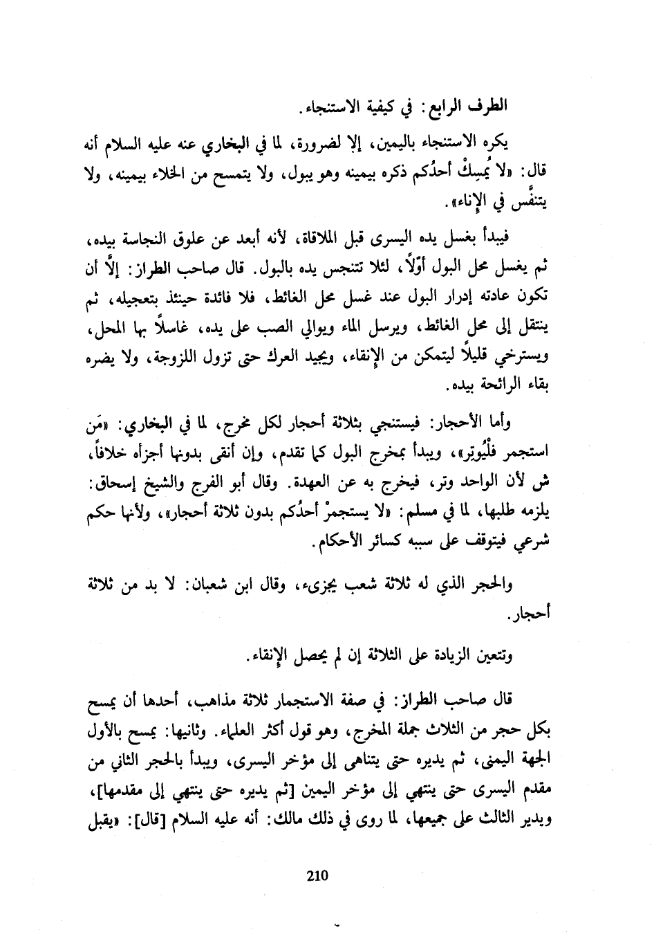 الطّرف الرَّابِع فِي كَيْفيَّة الِاسْتِنْجَاء يُكْرَهُ الِاسْتِنْجَاءُ بِالْيَمِينِ إِلَّا لِضَرُورَةٍ لِمَا فِي الْبُخَارِيِّ عَنْهُ عَلَيْهِ السَّلَامُ أَنَّهُ قَالَ