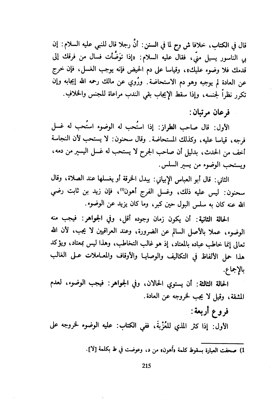 وَقِيَاسًا عَلَى دَمِ الْحَيْضِ فَإِنَّهُ يُوجِبُ الْغُسْلَ فَإِنْ خَرَجَ عَنِ الْعَادَةِ لَمْ يُوجِبْهُ وَهُوَ دَمُ الِاسْتِحَاضَةِ وَرُوِيَ عَنْ مَالِكٍ رَحِمَهُ اللَّهُ إِيجَابُهُ وَإِنْ تَكَرَّرَ نَظَرًا لِجِنْسِهِ وَإِذَا سَقَطَ الْإِيجَابُ بَقِيَ النَّدْبُ وَمُرَاعَاةً لِلْجِنْسِ وَالْخِلَافِ فَرْعَانِ مُرَتَّبَانِ الْأَوَّلُ قَالَ صَاحِبُ الطَّرَّازِ إِذَا اسْتُحِبَّ لَهُ الْوُضُوءُ اسْتُحِبَّ لَهُ غَسْلُ فَرْجِهِ قِيَاسًا عَلَيْهِ وَكَذَلِكَ الْمُسْتَحَاضَةُ وَقَالَ سُحْنُونُ لَا يُسْتَحَبُّ لِأَنَّ النَّجَاسَةَ أَخَفُّ مِنَ الْحَدَثِ بِدَلِيلِ أَنَّ صَاحِبَ الْجَرْحِ لَا يُسْتَحَبُّ لَهُ غَسْلُ الْيَسِيرِ مِنْ دَمِهِ وَيُسْتَحَبُّ الْوُضُوءُ مِنْ يَسِيرِ السَّلَسِ الثَّانِي قَالَ أَبُو الْعَبَّاسِ الْإِبْيَانِيُّ يُبَدِّلُ الْخِرْقَةَ أَوْ يَغْسِلُهَا عِنْدَ الصَّلَاةِ وَقَالَ سُحْنُونُ لَيْسَ عَلَيْهِ ذَلِكَ وَغَسْلُ الْفَرْجِ أَهْوَنُ فَإِنَّ زَيْدَ بْنَ ثَابِتٍ رَضِيَ اللَّهُ عَنْهُ كَانَ بِهِ سَلَسُ الْبَوْلِ حِينَ كَبِرَ وَمَا كَانَ يَزِيدُ عَنِ الْوُضُوءِ الْحَالَةُ الثَّانِيَةُ أَنْ يَكُونَ زَمَانُ وُجُودِهِ أَقَلَّ وَفِي الْجَوَاهِرِ فَيَجِبُ مِنْهُ الْوُضُوءُ عَمَلًا بِالْأَصْلِ السَّالِمِ عَنِ الضَّرُورَةِ وَعِنْدَ الْعِرَاقِيِّينَ لَا يَجِبْ لِأَنَّ اللَّهَ تَعَالَى إِنَّمَا خَاطَبَ عِبَادَهُ بِالْمُعْتَادِ إِذْ هُوَ غَالِبُ التَّخَاطُبِ وَهَذَا لَيْسَ بِمُعْتَادٍ وَيُؤَكِّدُ هَذَا حَمْلُ الْأَلْفَاظِ فِي التَّكَالِيفِ وَالْوَصَايَا وَالْأَوْقَافِ وَالْمُعَامَلَاتِ عَلَى الْغَالِبِ بِالْإِجْمَاعِ الْحَالَةُ الثَّالِثَةُ أَنْ يَسْتَوِيَ الْحَالَانِ وَفِي الْجَوَاهِرِ فَيَجِبُ الْوُضُوءُ لِعَدَمِ الْمَشَقَّةِ وَقِيلَ لَا يَجِبُ لِخُرُوجِهِ عَن الْعَادة فروع أَرْبَعَة الْأَوَّلُ إِذَا كَثُرَ الْمَذْيُ لِلْعُزْبَةِ فَفِي الْكِتَابِ عَلَيْهِ الْوُضُوءُ لِخُرُوجِهِ عَلَى