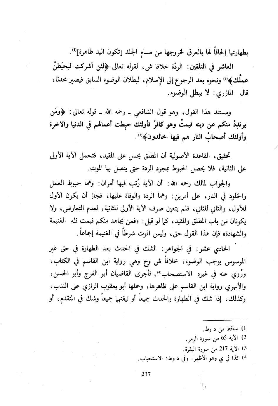 بِطَهَارَتِهَا إِلْحَاقًا لَهَا بِالْعَرَقِ لِخُرُوجِهَا مِنْ مَسَامِّ الْجِلْدِ تَكُونُ الْيَدُ طَاهِرَةً الْعَاشِرُ فِي التَّلْقِينِ الرِّدَّةُ خِلَافًا ش لِقَوْلِهِ تَعَالَى {لَئِنْ أَشْرَكْتَ ليحبطن عَمَلك} وَنَحْوِهِ بَعْدَ الرُّجُوعِ إِلَى الْإِسْلَامِ لِبُطْلَانِ الْوُضُوءِ السَّابِقِ فَيَصِيرُ مُحْدِثًا قَالَ الْمَازِرِيُّ لَا يَبْطُلُ الْوضُوء ومستند هَذَا القَوْل وَهُوَ قَول الشَّافِعِي رَحمَه الله قَوْله تَعَالَى {وَمن يرْتَد مِنْكُمْ عَنْ دِينِهِ فَيَمُتْ وَهُوَ كَافِرٌ فَأُولَئِكَ حَبِطَتْ أَعْمَالُهُمْ فِي الدُّنْيَا وَالآخِرَةِ وَأُولَئِكَ أَصْحَابُ النَّار هم فِيهَا خَالدُونَ} تَحْقِيقٌ الْقَاعِدَةُ الْأُصُولِيَّةُ أَنَّ الْمُطْلَقَ يُحْمَلُ عَلَى الْمُقَيَّدِ فَتُحْمَلُ الْآيَةُ الْأُولَى عَلَى الثَّانِيَةِ فَلَا يَحْصُلُ الْحُبُوطُ بِمُجَرَّدِ الرِّدَّةِ حَتَّى يَتَّصِلَ بِهَا الْمَوْتُ وَالْجَوَابُ لِمَالِكٍ رَحِمَهُ اللَّهُ أَنَّ الْآيَةَ رُتِّبَ فِيهَا أَمْرَانِ وَهُمَا حُبُوطُ الْعَمَلِ وَالْخُلُودُ فِي النَّارِ عَلَى أَمْرَيْنِ وَهُمَا الرِّدَّةُ وَالْوَفَاةُ عَلَيْهَا فَجَازَ أَنْ يَكُونَ الْأَوَّلُ لِلْأَوَّلِ وَالثَّانِي لِلثَّانِي فَلَمْ يَتَعَيَّنْ صَرْفُ الْآيَةِ الْأُولَى لِلثَّانِيَةِ لِعَدَمِ التَّعَارُضِ وَلَا يَكُونَانِ مِنْ بَابِ الْمُطْلَقِ وَالْمُقَيَّدِ كَمَا لَوْ قِيلَ