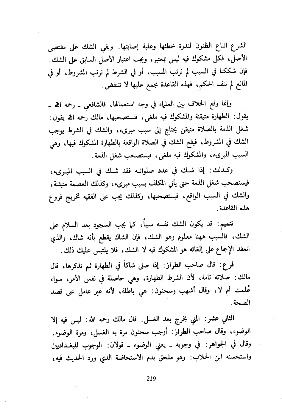 الشَّرْعُ اتِّبَاعَ الظُّنُونِ لِنُدْرَةِ خَطَئِهَا وَغَلَبَةِ إِصَابَتِهَا وَبَقِيَ الشَّكُّ عَلَى مُقْتَضَى الْأَصْلِ فَكُلُّ مَشْكُوكٍ فِيهِ لَيْسَ بِمُعْتَبَرٍ وَيَجِبُ اعْتِبَارُ الْأَصْلِ السَّابِقِ عَلَى الشَّكِّ فَإِنْ شَكَكْنَا فِي السَّبَبِ لَمْ نُرَتِّبِ الْمُسَبَّبَ أَوْ فِي الشَّرْطِ لَمْ نُرَتِّبِ الْمَشْرُوطَ أَوْ فِي الْمَانِعِ لَمْ نَنْفِ الْحُكْمَ فَهَذِهِ الْقَاعِدَةُ مُجْمَعٌ عَلَيْهَا لَا تَنْتَقِضُ وَإِنَّمَا وَقَعَ الْخِلَافُ بَيْنَ الْعُلَمَاءِ فِي وَجْهِ اسْتِعْمَالِهَا فالشافعي رَحمَه الله يَقُولُ الطَّهَارَةُ مُتَيَقَّنَةٌ وَالْمَشْكُوكُ فِيهِ مُلْغًى فَنَسْتَصْحِبُهَا مَالك رَحِمَهُ اللَّهُ يَقُولُ شُغْلُ الذِّمَّةِ بِالصَّلَاةِ مُتَيَقَّنٌ يحْتَاج إِلَى سَبَب مبرىء وَالشَّكُّ فِي الشَّرْطِ يُوجِبُ الشَّكَّ فِي الْمَشْرُوطِ فَيَقَعُ الشَّكُّ فِي الصَّلَاةِ الْوَاقِعَةِ بِالطَّهَارَةِ الْمَشْكُوكِ فِيهَا وَهِي السَّبَب المبرىء وَالْمَشْكُوكُ فِيهِ مُلْغًى فَيَسْتَصْحِبُ شُغْلَ الذِّمَّةِ وَكَذَلِكَ إِذَا شَكَّ فِي عَدَدِ صَلَوَاتِهِ فَقَدْ شَكَّ فِي السَّبَب المبرىء فَيَسْتَصْحِبُ شُغْلَ الذِّمَّةِ حَتَّى يَأْتِيَ الْمُكَلَّفُ بِسَبَبٍ مبرىء وَكَذَلِكَ الْعِصْمَةُ مُتَيَقَّنَةٌ وَالشَّكُّ فِي السَّبَبِ الْوَاقِعِ فَيَسْتَصْحِبُهَا وَكَذَلِكَ يَجِبُ عَلَى الْفَقِيهِ تَخْرِيجُ فُرُوعِ هَذِهِ الْقَاعِدَةِ تَتْمِيمٌ قَدْ يَكُونُ الشَّكُّ نَفْسُهُ سَبَبًا كَمَا يَجِبُ السُّجُودُ بَعْدَ السَّلَامِ عَلَى الشَّك فالسبب هَهُنَا مَعْلُومٌ وَهُوَ الشَّكُّ فَإِنَّ الشَّاكَّ يَقْطَعُ بِأَنَّهُ شَاكٌّ وَالَّذِي انْعَقَدَ الْإِجْمَاعُ عَلَى إِلْغَائِهِ هُوَ الْمَشْكُوكُ فِيهِ لَا الشَّكُّ فَلَا يَلْتَبِسْ عَلَيْكَ ذَلِكَ فَرْعٌ قَالَ صَاحِبُ الطَّرَّازِ إِذَا صَلَّى شَاكًّا فِي الطَّهَارَةِ ثُمَّ تَذَكَّرَهَا قَالَ مَالِكٌ صَلَاتُهُ تَامَّةٌ لِأَنَّ الشَّرْطَ الطَّهَارَةُ وَهِيَ حَاصِلَةٌ فِي نَفْسِ الْأَمْرِ سَوَاءٌ عُلِمَتْ أَمْ لَا وَقَالَ الْأَشْهَبُ وَسَحْنُونُ هِيَ بَاطِلَةٌ لِأَنَّه غَيْرُ عَامِلٍ عَلَى قَصْدِ الصِّحَّةِ الثَّانِي عَشَرَ الْمَنِيُّ يَخْرُجُ بَعْدَ الْغَسْلِ قَالَ مَالِكٌ رَحِمَهُ اللَّهُ لَيْسَ فِيهِ إِلَّا الْوُضُوءُ وَقَالَ صَاحِبُ الطَّرَّازِ أَوْجَبَ سُحْنُونُ مَرَّةً بِهِ الْغَسْلَ وَمَرَّةً الْوُضُوءَ وَقَالَ فِي الْجَوَاهِرِ فِي وُجُوبِهِ يَعْنِي الْوُضُوءَ قَوْلَانِ الْوُجُوبُ لِلْبَغْدَادِيِّينَ وَاسْتَحْسَنَهُ ابْنُ الْجَلَّابِ وَهُوَ مُلْحَقٌ بِدَمِ الِاسْتِحَاضَةِ الَّذِي وَرَدَ الْحَدِيثُ فِيهِ