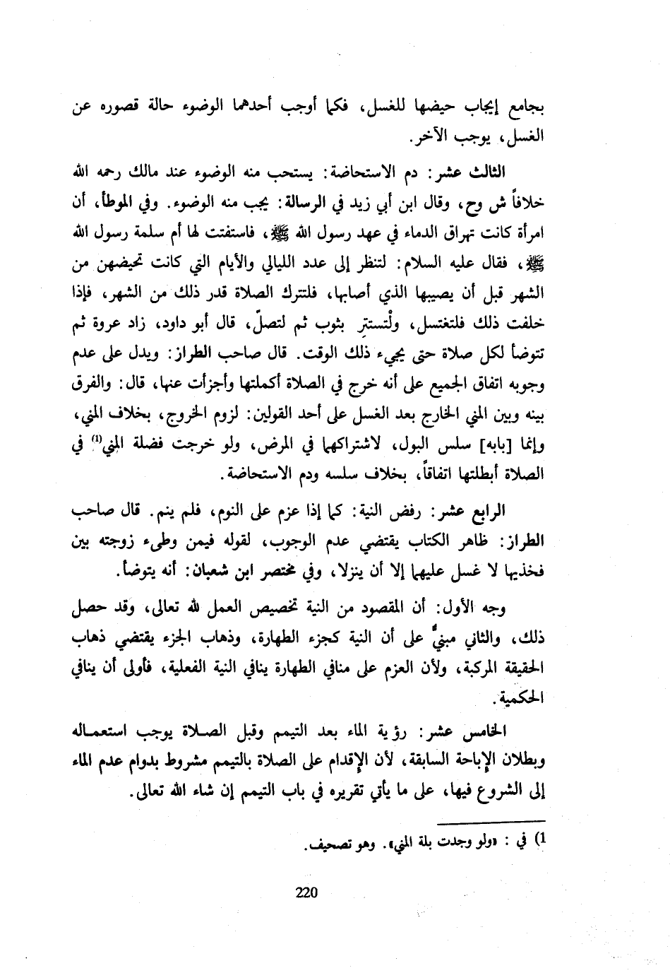 بِجَامِعِ إِيجَابِ حَيْضِهَا لِلْغُسْلِ فَكَمَا أَوْجَبَ أَحَدُهُمَا الْوُضُوءَ حَالَةَ قُصُورِهِ عَنِ الْغُسْلِ يُوجِبُ الْآخَرُ الثَّالِثَ عَشَرَ دَمُ الِاسْتِحَاضَةِ يُسْتَحَبُّ مِنْهُ الْوُضُوءُ عِنْد مَالك رَحمَه الله خلافًا ش وح وَقَالَ ابْنُ أَبِي زَيْدٍ فِي الرِّسَالَةِ يَجِبُ مِنْهُ الْوُضُوءُ وَفِي الْمُوَطَّأِ أَنَّ امْرَأَةً كَانَتْ تَهْرَاقُ الدِّمَاءَ فِي عَهْدِ رَسُولِ اللَّهِ - صَلَّى اللَّهُ عَلَيْهِ وَسَلَّم َ - فَاسْتَفْتَتْ لَهَا أُمُّ سَلَمَةَ رَسُولَ اللَّهِ - صَلَّى اللَّهُ عَلَيْهِ وَسَلَّم َ - فَقَالَ عَلَيْهِ السَّلَامُ لِتَنْظُرْ إِلَى عَدَدِ اللَّيَالِي وَالْأَيَّامِ الَّتِي كَانَتْ تَحِيضُهُنِّ مِنَ الشَّهْرِ قَبْلَ أَنْ يُصِيبَهَا الَّذِي أَصَابَهَا فَلْتَتْرُكِ الصَّلَاةَ قَدْرَ ذَلِكَ مِنَ الشَّهْرِ فَإِذَا خَلَّفَتْ ذَلِكَ فَلْتَغْتَسِلْ وَلْتَسْتَتِرْ بِثَوْبٍ ثُمَّ لِتُصَلِّ قَالَ أَبُو دَاوُدَ زَادَ عُرْوَةُ ثُمَّ تَتَوَضَّأْ لِكُلِّ صَلَاةٍ حَتَّى يَجِيءَ ذَلِكَ الْوَقْتُ قَالَ صَاحِبُ الطَّرَّازِ وَيَدُلُّ عَلَى عَدَمِ وُجُوبِهِ اتِّفَاقُ الْجَمِيعِ عَلَى أَنَّهُ خَرَجَ فِي الصَّلَاةِ أَكْمَلَتْهَا وَأَجْزَأَتْ عَنْهَا قَالَ وَالْفَرْقُ بَيْنَهُ وَبَيْنَ الْمَنِيِّ الْخَارِجِ بَعْدَ الْغَسْلِ عَلَى أَحَدِ الْقَوْلَيْنِ لُزُومُ الْخُرُوجِ بِخِلَافِ الْمَنِيِّ وَإِنَّمَا بَابُهُ سَلَسُ الْبَوْلِ لِاشْتِرَاكِهِمَا فِي الْمَرَضِ وَلَوْ خَرَجَتْ فَضْلَةُ الْمَنِيِّ فِي الصَّلَاةِ أَبْطَلَتْهَا اتِّفَاقًا بِخِلَافِ سَلَسِهِ وَدَمِ الِاسْتِحَاضَةِ. الرَّابِعَ عَشَرَ رَفْضُ النِّيَّةِ كَمَا إِذَا عَزَمَ عَلَى النَّوْمِ فَلَمْ يَنَمْ قَالَ صَاحِبُ الطَّرَّازِ ظَاهِرُ الْكِتَابِ يَقْتَضِي عَدَمَ الْوُجُوبِ لِقَوْلِهِ فِيمَنْ وَطِئَ زَوْجَتَهُ بَيْنَ فَخِذَيْهَا لَا غُسْلَ عَلَيْهِمَا إِلَّا أَنْ يُنْزِلَا وَفِي مُخْتَصَرِ ابْنِ شَعْبَانَ أَنَّهُ يَتَوَضَّأُ. وَجْهُ الْأَوَّلِ أَنَّ الْمَقْصُودَ مِنَ النِّيَّةِ تَخْصِيصُ الْعَمَلِ لِلَّهِ تَعَالَى وَقَدْ حَصَلَ ذَلِكَ وَالثَّانِي مَبْنِيٌّ عَلَى أَنَّ النِّيَّةَ كَجُزْءِ الطَّهَارَةِ وَذَهَابُ الْجُزْءِ يَقْتَضِي ذَهَابَ الْحَقِيقَةِ الْمُرَكَّبَةِ وَلِأَنَّ الْعَزْمَ على منافي الطَّهَارَة بنافي النِّيَّةَ الْفِعْلِيَّةَ فَأَوْلَى أَنْ يُنَافِيَ الْحُكْمِيَّةَ. الْخَامِسَ عَشَرَ رُؤْيَةُ الْمَاءِ بَعْدَ التَّيَمُّمِ وَقَبْلَ الصَّلَاةِ يُوجِبُ اسْتِعْمَالَهُ وَبُطْلَانَ الْإِبَاحَةِ السَّابِقَةِ لِأَنَّ الْإِقْدَامَ عَلَى الصَّلَاةِ بِالتَّيَمُّمِ مَشْرُوطٌ بِدَوَامِ عَدَمِ الْمَاءِ إِلَى الشُّرُوعِ فِيهَا عَلَى مَا يَأْتِي تَقْرِيرُهُ فِي بَابِ التَّيَمُّمِ إِنْ شَاءَ اللَّهُ تَعَالَى.