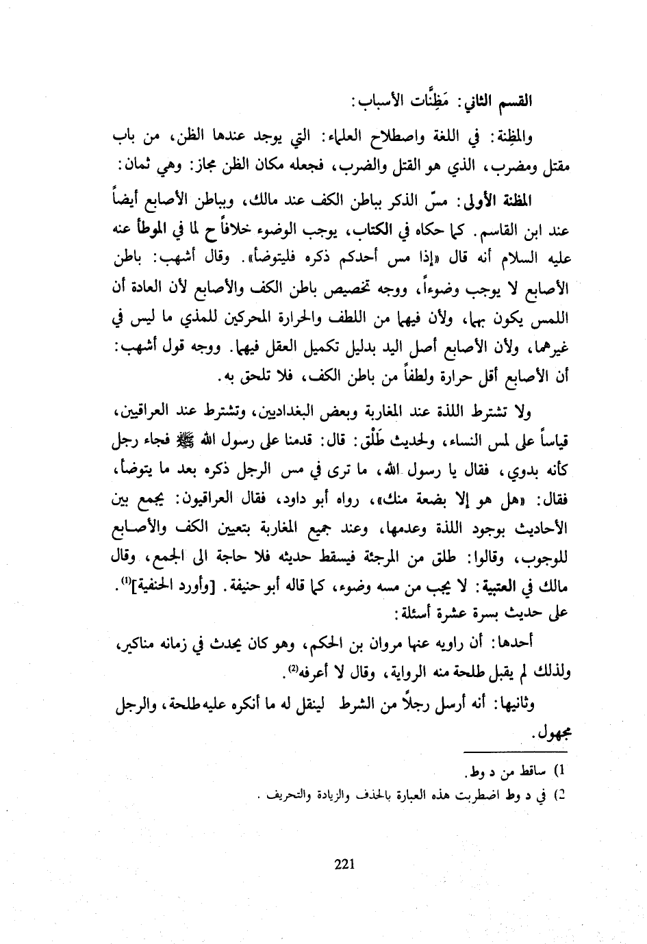 الْقِسْمُ الثَّانِي مَظِنَّاتُ الْأَسْبَابِ: وَالْمَظِنَّةُ فِي اللُّغَةِ وَاصْطِلَاحِ الْعُلَمَاءِ الَّتِي يُوجَدُ عِنْدَهَا الظَّنُّ مِنْ بَابِ مَقْتَلٍ وَمَضْرَبٍ الَّذِي هُوَ الْقَتْلُ وَالضَّرْبُ فَجعله مَكَان الظَّن مجَاز وَهِي ثَمَان: الْمَظِنَّةُ الْأُولَى مَسُّ الذَّكَرِ بِبَاطِنِ الْكَفِّ عِنْدَ مَالِكٍ وَبِبَاطِنِ الْأَصَابِعِ أَيْضًا عِنْدَ ابْنِ الْقَاسِمِ كَمَا حَكَاهُ فِي الْكِتَابِ يُوجِبُ الْوُضُوءَ خِلَافًا ح لِمَا فِي الْمُوَطَّأِ عَنْهُ عَلَيْهِ السَّلَامُ أَنَّهُ قَالَ