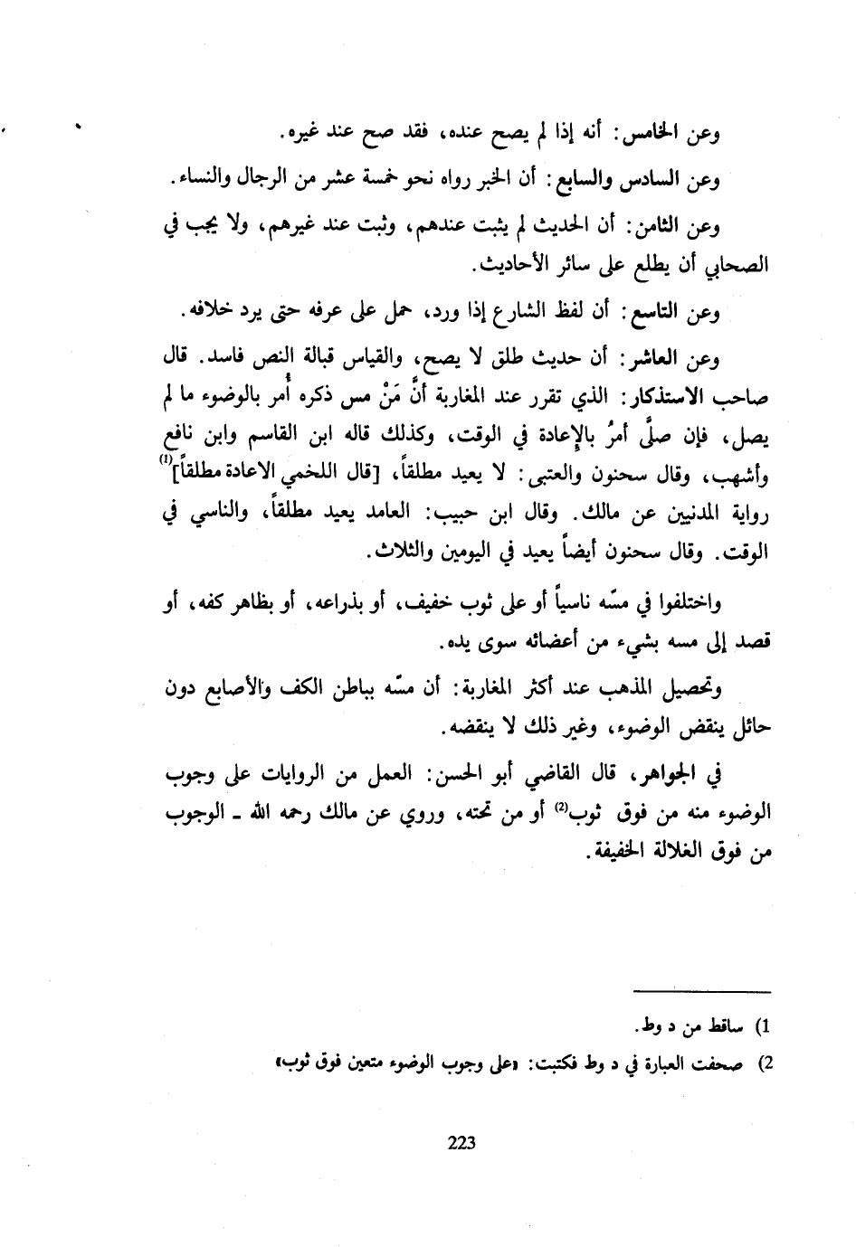 وَعَنِ الْخَامِسِ أَنَّهُ إِذَا لَمْ يَصِحَّ عِنْدَهُ فَقَدْ صَحَّ عِنْدَ غَيْرِهِ. وَعَنِ السَّادِسِ وَالسَّابِعِ أَنَّ الْخَبَرَ رَوَاهُ نَحْوُ خَمْسَةَ عَشَرَ مِنَ الرِّجَالِ وَالنِّسَاءِ. وَعَنِ الثَّامِنِ أَنَّ الْحَدِيثَ لَمْ يَثْبُتْ عِنْدَهُمْ وَثَبَتَ عِنْدَ غَيْرِهِمْ وَلَا يَجِبُ فِي الصَّحَابِيِّ أَنْ يَطَّلِعَ عَلَى سَائِرِ الْأَحَادِيثِ. وَعَنِ التَّاسِعِ أَنَّ لَفْظَ الشَّارِعِ إِذَا وَرَدَ حُمِلَ عَلَى عُرْفِهِ حَتَّى يَرِدَ خِلَافُهُ. وَعَنِ الْعَاشِرِ أَنَّ حَدِيثَ طَلْقٍ لَا يَصِحُّ وَالْقِيَاسُ قُبَالَةَ النَّصِّ فَاسِدٌ قَالَ صَاحِبُ الِاسْتِذْكَارِ الَّذِي تَقَرَّرَ عِنْدَ الْمَغَارِبَةِ أَنَّ مَنْ مَسَّ ذَكَرَهُ أُمِرَ بِالْوُضُوءِ مَا لَمْ يُصَلِّ فَإِنْ صَلَّى أُمِرَ بِالْإِعَادَةِ فِي الْوَقْتِ وَكَذَلِكَ قَالَهُ ابْنُ الْقَاسِمِ وَابْنُ نَافِعٍ وَأَشْهَبُ وَقَالَ سَحْنُونُ وَالْعُتْبِيُّ لَا يُعِيدُ مُطْلَقًا قَالَ اللَّخْمِيُّ الْإِعَادَةُ مُطْلَقًا رِوَايَةُ الْمَدَنِيِّينَ عَنْ مَالِكٍ وَقَالَ ابْنُ حَبِيبٍ الْعَامِدُ يُعِيدُ مُطْلَقًا وَالنَّاسِي فِي الْوَقْتِ وَقَالَ سَحْنُونُ أَيْضًا يُعِيدُ فِي الْيَوْمَيْنِ وَالثَّلَاثِ. وَاخْتَلَفُوا فِي مَسِّهِ نَاسِيًا أَوْ عَلَى ثَوْبٍ خَفِيفٍ أَوْ بِذِرَاعِهِ أَوْ بِظَاهِرِ كَفِّهِ أَوْ قَصَدَ إِلَى مَسِّهِ بِشَيْءٍ مِنْ أَعْضَائِهِ سِوَى يَدِهِ. وَتَحْصِيلُ الْمَذْهَبِ عِنْدَ أَكْثَرِ الْمَغَارِبَةِ أَنَّ مَسَّهُ بِبَاطِنِ الْكَفِّ وَالْأَصَابِعِ دُونَ حَائِلٍ يَنْقُضُ الْوُضُوءَ وَغَيْرُ ذَلِكَ لَا يَنْقُضُهُ. فِي الْجَوَاهِرِ قَالَ الْقَاضِي أَبُو الْحَسَنِ الْعَمَلُ مِنَ الرِّوَايَاتِ عَلَى وُجُوبِ الْوُضُوءِ مِنْهُ مِنْ فَوْقِ ثَوْبٍ أَوْ مِنْ تَحْتِهِ وَرُوِيَ عَنْ مَالِكٍ رَحِمَهُ اللَّهُ الْوُجُوبُ مِنْ فَوْقِ الْغِلَالَةِ الْخَفِيفَةِ.