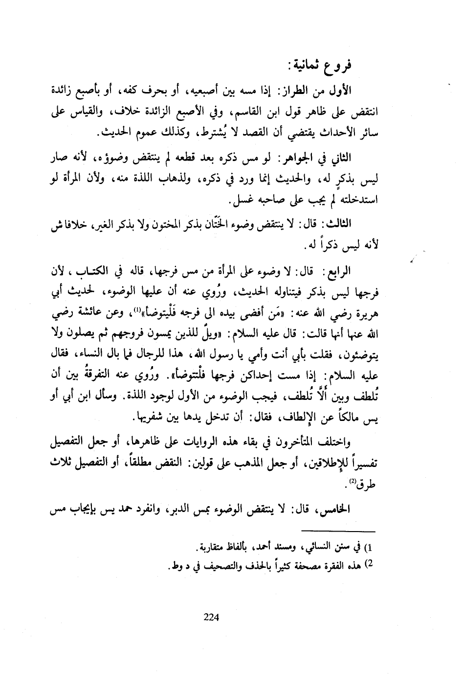 فُرُوعٌ ثَمَانِيَةٌ: الْأَوَّلُ مِنَ الطَّرَّازِ إِذَا مَسَّهُ بَيْنَ أُصْبُعَيْهِ أَوْ بِحَرْفِ كَفِّهِ أَوْ بِأُصْبُعٍ زَائِدَةٍ انْتَقَضَ عَلَى ظَاهِرِ قَوْلِ ابْنِ الْقَاسِمِ وَفِي الْأُصْبُعِ الزَّائِدَةِ خِلَافٌ وَالْقِيَاسُ عَلَى سَائِرِ الْأَحْدَاثِ يَقْتَضِي أَنَّ الْقَصْدَ لَا يُشْتَرَطُ وَكَذَلِكَ عُمُومُ الْحَدِيثِ. الثَّانِي فِي الْجَوَاهِرِ لَوْ مَسَّ ذكره بعد قطعه لم ينْتَقض وضوؤه لِأَنَّه صَارَ لَيْسَ بِذَكَرٍ لَهُ وَالْحَدِيثُ إِنَّمَا وَرَدَ فِي ذَكَرِهِ وَلِذَهَابِ اللَّذَّةِ مِنْهُ وَلِأَنَّ الْمَرْأَةَ لَوِ اسْتَدْخَلَتْهُ لَمْ يَجِبْ عَلَى صَاحِبِهِ غُسْلٌ. الثَّالِثُ قَالَ لَا يَنْتَقِضُ وُضُوءُ الْخِتَانِ بِذَكَرِ الْمَخْتُونِ وَلَا بِذَكَرِ الْغَيْرِ خِلَافًا ش لِأَنَّه لَيْسَ ذَكَرًا لَهُ. الرَّابِعُ قَالَ لَا وُضُوءَ عَلَى الْمَرْأَةِ مِنْ مَسِّ فَرْجِهَا قَالَهُ فِي الْكِتَابِ لِأَنَّ فَرْجَهَا لَيْسَ بِذَكَرٍ فَيَتَنَاوَلَهُ الْحَدِيثُ وَرُوِيَ عَنْهُ أَنَّ عَلَيْهَا الْوُضُوءَ لِحَدِيثِ أَبِي هُرَيْرَةَ رَضِيَ اللَّهُ عَنْهُ