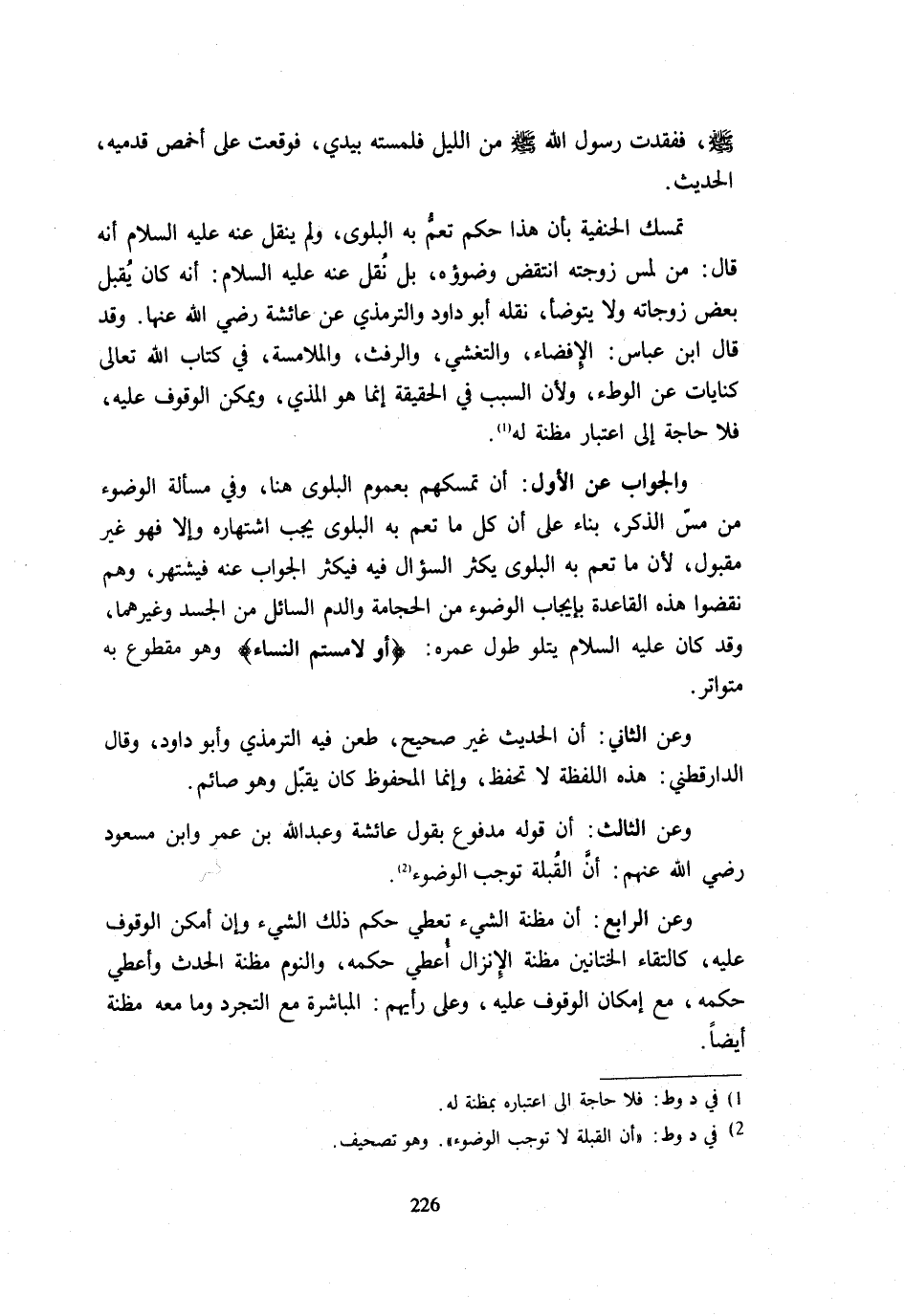 - صَلَّى اللَّهُ عَلَيْهِ وَسَلَّم َ - ففقدت رَسُول الله - صَلَّى اللَّهُ عَلَيْهِ وَسَلَّم َ - مِنَ اللَّيْلِ فَلَمَسْتُهُ بِيَدِي فَوَقَعْتُ عَلَى أَخْمَصِ قَدَمَيْهِ الْحَدِيثَ. تَمَسَّكَ الْحَنَفِيَّةُ بِأَنَّ هَذَا حُكْمٌ تَعُمُّ بِهِ الْبَلْوَى وَلَمْ يُنْقَلْ عَنْهُ عَلَيْهِ السَّلَامُ أَنَّهُ قَالَ مَنْ لَمَسَ زَوْجَتَهُ انْتَقَضَ وضوؤه بَلْ نُقِلَ عَنْهُ عَلَيْهِ السَّلَامُ أَنَّهُ كَانَ يُقَبِّلُ بَعْضَ زَوْجَاتِهِ وَلَا يَتَوَضَّأُ نَقَلَهُ أَبُو دَاوُدَ وَالتِّرْمِذِيُّ عَنْ عَائِشَةَ رَضِيَ اللَّهُ عَنْهَا وَقَدْ قَالَ ابْنُ عَبَّاسٍ الْإِفْضَاءُ وَالتَّغَشِّي وَالرَّفَثُ وَالْمُلَامَسَةُ فِي كِتَابِ اللَّهِ تَعَالَى كِنَايَاتٌ عَنِ الْوَطْءِ وَلِأَنَّ السَّبَبَ فِي الْحَقِيقَةِ إِنَّمَا هُوَ الْمَذْيُ وَيُمْكِنُ الْوُقُوفُ عَلَيْهِ فَلَا حَاجَةَ إِلَى اعْتِبَارِ مَظِنَّةٍ لَهُ. وَالْجَوَابُ عَنِ الْأَوَّلِ أَنَّ تَمَسُّكَهُمْ بِعُمُومِ الْبَلْوَى هُنَا وَفِي مَسْأَلَةِ الْوُضُوءِ مِنْ مَسِّ الذَّكَرِ بِنَاءً عَلَى أَنَّ كُلَّ مَا تَعُمُّ بِهِ الْبَلْوَى يَجِبُ اشْتِهَارُهُ وَإِلَّا فَهُوَ غَيْرُ مَقْبُولٍ لِأَنَّ مَا تَعُمُّ بِهِ الْبلوى يكثر السؤوال فِيهِ فَيَكْثُرُ الْجَوَابُ عَنْهُ فَيَشْتَهِرُ وَهُمْ نَقَضُوا هَذِهِ الْقَاعِدَةَ بِإِيجَابِ الْوُضُوءِ مِنَ الْحِجَامَةِ وَالدَّمِ السَّائِلِ مِنَ الْجَسَدِ وَغَيْرِهِمَا وَقَدْ كَانَ عَلَيْهِ السَّلَامُ يَتْلُو طُولَ عُمُرِهِ {أَوْ لامَسْتُمُ النِّسَاءَ} وَهُوَ مَقْطُوعٌ بِهِ مُتَوَاتِرٌ. وَعَنِ الثَّانِي أَنَّ الْحَدِيثَ غَيْرُ صَحِيحٍ طَعَنَ فِيهِ التِّرْمِذِيُّ وَأَبُو دَاوُدَ وَقَالَ الدَّارَقُطْنِيُّ هَذِهِ اللَّفْظَةُ لَا تُحْفَظُ وَإِنَّمَا الْمَحْفُوظُ كَانَ يُقَبِّلُ وَهُوَ صَائِمٌ. وَعَنِ الثَّالِثِ أَنَّ قَوْلَهُ مَدْفُوعٌ بِقَوْلِ عَائِشَةَ وَعَبْدِ اللَّهِ بْنِ عُمَرَ وَابْنِ مَسْعُودٍ رَضِيَ اللَّهُ عَنْهُمْ إِنَّ الْقُبْلَةَ تُوجِبُ الْوُضُوءَ. وَعَنِ الرَّابِعِ أَنَّ مَظِنَّةَ الشَّيْءِ تُعْطِي حُكْمَ ذَلِكَ الشَّيْءِ وَإِنْ أَمْكَنَ الْوُقُوفُ عَلَيْهِ كَالْتِقَاءِ الْخِتَانَيْنِ مَظِنَّةَ الْإِنْزَالِ أُعْطِيَ حُكْمَهُ وَالنَّوْمُ مَظِنَّةُ الْحَدَثِ وَأُعْطِيَ حُكْمَهُ مَعَ إِمْكَانِ الْوُقُوفِ عَلَيْهِ وَعَلَى رَأْيِهِمُ الْمُبَاشَرَةُ مَعَ التَّجَرُّدِ وَمَا مَعَهُ مَظِنَّةٌ أَيْضًا.