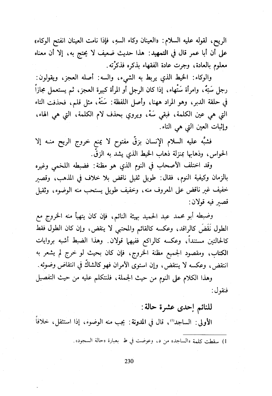 عَلَى أَنَّ أَبَا عُمَرَ قَالَ فِي التَّمْهِيدِ هَذَا حَدِيثٌ ضَعِيفٌ لَا يُحْتَجُّ بِهِ إِلَّا أَنَّ مَعْنَاهُ مَعْلُومٌ بِالْعَادَةِ وَجَرَتْ عَادَةُ الْفُقَهَاءِ بِذِكْرِهِ فَذَكَرْتُهُ. وَالْوِكَاءُ الْخَيْطُ الَّذِي يُرْبَطُ بِهِ الشَّيْءُ وَالسَّهُ أَصله الْعَجز وَيَقُولُونَ رجل سِتَّة وَامْرَأَةٌ سَتْهَاءُ إِذَا كَانَ الرَّجُلُ أَوِ الْمَرْأَةُ كَبِيرَةَ الْعَجُزِ ثُمَّ يُسْتَعْمَلُ مَجَازًا فِي حَلْقَةِ الدبر وَهُوَ المُرَاد هَهُنَا وَأَصْلُ اللَّفْظَةِ سَتَهٍ مِثْلَ قَلَمٍ فَحُذِفَتِ التَّاءُ الَّتِي هِيَ عَيْنُ الْكَلِمَةِ فَبَقِيَ سَهُ وَيُرْوَى بِحَذْفِ لَامِ الْكَلِمَةِ الَّتِي هِيَ الْهَاءُ وَإِثْبَاتِ الْعَيْنِ الَّتِي هِيَ التَّاءُ. فَشَبَّهَ عَلَيْهِ السَّلَامُ الْإِنْسَانَ بِزِقٍّ مَفْتُوحٍ لَا يَمْنَعُ خُرُوجَ الرِّيحَ مِنْهُ إِلَّا الْحَوَاسُّ وَذَهَابُهَا بِمَنْزِلَةِ ذَهَابِ الْخَيْطِ الَّذِي يُشَدُّ بِهِ الزِّقُّ. وَقَدِ اخْتَلَفَ الْأَصْحَابُ فِي النَّوْمِ الَّذِي هُوَ مَظِنَّةٌ فَضَبَطَهُ اللَّخْمِيُّ وَغَيْرُهُ بِالزَّمَانِ وَكَيْفِيَّةِ النَّوْمِ فَقَالَ طَوِيلٌ ثَقِيلٌ نَاقِضٌ بِلَا خِلَافٍ فِي الْمَذْهَبِ وَقَصِيرٌ خَفِيفٌ غَيْرُ نَاقِضٍ عَلَى الْمَعْرُوفِ مِنْهُ وَخَفِيفٌ طَوِيلٌ يُسْتَحَبُّ مِنْهُ الْوُضُوءُ وَثَقِيلٌ قَصِيرٌ فِيهِ قَوْلَانِ: وَضَبَطَهُ أَبُو مُحَمَّدٍ عَبْدُ الْحَمِيدِ بِهَيْئَةِ النَّائِمِ فَإِن كَانَ يُتَهَيَّأُ مِنْهُ الْخُرُوجُ مَعَ الطُّولِ نَقَضَ كَالرَّاقِدِ وَعَكْسُهُ كَالْقَائِمِ وَالْمُحْتَبِي لَا يَنْقُضُ وَإِنْ كَانَ الطُّولُ فَقَطْ كَالْحَالَتَيْنِ مُسْتَنِدًا وَعَكْسُهُ كَالرَّاكِعِ فَفِيهِمَا قَوْلَانِ وَهَذَا الضَّبْطُ أَشْبَهُ بِرِوَايَاتِ الْكِتَابِ وَمَقْصُودُ الْجَمِيعِ مَظِنَّةُ الْخُرُوجِ فَإِنْ كَانَ بِحَيْثُ لَوْ خَرَجَ لَمْ يَشْعُرْ بِهِ انْتَقَضَ وَعَكْسُهُ لَا يَنْتَقِضُ وَإِنِ اسْتَوَى الْأَمْرَانِ فَهُوَ كَالشَّاكِّ فِي انْتِقَاضِ وُضُوئِهِ. وَهَذَا الْكَلَامُ عَلَى النَّوْمِ مِنْ حَيْثُ الْجُمْلَةِ فَلْنَتَكَلَّمْ عَلَيْهِ مِنْ حَيْثُ التَّفْصِيلِ فَنَقُولُ: لِلنَّائِمِ إِحْدَى عَشْرَةَ حَالَةً: الْأُولَى السَّاجِدُ قَالَ فِي الْمُدَوَّنَةِ يَجِبُ مِنْهُ الْوُضُوءُ إِذَا اسْتَثْقَلَ خِلَافًا