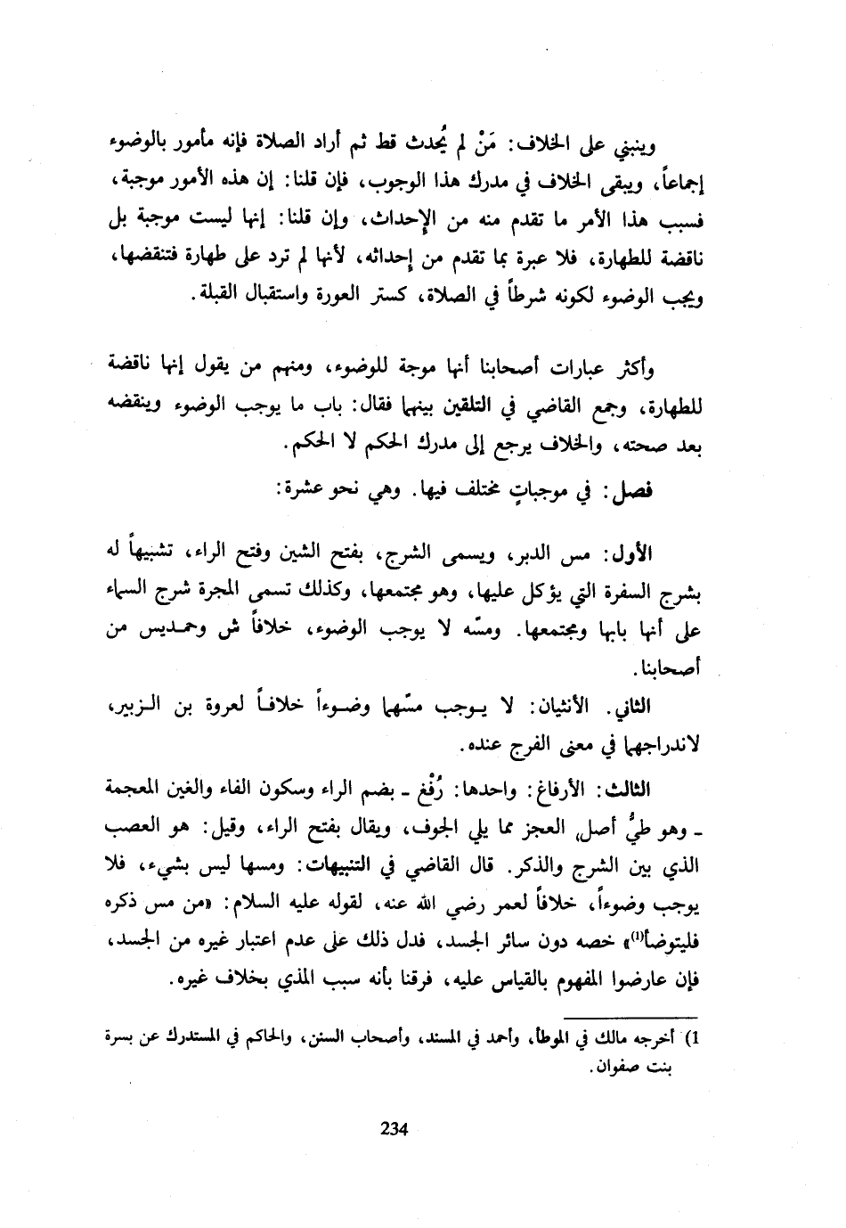 وَيَنْبَنِي عَلَى الْخِلَافِ مَنْ لَمْ يُحْدِثْ قَطُّ ثُمَّ أَرَادَ الصَّلَاةَ فَإِنَّهُ مَأْمُورٌ بِالْوُضُوءِ إِجْمَاعًا وَيَبْقَى الْخِلَافُ فِي مُدْرِكِ هَذَا الْوُجُوبِ فَإِنَّا قُلْنَا إِنَّ هَذِهِ الْأُمُورَ مُوجِبَةٌ فَسَبَبُ هَذَا الْأَمْرِ مَا تَقَدَّمَ مِنْهُ مِنَ الْإِحْدَاثِ وَإِنْ قُلْنَا إِنَّهَا لَيْسَتْ مُوجِبَةً بَلْ نَاقِضَةٌ لِلطَّهَارَةِ فَلَا عِبْرَةَ بِمَا تَقَدَّمَ مِنْ إِحْدَاثِهِ لِأَنَّهَا لَمْ تَرِدْ عَلَى طَهَارَةٍ فَتَنْقُضَهَا وَيَجِبُ الْوُضُوءُ لِكَوْنِهِ شَرْطًا فِي الصَّلَاةِ كَسَتْرِ الْعَوْرَةِ وَاسْتِقْبَالِ الْقِبْلَةِ. وَأَكْثَرُ عِبَارَاتِ أَصْحَابِنَا أَنَّهَا مُوجِبَةٌ لِلْوُضُوءِ وَمِنْهُمْ مَنْ يَقُولُ إِنَّهَا نَاقِضَةٌ لِلطَّهَارَةِ وَجَمَعَ الْقَاضِي فِي التَّلْقِينِ بَيْنَهُمَا فَقَالَ بَابُ مَا يُوجِبُ الْوُضُوءَ وَيَنْقُضُهُ بَعْدَ صِحَّتِهِ وَالْخِلَافُ يَرْجِعُ إِلَى مُدْرِكِ الْحُكْمِ لَا الْحُكْمِ. فَصْلٌ فِي مُوجِبَاتٍ مُخْتَلَفٌ فِيهَا وَهِيَ نَحْوُ عَشْرَةٍ: الْأَوَّلُ مَسُّ الدُّبُرِ وَيُسَمَّى الشَّرَجَ بِفَتْحِ الشِّينِ وَفَتْحِ الرَّاءِ تَشْبِيهًا لَهُ بِشَرَجِ السُّفْرَةِ الَّتِي يُؤْكَلُ عَلَيْهَا وَهُوَ مُجْتَمَعُهَا وَكَذَلِكَ تُسَمَّى الْمَجَرَّةُ شَرَجَ السَّمَاءِ عَلَى أَنَّهَا بَابُهَا وَمُجْتَمَعُهَا وَمَسُّهُ لَا يُوجب الْوضُوء خلافًا ش وَحمد يس مِنْ أَصْحَابِنَا. الثَّانِي الْأُنْثَيَانِ لَا يُوجِبُ مَسُّهُمَا وضُوءًا خلافًا لعروة بن الزبير لاندارجهما فِي مَعْنَى الْفَرْجِ عِنْدَهُ. الثَّالِثُ الْأَرْفَاغُ وَاحِدُهَا رُفْغٌ بِضَمِّ الرَّاءِ وَسُكُونِ الْفَاءِ وَالْغَيْنِ الْمُعْجَمَةِ وَهُوَ طَيُّ أَصْلَيِ الْعَجُزِ مِمَّا يَلِي الْجَوْفَ وَيُقَالُ بِفَتْحِ الرَّاءِ وَقِيلَ هُوَ الْعَصَبُ الَّذِي بَيْنَ الشَّرَجِ وَالذَّكَرِ قَالَ الْقَاضِيَ فِي التَّنْبِيهَاتِ وَمَسُّهَا لَيْسَ بِشَيْءٍ فَلَا يُوجِبُ وُضُوءًا خِلَافًا لِعُمَرَ رَضِيَ اللَّهُ عَنْهُ لِقَوْلِهِ عَلَيْهِ السَّلَامُ