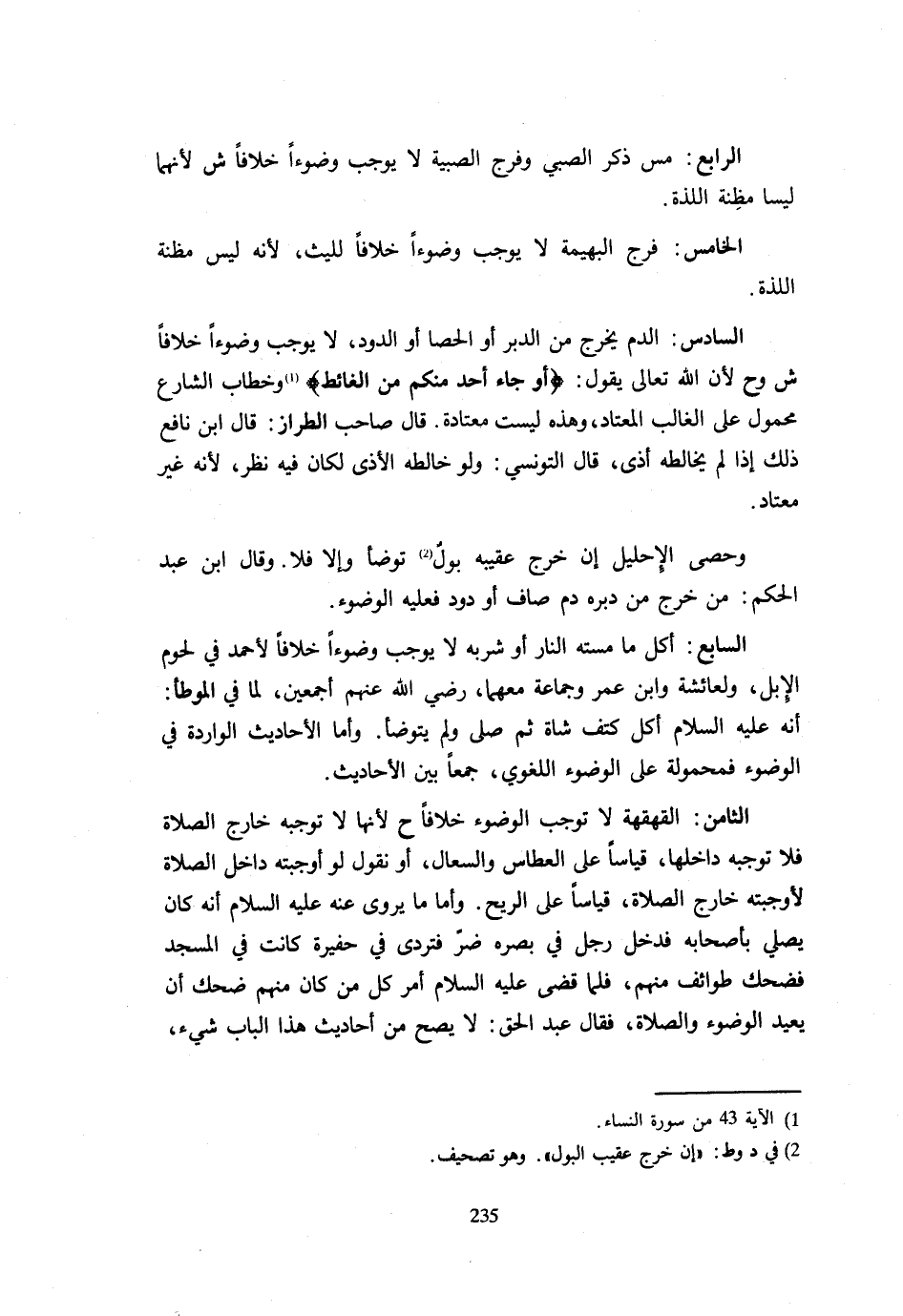 الرَّابِعُ مَسُّ ذَكَرِ الصَّبِيِّ وَفَرْجِ الصَّبِيَّةِ لَا يُوجِبُ وُضُوءًا خِلَافًا ش لِأَنَّهُمَا لَيْسَا مَظِنَّةَ اللَّذَّةِ. الْخَامِسُ فَرْجُ الْبَهِيمَةِ لَا يُوجِبُ وُضُوءًا خِلَافًا لِلَّيْثِ لِأَنَّه لَيْسَ مَظِنَّةَ اللَّذَّةِ. السَّادِسُ الدَّمُ يَخْرُجُ مِنَ الدُّبُرِ أَوِ الْحَصَا أَوِ الدُّود لَا يُوجب وضُوءًا خلافًا ش وح لِأَنَّ اللَّهَ تَعَالَى يَقُولُ {أَوْ جَاءَ أَحَدٌ مِنْكُم من الْغَائِط} وَخِطَابُ الشَّارِعِ مَحْمُولٌ عَلَى الْغَالِبِ الْمُعْتَادِ وَهَذِهِ لَيْسَتْ مُعْتَادَةً قَالَ صَاحِبُ الطَّرَّازِ قَالَ ابْنُ نَافِعٍ ذَلِكَ إِذَا لَمْ يُخَالِطْهُ أَذًى قَالَ التُّونِسِيُّ وَلَوْ خَالَطَهُ الْأَذَى لَكَانَ فِيهِ نَظَرٌ لِأَنَّه غَيْرُ مُعْتَادٍ. وَحَصَى الْإِحْلِيلِ إِنْ خَرَجَ عُقَيْبَهُ بَوْلٌ تَوَضَّأَ وَإِلَّا فَلَا وَقَالَ ابْنُ عَبْدِ الْحَكَمِ مَنْ خَرَجَ مِنْ دُبُرِهِ دَمٌ صَافٍ أَوْ دُودٌ فَعَلَيْهِ الْوُضُوءُ. السَّابِعُ أَكْلُ مَا مَسَّتْهُ النَّارُ أَوْ شُرْبُهُ لَا يُوجِبُ وُضُوءًا خِلَافًا لِأَحْمَدَ فِي لُحُومِ الْإِبِلِ وَلِعَائِشَةَ وَابْنِ عُمَرَ وَجَمَاعَةٍ مَعَهُمَا رَضِيَ اللَّهُ عَنْهُمْ أَجْمَعِينَ لِمَا فِي الْمُوَطَّأِ أَنَّهُ عَلَيْهِ السَّلَامُ أَكَلَ كَتِفَ شَاةٍ ثُمَّ صَلَّى وَلَمْ يَتَوَضَّأْ وَأَمَّا الْأَحَادِيثُ الْوَارِدَةُ فِي الْوُضُوءِ فَمَحْمُولَةٌ عَلَى الْوُضُوءِ اللُّغَوِيِّ جَمْعًا بَيْنَ الْأَحَادِيثِ. الثَّامِنُ الْقَهْقَهَةُ لَا تُوجِبُ الْوُضُوءَ خِلَافًا ح لِأَنَّهَا لَا تُوجِبُهُ خَارِجَ الصَّلَاةِ فَلَا تُوجِبُهُ دَاخِلَهَا قِيَاسًا عَلَى الْعُطَاسِ وَالسُّعَالِ أَوْ نَقُولُ لَوْ أَوْجَبَتْهُ دَاخِلَ الصَّلَاةِ لَأَوْجَبَتْهُ خَارِجَ الصَّلَاةِ قِيَاسًا عَلَى الرِّيحِ وَأَمَّا مَا يُرْوَى عَنْهُ عَلَيْهِ السَّلَامُ أَنَّهُ كَانَ يُصَلِّي بِأَصْحَابِهِ فَدَخَلَ رَجُلٌ فِي بَصَرِهِ ضُرٌّ فَتَرَدَّى فِي حُفَيْرَةٍ كَانَتْ فِي الْمَسْجِدِ فَضَحِكَ طَوَائِفُ مِنْهُمْ فَلَمَّا قَضَى عَلَيْهِ السَّلَامُ أَمَرَ كُلَّ مَنْ كَانَ مِنْهُمْ ضَحِكَ أَنْ يُعِيدَ الْوُضُوءَ وَالصَّلَاةَ فَقَالَ عَبْدُ الْحَقِّ لَا يَصِحُّ مِنْ أَحَادِيثِ هَذَا الْبَابِ شَيْءٌ