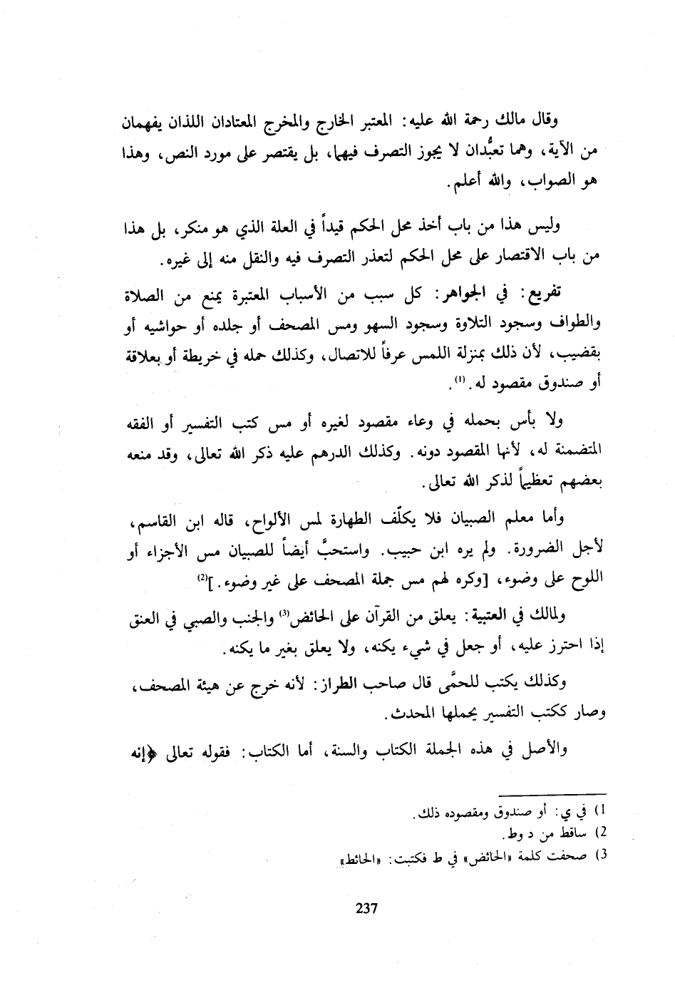 وَقَالَ مَالِكٌ رَحْمَةُ اللَّهِ عَلَيْهِ الْمُعْتَبَرُ الْخَارِجُ وَالْمَخْرَجُ الْمُعْتَادَانِ اللَّذَانِ يُفْهَمَانِ مِنَ الْآيَةِ وَهُمَا تَعَبُّدَانِ لَا يَجُوزُ التَّصَرُّفُ فِيهِمَا بَلْ يُقْتَصَرُ عَلَى مَوْرِدِ النَّصِّ وَهَذَا هُوَ الصَّوَابُ وَاللَّهُ أَعْلَمُ. وَلَيْسَ هَذَا مِنْ بَابِ أَخْذِ مَحَلِّ الْحُكْمِ قَيْدًا فِي الْعِلَّةِ الَّذِي هُوَ مُنْكَرٌ بَلْ هَذَا مِنْ بَابِ الِاقْتِصَارِ عَلَى مَحَلِّ الْحُكْمِ لِتَعَذُّرِ التَّصَرُّفِ فِيهِ وَالنَّقْلِ مِنْهُ إِلَى غَيْرِهِ. تَفْرِيعٌ فِي الْجَوَاهِرِ كُلُّ سَبَبٍ مِنَ الْأَسْبَابِ الْمُعْتَبَرَةِ يَمْنَعُ مِنَ الصَّلَاةِ وَالطَّوَافِ وَسُجُودِ التِّلَاوَةِ وَسُجُودِ السَّهْوِ وَمَسِّ الْمُصْحَفِ أَوْ جِلْدِهِ أَوْ حَوَاشِيهِ أَوْ بِقَضِيبٍ لِأَنَّ ذَلِكَ بِمَنْزِلَةِ اللَّمْسِ عُرْفًا لِلِاتِّصَالِ وَكَذَلِكَ حَمْلُهُ فِي خَرِيطَةٍ أَوْ بِعَلَاقَةٍ أَوْ صُنْدُوقٍ مَقْصُودٍ لَهُ. وَلَا بَأْسَ بِحَمْلِهِ فِي وِعَاءٍ مَقْصُودٍ لِغَيْرِهِ أَوْ مَسِّ كُتُبِ التَّفْسِيرِ أَوِ الْفِقْهِ الْمُتَضَمِّنَةِ لَهُ لِأَنَّهَا الْمَقْصُودُ دُونَهُ وَكَذَلِكَ الدِّرْهَمُ عَلَيْهِ ذِكْرُ اللَّهِ تَعَالَى وَقَدْ مَنَعَهُ بَعْضُهُمْ تَعْظِيمًا لِذِكْرِ اللَّهِ تَعَالَى. وَأَمَّا مُعَلِّمُ الصِّبْيَانِ فَلَا يُكَلَّفُ الطَّهَارَةَ لِمَسِّ الْأَلْوَاحِ قَالَهُ ابْنُ الْقَاسِمِ لِأَجْلِ الضَّرُورَةِ وَلَمْ يَرَهُ ابْنُ حَبِيبٍ وَاسْتَحَبَّ أَيْضًا لِلصِّبْيَانِ مَسَّ الْأَجْزَاءِ أَوِ اللَّوْحِ عَلَى وُضُوءٍ وَكَرِهَ لَهُمْ مَسَّ جُمْلَةِ الْمُصْحَفِ عَلَى غَيْرِ وُضُوءٍ. وَلِمَالِكٍ فِي الْعُتْبِيَّةِ يُعَلَّقُ مِنَ الْقُرْآنِ عَلَى الْحَائِضِ وَالْجُنُبِ وَالصَّبِيِّ فِي الْعُنُقِ إِذَا احْتُرِزَ عَلَيْهِ أَوْ جُعِلَ فِي شَيْءٍ يُكِنُّهُ وَلَا يُعَلَّقُ بِغَيْرِ مَا يُكِنُّهُ. وَكَذَلِكَ يُكْتَبُ لِلْحُمَّى قَالَ صَاحِبُ الطَّرَّازِ لِأَنَّه خَرَجَ عَنْ هَيْئَةِ الْمُصْحَفِ وَصَارَ كَكُتُبِ التَّفْسِيرِ يَحْمِلُهَا الْمُحْدِثُ. وَالْأَصْلُ فِي هَذِهِ الْجُمْلَةِ الْكِتَابُ وَالسُّنَّةُ أَمَّا الْكتاب فَقَوله تَعَالَى {إِنَّه
