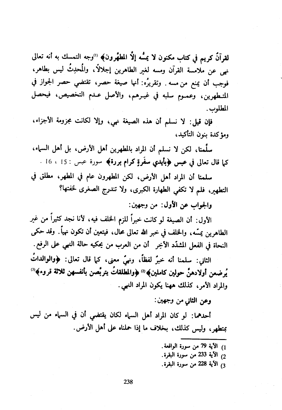 لقرآن كريم فِي كتاب مَكْنُون لَا يمسهُ إِلَّا الْمُطهرُونَ} وَجْهُ التَّمَسُّكِ بِهِ أَنَّهُ تَعَالَى نَهَى عَنْ مُلَامَسَةِ الْقُرْآنِ وَمَسِّهِ لِغَيْرِ الطَّاهِرَيْنِ إِجْلَالًا وَالْمُحْدِثُ لَيْسَ بِطَاهِرٍ فَوَجَبَ أَنْ يُمْنَعَ مِنْ مَسِّهِ وَتَقْرِيرُهُ أَنَّهَا صِيغَةُ حَصْرٍ تَقْتَضِي حَصْرَ الْجَوَازِ فِي الْمُتَطَهِّرِينَ وَعُمُومَ سَلْبِهِ فِي غَيْرِهِمْ وَالْأَصْلُ عَدَمُ التَّخْصِيصِ فَيَحْصُلُ الْمَطْلُوبُ. فَإِنْ قِيلَ لَا نُسَلِّمُ أَنَّ هَذِهِ الصِّيغَةَ نَهْيٌ وَإِلَّا لَكَانَتْ مَجْزُومَةَ الْأَجْزَاءِ وَمُؤَكَّدَةً بِنُونِ التَّأْكِيدِ. سَلَّمْنَا لَكِنْ لَا نُسَلِّمُ أَنَّ الْمُرَادَ بِالْمُطَهَّرِينَ أَهْلُ الْأَرْضِ بَلْ أَهْلُ السَّمَاءِ كَمَا قَالَ تَعَالَى فِي عبس {بأيدي سفرة كرام بررة} سُورَة عِيسَى 15 16. سَلَّمْنَا أَنَّ الْمُرَادَ أَهْلُ الْأَرْضِ لَكِنِ الْمُطَهَّرُونَ عَامٌّ فِي الْمُطَهَّرِ مُطْلَقٌ فِي التَّطْهِيرِ فَلِمَ لَا تَكْفِي الطَّهَارَةُ الْكُبْرَى وَلَا تَنْدَرِجُ الصُّغْرَى لِخِفَّتِهَا؟ وَالْجَوَابُ عَنِ الْأَوَّلِ مِنْ وَجْهَيْنِ: الْأَوَّلُ أَنَّ الصِّيغَةَ لَوْ كَانَتْ خَبَرًا لَلَزِمَ الْخُلْفُ فِيهِ لِأَنَّا نَجِدُ كَثِيرًا مِنْ غَيْرِ الطَّاهِرَيْنِ يَمَسُّهُ وَالْخُلْفُ فِي خَبَرِ اللَّهِ تَعَالَى مُحَالٌ فَيَتَعَيَّنُ أَنْ تَكُونَ نَهْيًا وَقَدْ حَكَى النُّحَاةُ فِي الْفِعْلِ الْمُشَدَّدِ الْآخِرِ أَنَّ مِنَ الْعَرَبِ مَنْ يَحْكِيهِ حَالَةَ النَّهْيِ عَلَى الرَّفْعِ الثَّانِي سلمنَا أَنه خبر لفظا وَنهي مَعْنًى كَمَا قَالَ تَعَالَى {وَالْوَالِدَاتُ يُرْضِعْنَ أَوْلادَهُنَّ حَوْلَيْنِ كَامِلين} {والمطلقات يَتَرَبَّصْنَ بِأَنْفُسِهِنَّ ثَلَاثَة قُرُوء} وَالْمرَاد الْأَمر كَذَلِك هَهُنَا يَكُونُ الْمُرَادُ النَّهْيَ وَعَنِ الثَّانِي مِنْ وَجْهَيْنِ أَحَدُهُمَا لَوْ كَانَ الْمُرَادُ أَهْلَ السَّمَاءِ لَكَانَ يَقْضِي أَنَّ فِي السَّمَاءِ مَنْ لَيْسَ بِمُتَطَهِّرٍ وَلَيْسَ كَذَلِكَ بِخِلَافِ مَا إِذَا حَمَلْنَاهُ عَلَى أهل الأَرْض.