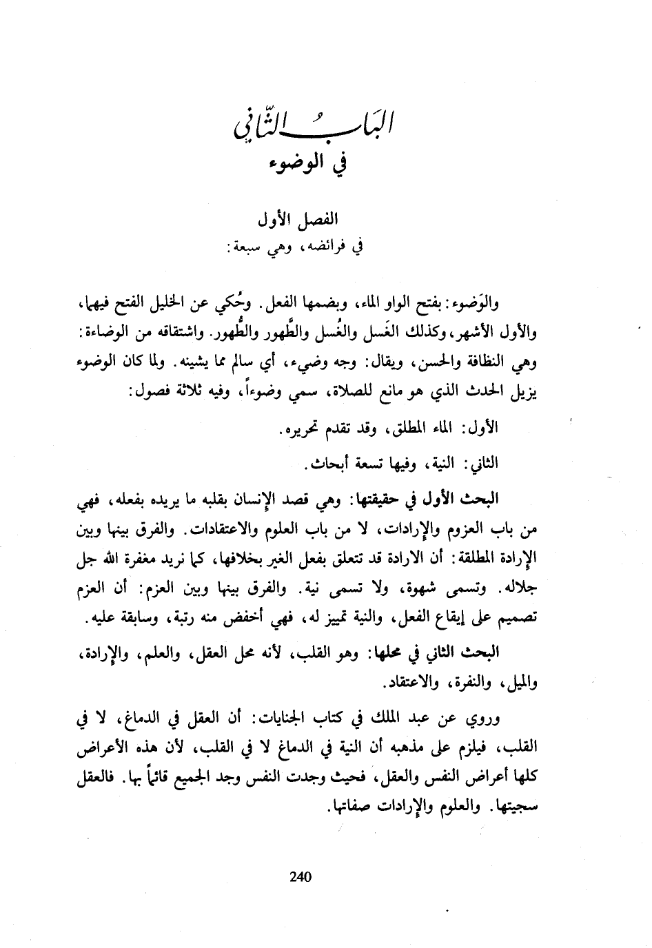 وَالْوَضُوءُ بِفَتْحِ الْوَاوِ الْمَاءُ وَبِضَمِّهَا الْفِعْلُ وَحُكِيَ عَنِ الْخَلِيلِ الْفَتْحُ فِيهِمَا وَالْأَوَّلُ الْأَشْهَرُ وَكَذَلِكَ الْغُسْلُ وَالْغَسْلُ وَالطُّهُورُ وَالطَّهُورُ وَاشْتِقَاقُهُ مِنَ الْوَضَاءَةِ وَهِيَ النَّظَافَةُ وَالْحُسْنُ وَيُقَالُ وَجْهٌ وَضِيءٌ أَيْ سَالِمٌ مِمَّا يَشِينُهُ وَلَمَّا كَانَ الْوُضُوءُ يُزِيلُ الْحَدَثَ الَّذِي هُوَ مَانِعٌ لِلصَّلَاةِ سُمِّيَ وُضُوءًا وَفِيه ثَلَاثَة فُصُول الْأَوَّلُ الْمَاءُ الْمُطْلَقُ وَقَدْ تَقَدَّمَ تَحْرِيرُهُ الثَّانِي النِّيَّةُ وَفِيهَا تِسْعَةُ أَبْحَاثٍ الْبَحْثُ الْأَوَّلُ فِي حَقِيقَتِهَا وَهِيَ قَصْدُ الْإِنْسَانِ بِقَلْبِهِ مَا يُرِيدُهُ بِفِعْلِهِ فَهِيَ مِنْ بَابِ الْعُزُومِ وَالْإِرَادَاتِ لَا مِنْ بَابِ الْعُلُومِ وَالِاعْتِقَادَاتِ وَالْفَرْقُ بَيْنَهَا وَبَيْنَ الْإِرَادَةِ الْمُطْلَقَةِ أَنَّ الْإِرَادَةَ قَدْ تَتَعَلَّقُ بِفِعْلِ الْغَيْرِ بِخِلَافِهَا كَمَا نُرِيدُ مَغْفِرَةَ اللَّهِ جَلَّ جَلَالُهُ وَتُسَمَّى شَهْوَةً وَلَا تُسَمَّى نِيَّةً وَالْفَرْقُ بَيْنَهَا وَبَيْنَ الْعَزْمِ أَنَّ الْعَزْمَ تَصْمِيمٌ عَلَى إِيقَاعِ الْفِعْلِ وَالنِّيَّةُ تَمْيِيزٌ لَهُ فَهِيَ أَخْفَضُ مِنْهُ رُتْبَةً وَسَابِقَةٌ عَلَيْهِ. الْبَحْثُ الثَّانِي فِي مَحَلِّهَا وَهُوَ الْقَلْبُ لِأَنَّه مَحَلُّ الْعَقْلِ وَالْعِلْمُ وَالْإِرَادَةُ وَالْمَيْلُ وَالنَّفْرَةُ وَالِاعْتِقَادُ. وَرُوِيَ عَنْ عَبْدِ الْمَلِكِ فِي كِتَابِ الْجِنَايَاتِ أَنَّ الْعَقْلَ فِي الدِّمَاغِ لَا فِي الْقَلْبِ فَيَلْزَمُ عَلَى مَذْهَبِهِ أَنَّ النِّيَّةَ فِي الدِّمَاغِ لَا فِي الْقَلْبِ لِأَنَّ هَذِهِ الْأَعْرَاضَ كُلَّهَا أَعْرَاضُ النَّفْسِ وَالْعَقْلِ فَحَيْثُ وُجِدَتِ النَّفْسُ وُجِدَ الْجَمِيعُ قَائِمًا بِهَا فَالْعَقْلُ سَجِيَّتُهَا وَالْعُلُومُ وَالْإِرَادَاتُ صِفَاتُهَا.
