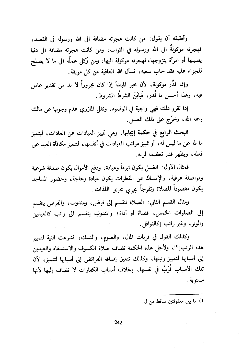 وَتَحْقِيقُهُ أَنْ يَقُولَ مَنْ كَانَتْ هِجْرَتُهُ مُضَافَةً إِلَى اللَّهِ وَرَسُولِهِ فِي الْقَصْدِ فَهِجْرَتُهُ مَوْكُولَةٌ إِلَى اللَّهِ وَرَسُولِهِ فِي الثَّوَابِ وَمَنْ كَانَتْ هِجْرَتُهُ مُضَافَةً إِلَى دُنْيَا يُصِيبُهَا أَوِ امْرَأَةٍ يَتَزَوَّجُهَا فَهِجْرَتُهُ مَوْكُولَةٌ إِلَيْهَا وَمَنْ وُكِلَ عَمَلُهُ إِلَى مَا لَا يَصْلُحُ لِلْجَزَاءِ عَلَيْهِ فَقَدْ خَابَ سَعْيُهُ نَسْأَلُ اللَّهَ الْعَافِيَةَ مِنْ كُلِّ مُوبِقَةٍ. وَإِنَّمَا قُدِّرَ مَوْكُولَةٌ لِأَنَّ خَبَرَ الْمُبْتَدَأِ إِذَا كَانَ مَجْرُورًا لَا بُدَّ مِنْ تَقْدِيرِ عَامِلٍ فِيهِ وَهَذَا أَحْسَنُ مَا قُدِّرَ فَبَايَنَ الشَّرْطُ الْمَشْرُوطَ. إِذَا تَقَرَّرَ ذَلِكَ فَهِيَ وَاجِبَةٌ فِي الْوُضُوءِ وَنَقَلَ الْمَازِرِيُّ عَدَمَ وُجُوبِهَا عَنْ مَالِكٍ رَحِمَهُ اللَّهُ وَخَرَّجَ عَلَى ذَلِكَ الْغُسْلَ. الْبَحْثُ الرَّابِعُ فِي حِكْمَةِ إِيجَابِهَا وَهِيَ تَمْيِيزُ الْعِبَادَات عَن الْعَادَات ليتميز مَا لله عَن مَا لَيْسَ لَهُ أَوْ تَمْيِيزُ مَرَاتِبِ الْعِبَادَاتِ فِي أَنْفُسِهَا لِتَتَمَيَّزَ مُكَافَأَةُ الْعَبْدِ عَلَى فِعْلِهِ وَيَظْهَرُ قَدْرُ تَعْظِيمِهِ لِرَبِّهِ. فَمِثَالُ الْأَوَّلِ الْغُسْلُ يَكُونُ تَبَرُّدًا وَعِبَادَةً وَدَفْعُ الْأَمْوَالِ يَكُونُ صَدَقَةً شَرْعِيَّةً وَمُوَاصَلَةً عُرْفِيَّةً وَالْإِمْسَاكُ عَنِ الْمُفْطِرَاتِ يَكُونُ عِبَادَةً وَحَاجَةً وَحُضُورُ الْمَسَاجِدِ يَكُونُ مَقْصُودًا لِلصَّلَاةِ وَتَفَرُّجًا يَجْرِي مَجْرَى اللَّذَّاتِ. وَمِثَالُ الْقِسْمِ الثَّانِي الصَّلَاةُ تَنْقَسِم إِلَى فرص وَمَنْدُوبٍ وَالْفَرْضُ يَنْقَسِمُ إِلَى الصَّلَوَاتِ الْخَمْسِ قَضَاءً أَوْ أَدَاءً وَالْمَنْدُوبُ يَنْقَسِمُ إِلَى رَاتِبٍ كَالْعِيدَيْنِ وَالْوِتْرِ وَغَيْرِ رَاتِبٍ كَالنَّوَافِلِ. وَكَذَلِكَ الْقَوْلُ فِي قُرُبَاتِ الْمَالِ وَالصَّوْمِ وَالنُّسُكِ فَشُرِعَتِ النِّيَّةُ لِتَمْيِيزِ هَذِهِ الرُّتَبِ وَلِأَجْلِ هَذِهِ الْحِكْمَةِ تُضَافُ صَلَاةُ الْكُسُوفِ وَالِاسْتِسْقَاءِ وَالْعِيدَيْنِ إِلَى أَسْبَابِهَا لِتَمْيِيزِ رُتْبَتِهَا وَكَذَلِكَ تَتَعَيَّنُ إِضَافَةُ الْفَرَائِضِ إِلَى أَسْبَابِهَا لِتَتَمَيَّزَ لِأَنَّ تِلْكَ الْأَسْبَابَ قُرَبٌ فِي نَفْسِهَا بِخِلَافِ أَسْبَابِ الْكَفَّارَاتِ لَا تُضَافُ إِلَيْهَا لِأَنَّهَا مُسْتَوِيَةٌ.