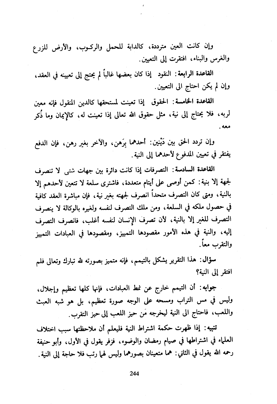 وَإِنْ كَانَتِ الْعَيْنُ مُتَرَدِّدَةً كَالدَّابَّةِ لِلْحَمْلِ وَالرُّكُوبِ وَالْأَرْضِ لِلزَّرْعِ وَالْغَرْسِ وَالْبِنَاءِ افْتَقَرَتْ إِلَى التَّعْيِينِ. الْقَاعِدَةُ الرَّابِعَةُ النُّقُودُ إِذَا كَانَ بَعْضُهَا غَالِبًا لَمْ يُحْتَجْ إِلَى تَعْيِينِهِ فِي الْعَقْدِ وَإِنْ لَمْ يَكُنِ احْتَاجَ إِلَى التَّعْيِينِ. الْقَاعِدَةُ الْخَامِسَةُ الْحُقُوقُ إِذَا تَعَيَّنَتْ لِمُسْتَحِقِّهَا كَالدَّيْنِ الْمَنْقُولِ فَإِنَّهُ مُعَيَّنٌ لِرَبِّهِ فَلَا يَحْتَاجُ إِلَى نِيَّةٍ مِثْلَ حُقُوقِ اللَّهِ تَعَالَى إِذَا تَعَيَّنَتْ لَهُ كَالْإِيمَانِ وَمَا ذُكِرَ مَعَهُ. وَإِنْ تَرَدَّدَ الْحَقُّ بَيْنَ دَيْنَيْنِ أَحَدُهُمَا بِرَهْنٍ وَالْآخَرُ بِغَيْرِ رَهْنٍ فَإِنَّ الدَّفْعَ يَفْتَقِرُ فِي تَعْيِينِ الْمَدْفُوعِ لِأَحَدِهِمَا إِلَى النِّيَّةِ. الْقَاعِدَةُ السَّادِسَةُ التَّصَرُّفَاتُ إِذَا كَانَتْ دَائِرَةً بَيْنَ جِهَاتٍ شَتَّى لَا تَنْصَرِفُ لِجِهَةٍ إِلَّا بِنِيَّةٍ كَمَنْ أَوْصَى عَلَى أَيْتَامٍ مُتَعَدِّدَةٍ فَاشْتَرَى سِلْعَةً لَا تَتَعَيَّنُ لِأَحَدِهِمْ إِلَّا بِالنِّيَّةِ وَمَتَى كَانَ التَّصَرُّفُ مُتَّحِدًا انْصَرَفَ لِجِهَتِهِ بِغَيْرِ نِيَّةٍ فَإِنَّ مُبَاشَرَةَ الْعَقْدِ كَافِيَةٌ فِي حُصُولِ مُلْكِهِ فِي السِّلْعَةِ وَمَنْ مَلَكَ التَّصَرُّفَ لِنَفْسِهِ وَلِغَيْرِهِ بِالْوَكَالَةِ لَا يَنْصَرِفُ التَّصَرُّفُ لِلْغَيْرِ إِلَّا بِالنِّيَّةِ لِأَنَّ تَصَرُّفَ الْإِنْسَانِ لِنَفْسِهِ أَغْلَبُ فَانْصَرَفَ التَّصَرُّفُ إِلَيْهِ وَالنِّيَّةُ فِي هَذِهِ الْأُمُورِ مَقْصُودُهَا التَّمْيِيزُ وَمَقْصُودُهَا فِي الْعِبَادَاتِ التَّمْيِيزُ وَالتَّقَرُّبُ مَعًا. سُؤَالٌ هَذَا التَّقْرِير يُشْكِلُ بِالتَّيَمُّمِ فَإِنَّهُ مُتَمَيِّزٌ بِصُورَتِهِ لِلَّهِ تَبَارَكَ وَتَعَالَى فَلِمَ افْتَقَرَ إِلَى النِّيَّةِ؟ جَوَابُهُ أَنَّ التَّيَمُّمَ خَارِجٌ عَنْ نَمَطِ الْعِبَادَاتِ فَإِنَّهَا كُلَّهَا تَعْظِيمٌ وَإِجْلَالٌ وَلَيْسَ فِي مَسِّ التُّرَابِ وَمَسْحِهِ عَلَى الْوَجْهِ صُورَةُ تَعْظِيمٍ بَلْ هُوَ شِبْهُ الْعَبَثِ وَاللَّعِبِ فَاحْتَاجَ إِلَى النِّيَّةِ لِيُخْرِجَهُ مِنْ حَيِّزِ اللَّعِبِ إِلَى حَيِّزِ التَّقَرُّبِ. تَنْبِيهٌ إِذَا ظَهَرَتْ حِكْمَةُ اشْتِرَاطِ النِّيَّةِ فَلْيُعْلَمْ أَنَّ مُلَاحَظَتَهَا سَبَبُ اخْتِلَافِ الْعُلَمَاءِ فِي اشْتِرَاطِهَا فِي صِيَامِ رَمَضَان وَالْوُضُوء فزفر يَقُول فِي الأول وَأَبُو حنيفَة رَحمَه الله يَقُولُ فِي الثَّانِي هُمَا مُتَعَيِّنَانِ بِصُوَرِهِمَا وَلَيْسَ لَهُمَا رُتَبٌ فَلَا حَاجَةَ إِلَى النِّيَّةِ