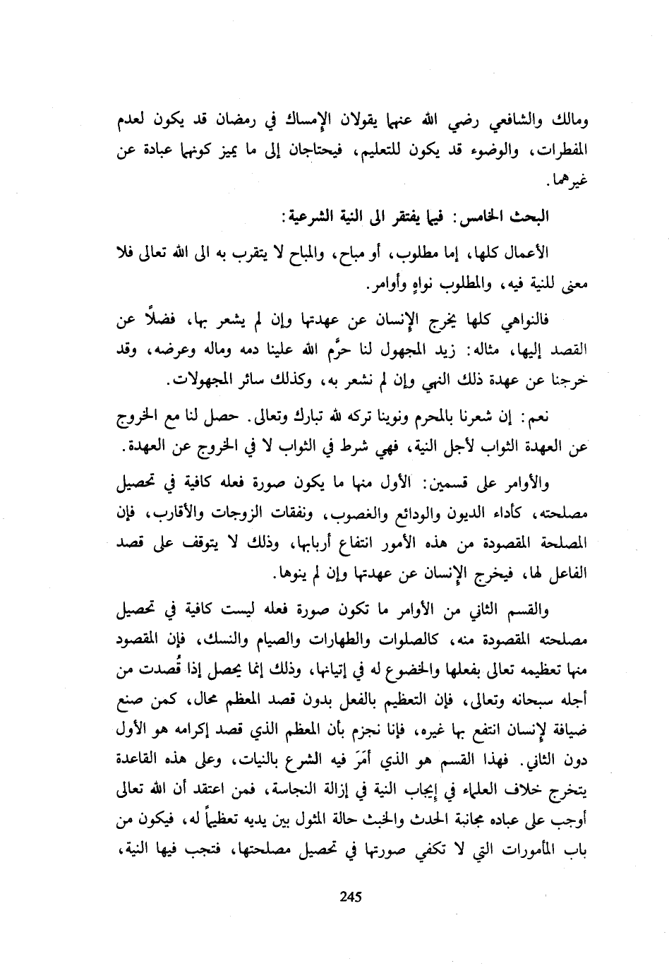 وَمَالك وَالشَّافِعِيّ رَضِيَ اللَّهُ عَنْهُمَا يَقُولَانِ الْإِمْسَاكُ فِي رَمَضَانَ قَدْ يَكُونُ لِعَدَمِ الْمُفْطِرَاتِ وَالْوُضُوءُ قَدْ يَكُونُ لِلتَّعْلِيمِ فَيَحْتَاجَانِ إِلَى مَا يُمَيِّزُ كَوْنَهُمَا عِبَادَةً عَنْ غَيْرِهِمَا. الْبَحْثُ الْخَامِسُ فِيمَا يَفْتَقِرُ إِلَى النِّيَّةِ الشَّرْعِيَّةِ الْأَعْمَالُ كُلُّهَا إِمَّا مَطْلُوبٌ أَوْ مُبَاحٌ وَالْمُبَاحُ لَا يُتَقَرَّبُ بِهِ إِلَى اللَّهِ تَعَالَى فَلَا مَعْنَى لِلنِّيَّةِ فِيهِ وَالْمَطْلُوبُ نَوَاهٍ وَأَوَامِرٌ. فَالنَّوَاهِي كُلُّهَا يُخْرِجُ الْإِنْسَانَ عَنْ عُهْدَتِهَا وَإِنْ لَمْ يَشْعُرْ بِهَا فَضْلًا عَنِ الْقَصْدِ إِلَيْهَا مِثَالُهُ زَيْدٌ الْمَجْهُولُ لَنَا حَرَّمَ اللَّهُ عَلَيْنَا دَمَهُ وَمَالَهُ وَعِرْضَهُ وَقَدْ خَرَجْنَا عَنْ عُهْدَةِ ذَلِكَ النَّهْيِ وَإِنْ لَمْ نَشْعُرْ بِهِ وَكَذَلِكَ سَائِرُ الْمَجْهُولَاتِ. نَعَمْ إِنْ شَعَرْنَا بِالْمُحَرَّمِ وَنَوَيْنَا تَرْكَهُ لِلَّهِ تَبَارَكَ وَتَعَالَى حَصَلَ لَنَا مَعَ الْخُرُوجِ عَنِ الْعُهْدَةِ الثَّوَابُ لِأَجْلِ النِّيَّةِ فَهِيَ شَرْطٌ فِي الثَّوَابِ لَا فِي الْخُرُوجِ عَنِ الْعُهْدَةِ. وَالْأَوَامِرُ عَلَى قِسْمَيْنِ الْأَوَّلُ مِنْهَا مَا يَكُونُ صُورَةُ فِعْلِهِ كَافِيَةً فِي تَحْصِيلِ مَصْلَحَتِهِ كَأَدَاءِ الدُّيُونِ وَالْوَدَائِعِ وَالْغُصُوبِ وَنَفَقَاتِ الزَّوْجَاتِ وَالْأَقَارِبِ فَإِنَّ الْمَصْلَحَةَ الْمَقْصُودَةَ مِنْ هَذِهِ الْأُمُورِ انْتِفَاعُ أَرْبَابِهَا وَذَلِكَ لَا يَتَوَقَّفُ عَلَى قَصْدِ الْفَاعِلِ لَهَا فَيُخْرِجُ الْإِنْسَانَ عَنْ عُهْدَتِهَا وَإِنْ لَمْ يَنْوِهَا. وَالْقِسْمُ الثَّانِي مِنَ الْأَوَامِرِ مَا تَكُونُ صُورَةُ فِعْلِهِ لَيْسَتْ كَافِيَةً فِي تَحْصِيلِ مَصْلَحَتِهِ الْمَقْصُودَةِ مِنْهُ كَالصَّلَوَاتِ وَالطَّهَارَاتِ وَالصِّيَامِ وَالنُّسُكِ فَإِنَّ الْمَقْصُودَ مِنْهَا تَعْظِيمُهُ تَعَالَى بِفِعْلِهَا وَالْخُضُوعُ لَهُ فِي إِتْيَانِهَا وَذَلِكَ إِنَّمَا يَحْصُلُ إِذَا قُصِدَتْ مِنْ أَجْلِهِ سُبْحَانَهُ وَتَعَالَى فَإِنَّ التَّعْظِيمَ بِالْفِعْلِ بِدُونِ قَصْدِ الْمُعَظَّمِ مُحَالٌ كَمَنْ صَنَعَ ضِيَافَةً لِإِنْسَانٍ انْتَفَعَ بِهَا غَيْرُهُ فَإِنَّا نَجْزِمُ بِأَنَّ الْمُعَظَّمُ الَّذِي قُصِدَ إِكْرَامُهُ هُوَ الْأَوَّلُ دُونَ الثَّانِي فَهَذَا الْقِسْمُ هُوَ الَّذِي أَمَرَ فِيهِ الشَّرْعُ بِالنِّيَّاتِ وَعَلَى هَذِهِ الْقَاعِدَةِ يَتَخَرَّجُ خِلَافُ الْعُلَمَاءِ فِي إِيجَابِ النِّيَّةِ فِي إِزَالَةِ النَّجَاسَةِ فَمَنِ اعْتَقَدَ أَنَّ اللَّهَ تَعَالَى أَوْجَبَ عَلَى عِبَادِهِ مُجَانَبَةَ الْحَدَثِ وَالْخَبَثِ حَالَةَ الْمُثُولِ بَيْنَ يَدَيْهِ تَعْظِيمًا لَهُ فَيَكُونُ مِنْ بَابِ الْمَأْمُورَاتِ الَّتِي لَا تَكْفِي صُورَتُهَا فِي تَحْصِيلِ مَصْلَحَتِهَا فَتَجِبُ فِيهَا النِّيَّةُ
