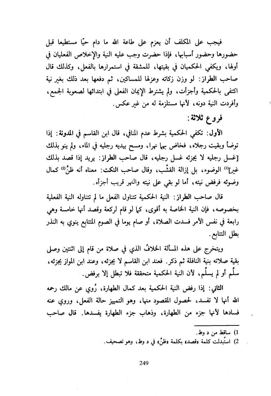 فَيَجِبُ عَلَى الْمُكَلَّفِ أَنْ يَعْزِمَ عَلَى طَاعَةِ اللَّهِ مَا دَامَ حَيًّا مُسْتَطِيعًا قَبْلَ حُضُورِهَا وَحُضُورِ أَسْبَابِهَا فَإِذَا حَضَرَتْ وَجَبَ عَلَيْهِ النِّيَّةُ وَالْإِخْلَاص الفعليات فِي أَوَّلِهَا وَيَكْفِي الْحُكْمِيَّانِ فِي بَقِيَّتِهَا لِلْمَشَقَّةِ فِي اسْتِمْرَارِهَا بِالْفِعْلِ وَكَذَلِكَ قَالَ صَاحِبُ الطَّرَّازِ لَوْ وَزَنَ زَكَاتَهُ وَعَزَلَهَا لِلْمَسَاكِينِ ثُمَّ دَفَعَهَا بَعْدَ ذَلِكَ بِغَيْرِ نِيَّةٍ اكْتَفَى بِالْحُكْمِيَّةِ وَأَجْزَأَتْ وَلَمْ يُشْتَرَطِ الْإِيمَانُ الْفِعْلِيُّ فِي ابْتِدَائِهَا لِصُعُوبَةِ الْجَمْعِ وَأَفْرَدَتِ النِّيَّةَ دُونَهُ لِأَنَّهَا مُسْتَلْزَمَةٌ لَهُ مِنْ غَيْرِ عَكْسٍ. فُرُوعٌ ثَلَاثَةٌ: الْأَوَّلُ تَكْفِي الْحكمِيَّة بشرك عَدَمِ الْمُنَافِي قَالَ ابْنُ الْقَاسِمِ فِي الْمُدَوَّنَةِ إِذَا تَوَضَّأَ وَبَقِيَتْ رِجْلَاهُ فَخَاضَ بِهَا نَهْرًا وَمَسَحَ بِيَدَيْهِ رِجْلَيْهِ فِي الْمَاءِ وَلَمْ يَنْوِ بِذَلِكَ غَسْلَ رِجْلَيْهِ لَا يُجْزِئُهُ غَسْلُ رِجْلَيْهِ قَالَ صَاحِبُ الطَّرَّازِ يُرِيدُ إِذَا قَصَدَ بِذَلِكَ غَيْرَ الْوُضُوءِ بَلْ إِزَالَةَ الْقَشْبِ وَقَالَ صَاحِبُ النكت مَعْنَاهُ أَنه ظن كَمَال وضوءه فَرَفَضَ نِيَّتَهُ أَمَّا لَوْ بَقِيَ عَلَى نِيَّتِهِ وَالنَّهْرُ قَرِيبٌ أَجْزَأَهُ. قَالَ صَاحِبُ الطَّرَّازِ النِّيَّةُ الْحُكْمِيَّةُ تَتَنَاوَلُ الْفِعْلَ مَا لَمْ تَتَنَاوَلْهُ النِّيَّةُ الْفِعْلِيَّةُ بِخُصُوصِهِ فَإِنَّ النِّيَّةَ الْخَاصَّةَ بِهِ أَقْوَى كَمَا لَوْ قَامَ لِرَكْعَةٍ وَقَصَدَ أَنَّهَا خَامِسَةٌ وَهِيَ رَابِعَةٌ فِي نَفْسِ الْأَمْرِ فَسَدَتِ الصَّلَاةُ أَوْ صَامَ يَوْمًا فِي الصَّوْمِ الْمُتَتَابِعِ يَنْوِي بِهِ النَّذْرَ بَطَلَ التَّتَابُعُ وَيَتَخَرَّجُ عَلَى هَذِهِ الْمَسْأَلَةِ الْخِلَافُ الَّذِي فِي صَلَاةِ مَنْ قَامَ إِلَى اثْنَيْنِ وَصَلَّى بَقِيَّةَ صَلَاتِهِ بِنِيَّةِ النَّافِلَةِ ثُمَّ ذَكَرَ فَعِنْدَ ابْنِ الْقَاسِمِ لَا يُجْزِئُهُ وَعِنْدَ ابْنِ الْمَوَّازِ يُجْزِئُهُ سَلَّمَ أَوْ لَمْ يُسَلِّمْ لِأَنَّ النِّيَّةَ الْحُكْمِيَّةَ مُتَحَقِّقَةٌ فَلَا تَبْطُلُ إِلَّا بِرَفْضٍ الثَّانِي إِذَا رَفَضَ النِّيَّةَ الْحُكْمِيَّةَ بَعْدَ كَمَالِ الطَّهَارَةِ رُوِيَ عَنْ مَالِكٍ رَحِمَهُ اللَّهُ أَنَّهَا لَا تَفْسُدُ لِحُصُولِ الْمَقْصُودِ مِنْهَا وَهُوَ التَّمْيِيزُ حَالَةَ الْفِعْلِ وَرُوِيَ عَنْهُ فَسَادُهَا لِأَنَّهَا جُزْءٌ مِنَ الطَّهَارَةِ وَذَهَابُ جُزْءِ الطَّهَارَةِ يُفْسِدُهَا قَالَ صَاحِبُ