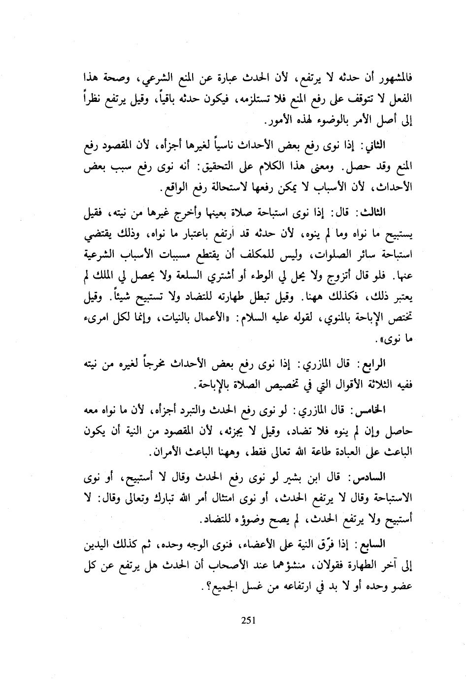 . الرَّابِعُ قَالَ الْمَازِرِيُّ إِذَا نَوَى رَفْعَ بَعْضِ الْأَحْدَاثِ مُخْرِجًا لِغَيْرِهِ مِنْ نِيَّتِهِ فَفِيهِ الثَّلَاثَةُ الْأَقْوَالُ الَّتِي فِي تَخْصِيصِ الصَّلَاةِ بِالْإِبَاحَةِ. الْخَامِسُ قَالَ الْمَازِرِيُّ لَوْ نَوَى رَفْعَ الْحَدَثِ وَالتَّبَرُّدَ أَجْزَأَهُ لَأَنَّ مَا نَوَاهُ مَعَهُ حَاصِلٌ وَإِنْ لَمْ يَنْوِهِ فَلَا تَضَادَّ وَقِيلَ لَا يُجْزِئُهُ لِأَنَّ الْمَقْصُودَ مِنَ النِّيَّةِ أَنْ يَكُونَ الْبَاعِثَ على الْعِبَادَة طَاعَة الله تَعَالَى فَقَط وَهَهُنَا الْبَاعِثُ الْأَمْرَانِ. السَّادِسُ قَالَ ابْنُ بَشِيرٍ لَوْ نَوَى رَفْعَ الْحَدَثِ وَقَالَ لَا أَسْتَبِيحُ أَوْ نَوَى الِاسْتِبَاحَةَ وَقَالَ لَا يَرْتَفِعُ الْحَدَثُ أَوْ نَوَى امْتِثَالَ أَمْرِ اللَّهِ تَبَارَكَ وَتَعَالَى وَقَالَ لَا أَسْتَبِيحُ وَلَا يَرْتَفِعُ الْحَدَثُ لَمْ يَصِحَّ وُضُوؤُهُ لِلتَّضَادِّ. السَّابِعُ إِذَا فَرَّقَ النِّيَّةَ عَلَى الْأَعْضَاءِ فَنَوَى الْوَجْهَ وَحْدَهُ ثُمَّ كَذَلِكَ الْيَدَيْنِ إِلَى آخِرِ الطَّهَارَةِ فَقَوْلَانِ مَنْشَؤُهُمَا عِنْدَ الْأَصْحَابِ أَنَّ الْحَدَثَ هَلْ يَرْتَفِعُ عَنْ كُلِّ عُضْوٍ وَحْدَهُ أَوْ لَا بُدَّ فِي ارْتِفَاعِهِ مِنْ غسل الْجَمِيع؟