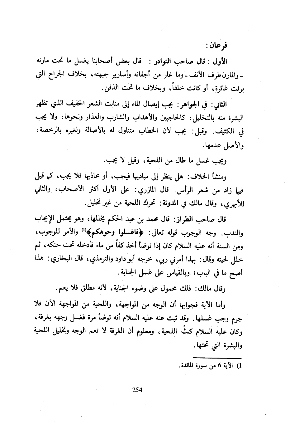 فَرْعَانِ الْأَوَّلُ قَالَ صَاحِبُ النَّوَادِرِ قَالَ بَعْضُ أَصْحَابِنَا يَغْسِلُ مَا تَحْتَ مَارِنِهِ وَالْمَارِنُ طَرَفُ الْأَنْفِ وَمَا غَارَ مِنْ أَجْفَانِهِ وَأَسَارِيرِ جَبْهَتِهِ بِخِلَافِ الْجِرَاحِ الَّتِي بَرِئَتْ غَائِرَةً أَوْ كَانَتْ خَلْقًا وَبِخِلَافِ مَا تَحْتَ الذَّقَنِ الثَّانِي فِي الْجَوَاهِرِ يَجِبُ إِيصَالُ الْمَاءِ إِلَى مَنَابِتِ الشَّعْرِ الْخَفِيفِ الَّذِي تَظْهَرُ الْبَشَرَةُ مِنْهُ بِالتَّخْلِيلِ كَالْحَاجِبَيْنِ وَالْأَهْدَابِ وَالشَّارِبِ وَالْعِذَارِ وَنَحْوِهَا وَلَا يَجِبُ فِي الْكَثِيفِ وَقِيلَ يَجِبُ لِأَنَّ الْخِطَابَ مُتَنَاوِلٌ لَهُ بِالْأَصَالَةِ وَلِغَيْرِهِ بِالرُّخْصَةِ وَالْأَصْلُ عَدَمُهَا وَيَجِبُ غَسْلُ مَا طَالَ مِنَ اللِّحْيَةِ وَقِيلَ لَا يَجِبُ وَمَنْشَأُ الْخِلَافِ هَلْ يُنْظَرُ إِلَى مَبَادِيهَا فَيَجِبُ أَوْ مُحَاذِيهَا فَلَا يَجِبُ كَمَا قِيلَ فِيمَا زَادَ مِنْ شَعْرِ الرَّأْسِ قَالَ الْمَازِرِيُّ عَلَى الْأَوَّلِ أَكْثَرُ الْأَصْحَابِ وَالثَّانِي لِلْأَبْهَرِيِّ وَقَالَ مَالِكٌ فِي الْمُدَوَّنَةِ تُحَرَّكُ اللِّحْيَةُ مِنْ غَيْرِ تَخْلِيلٍ قَالَ صَاحِبُ الطَّرَّازِ قَالَ مُحَمَّدُ بْنُ عَبْدِ الْحَكَمِ يُخَلِّلُهَا وَهُوَ يَحْتَمِلُ الْإِيجَابَ وَالنَّدْبَ وَجْهُ الْوُجُوب قَوْله تَعَالَى {فَاغْسِلُوا وُجُوهكُم} وَالْأَمْرُ لِلْوُجُوبِ وَمِنَ السُّنَّةِ أَنَّهُ عَلَيْهِ السَّلَامُ كَانَ إِذَا تَوَضَّأَ أَخَذَ كَفًّا مِنْ مَاءٍ فَأَدْخَلَهُ تَحْتَ حَنَكِهِ ثُمَّ خَلَّلَ لِحْيَتَهُ وَقَالَ بِهَذَا أَمَرَنِي رَبِّي خَرَّجَهُ أَبُو دَاوُدَ وَالتِّرْمِذِيُّ قَالَ الْبُخَارِيُّ هَذَا أَصَحُّ مَا فِي الْبَابِ وبالقياس على غسل الْجِنَايَة وَقَالَ مَالك ذَلِك مَحْمُول على وضوء الْجِنَايَة لِأَنَّه مُطْلَقٌ فَلَا يَعُمُّ وَأَمَّا الْآيَةُ فَجَوَابُهَا أَنَّ الْوَجْهَ مِنَ الْمُوَاجَهَةِ وَاللِّحْيَةَ مِنَ الْمُوَاجَهَةِ الْآنَ فَلَا جَرَمَ وَجَبَ غَسْلُهَا وَقَدْ ثَبَتَ عَنْهُ عَلَيْهِ السَّلَامُ أَنَّهُ تَوَضَّأَ مَرَّةً فَغَسَلَ وَجْهَهُ بِغُرْفَةٍ وَكَانَ عَلَيْهِ السَّلَامُ كَثَّ اللِّحْيَةِ وَمَعْلُومٌ أَنَّ الْغُرْفَةَ لَا تَعُمُّ الْوَجْهَ وَتَخْلِيلَ اللِّحْيَةِ وَالْبَشَرَةَ الَّتِي تَحْتَهَا
