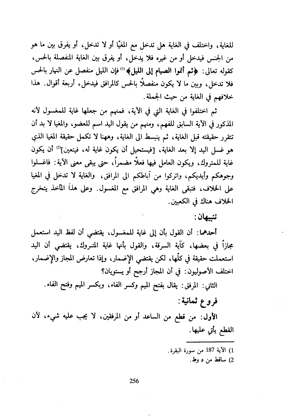 لِلْغَايَةِ وَاخْتُلِفَ فِي الْغَايَةِ هَلْ تَدْخُلُ مَعَ الْمُغَيَّا أَوْ لَا تَدْخُلُ أَوْ يُفَرَّقُ بَيْنَ مَا هُوَ مِنَ الْجِنْسِ فَيَدْخُلُ أَوْ مِنْ غَيْرِهِ فَلَا يَدْخُلُ أَوْ يُفَرَّقُ بَيْنَ الْغَايَةِ الْمُنْفَصِلَةِ بِالْحِسِّ كَقَوْلِهِ تَعَالَى {ثُمَّ أَتِمُّوا الصِّيَامَ إِلَى اللَّيْلِ} فَإِنَّ اللَّيْلَ مُنْفَصِلٌ عَنِ النَّهَارِ بِالْحِسِّ فَلَا تَدْخُلُ وَبَيْنَ مَا لَا يَكُونُ مُنْفَصِلًا بِالْحِسِّ كَالْمَرَافِقِ فَيَدْخُلُ أَرْبَعَةُ أَقْوَالٍ هَذَا خِلَافُهُمْ فِي الْغَايَةِ مِنْ حَيْثُ الْجُمْلَةِ ثُمَّ اخْتَلَفُوا فِي الْغَايَةِ الَّتِي فِي الْآيَةِ فَمِنْهُمْ مَنْ جَعَلَهَا غَايَةً لِلْمَغْسُولِ لِأَنَّه الْمَذْكُورُ فِي الْآيَةِ السَّابِقُ لِلْفَهْمِ وَمِنْهُمْ مَنْ يَقُولُ الْيَدُ اسْمٌ لِلْعُضْوِ والمغيا لَا بُدَّ أَنْ تَتَقَرَّرَ حَقِيقَتُهُ قَبْلَ الْغَايَةِ ثمَّ ينبسط إِلَى الْغَايَة وَهَهُنَا لَا تَكْمُلُ حَقِيقَةُ الْمُغَيَّا الَّذِي هُوَ غَسْلُ الْيَدِ إِلَّا بَعْدَ الْغَايَةِ فَيَسْتَحِيلُ أَنْ يَكُونَ غَايَةً لَهُ فَيَتَعَيَّنُ أَنْ يَكُونَ غَايَةً لِلْمَتْرُوكِ وَيَكُونُ الْعَامِلُ فِيهَا فِعْلًا مُضْمَرًا حَتَّى يَبْقَى مَعْنَى الْآيَةِ فَاغْسِلُوا وُجُوهَكُمْ وَأَيْدِيَكُمْ وَاتْرُكُوا مِنْ آبَاطِكُمْ إِلَى الْمَرَافِقِ وَالْغَايَةُ لَا تَدْخُلُ فِي الْمُغَيَّا عَلَى الْخِلَافِ فَتَبْقَى الْغَايَةُ وَهِيَ الْمَرَافِقُ مَعَ الْمَغْسُولِ وَعَلَى هَذَا الْمَأْخَذِ يَتَخَرَّجُ الْخِلَافُ هُنَاكَ فِي الْكَعْبَيْنِ تَنْبِيهَانِ أَحَدُهُمَا أَنَّ الْقَوْلَ بِأَنَّ إِلَى غَايَةٌ لِلْمَغْسُولِ يَقْتَضِي أَنَّ لَفْظَ الْيَدِ اسْتُعْمِلَ مَجَازًا فِي بَعْضِهَا كَآيَةِ السَّرِقَةِ وَالْقَوْلُ بِأَنَّهَا غَايَةُ الْمَتْرُوكِ يَقْتَضِي أَنَّ الْيَدَ اسْتُعْمِلَتْ حَقِيقَةً فِي كُلِّهَا لَكِنْ يَقْتَضِي الْإِضْمَارَ وَإِذَا تَعَارَضَ الْمَجَازُ وَالْإِضْمَارُ اخْتَلَفَ الْأُصُولِيُّونَ فِي أَنَّ الْمَجَازَ أَرْجَحُ أَوْ يَسْتَوِيَانِ؟ الثَّانِي الْمِرْفَقُ يُقَالُ بِفَتْحِ الْمِيمِ وَكَسْرِ الْفَاءِ وَبِكَسْرِ الْمِيمِ وَفَتْحِ الْفَاءِ فُرُوعٌ ثَمَانِيَةٌ الْأَوَّلُ مَنْ قُطِعَ مِنَ السَّاعِدِ أَوْ مِنَ الْمِرْفَقَيْنِ لَا يَجِبُ عَلَيْهِ شَيْءٌ لِأَنَّ الْقَطْعَ يَأْتِي عَلَيْهَا
