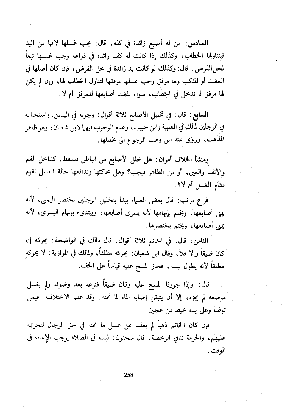 السَّادِسُ مَنْ لَهُ أُصْبُعٌ زَائِدَةٌ فِي كَفِّهِ قَالَ يَجِبُ غَسْلُهَا لِأَنَّهَا مِنَ الْيَدِ فَيَتَنَاوَلُهَا الْخِطَابُ وَكَذَلِكَ إِذَا كَانَتْ لَهُ كَفٌّ زَائِدَةٌ فِي ذِرَاعِهِ وَجَبَ غَسْلُهَا تَبَعًا لِمَحَلِّ الْفَرْضِ قَالَ وَكَذَلِكَ لَوْ كَانَتْ يَدٌ زَائِدَةٌ فِي مَحَلِّ الْفَرْضِ فَإِنْ كَانَ أَصْلُهَا فِي الْعَضُدِ أَوِ الْمَنْكِبِ وَلَهَا مِرْفَقٌ وَجَبَ غَسْلُهَا لِمِرْفَقِهَا لِتَنَاوُلِ الْخِطَابِ لَهَا وَإِنْ لَمْ يَكُنْ لَهَا مِرْفَقٌ لَمْ تَدْخُلْ فِي الْخِطَابِ سَوَاءٌ بَلَغَتْ أَصَابِعُهَا لِلْمِرْفَقِ أَمْ لَا السَّابِعُ قَالَ فِي تَخْلِيلِ الْأَصَابِعِ ثَلَاثَةُ أَقْوَالٍ وُجُوبُهُ فِي الْيَدَيْنِ وَاسْتِحْبَابُهُ فِي الرِّجْلَيْنِ لِمَالِكٍ فِي الْعُتْبِيَّةِ وَابْنِ حَبِيبٍ وَعَدَمُ الْوُجُوبِ فِيهِمَا لِابْنِ شَعْبَانَ وَهُوَ ظَاهِرُ الْمَذْهَبِ وَرَوَى عَنْهُ ابْنُ وَهْبٍ الرُّجُوعَ إِلَى تخليلها وَمَنْشَأُ الْخِلَافِ أَمْرَانِ هَلْ خُلَلُ الْأَصَابِعِ مِنَ الْبَاطِنِ فَيَسْقُطُ كَدَاخِلِ الْفَمِ وَالْأَنْفِ وَالْعَيْنِ أَوْ مِنَ الظَّاهِرِ فَيَجِبُ؟ وَهَلْ مُحَاكَّتُهَا وَتَدَافُعُهَا حَالَةَ الْغسْل تقوم مقَام الْغسْل أَو لَا؟ فَرْعٌ مُرَتَّبٌ قَالَ بَعْضُ الْعُلَمَاءِ يَبْدَأُ بِتَخْلِيلِ الرِّجْلَيْنِ بِخِنْصَرِ الْيُمْنَى لِأَنَّه يُمْنَى أَصَابِعِهَا وَيَخْتِمُ بِإِبْهَامِهَا لِأَنَّه يُسْرَى أَصَابِعِهَا وَيَبْتَدِئُ بِإِبْهَامِ الْيُسْرَى لِأَنَّه يُمْنَى أَصَابِعِهَا وَيَخْتِمُ بِخِنْصَرِهَا الثَّامِنُ قَالَ فِي الْخَاتَمِ ثَلَاثَةُ أَقْوَالٍ قَالَ مَالِكٌ فِي الْوَاضِحَةِ يُحَرِّكُهُ إِنْ كَانَ ضَيِّقًا وَإِلَّا فَلَا وَقَالَ ابْنُ شَعْبَانَ يُحَرِّكُهُ مُطْلَقًا وَلِمَالِكٍ فِي الْمَوَّازِيَّةِ لَا يُحَرِّكُهُ مُطْلَقًا لِأَنَّه يَطُولُ لُبْسُهُ فَجَازَ الْمَسْحُ عَلَيْهِ قِيَاسًا عَلَى الْخُفِّ قَالَ وَإِذَا جَوَّزْنَا الْمَسْحَ عَلَيْهِ وَكَانَ ضَيِّقًا فَنَزَعَهُ بَعْدَ وُضُوئِهِ وَلَمْ يَغْسِلْ مَوْضِعَهُ لَمْ يُجْزِهِ إِلَّا أَنْ يَتَيَقَّنَ إِصَابَةَ الْمَاءِ لِمَا تَحْتَهُ وَقَدْ عُلِمَ الِاخْتِلَافُ فِيمَنْ تَوَضَّأَ وَعَلَى يَدِهِ خَيْطٌ مِنْ عَجِينٍ فَإِنْ كَانَ الْخَاتَمُ ذَهَبًا لَمْ يُعْفَ عَنْ غَسْلِ مَا تَحْتَهُ فِي حَقِّ الرِّجَالِ لِتَحْرِيمِهِ عَلَيْهِمْ وَالْحُرْمَةُ تُنَافِي الرُّخْصَةَ قَالَ سَحْنُونُ لُبْسُهُ فِي الصَّلَاةِ يُوجِبُ الْإِعَادَةَ فِي الْوَقْتِ