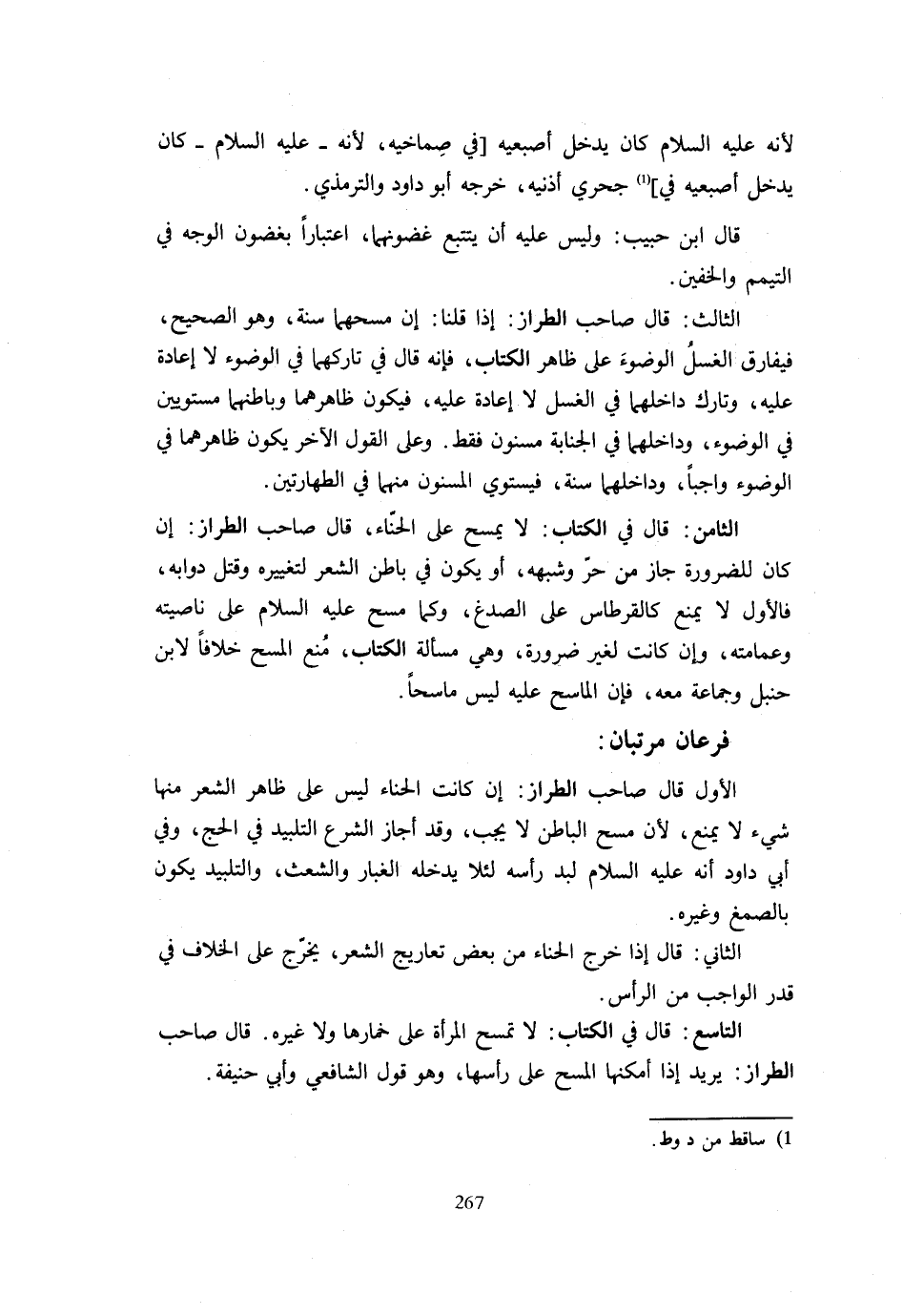 لِأَنَّهُ عَلَيْهِ السَّلَامُ كَانَ يُدْخِلُ أُصْبُعَيْهِ فِي صِمَاخَيْهِ لِأَنَّهُ عَلَيْهِ السَّلَامُ كَانَ يُدْخِلُ أُصْبُعَيْهِ فِي جُحْرَيْ أُذُنَيْهِ خَرَّجَهُ أَبُو دَاوُدَ وَالتِّرْمِذِيُّ. قَالَ ابْنُ حَبِيبٍ وَلَيْسَ عَلَيْهِ أَنْ يَتَتَبَّعَ غُضُونَهُمَا اعْتِبَارًا بِغُضُونِ الْوَجْهِ فِي التَّيَمُّمِ وَالْخُفَّيْنِ. الثَّالِثُ قَالَ صَاحِبُ الطَّرَّازِ إِذَا قُلْنَا إِنَّ مَسْحَهُمَا سُنَّةٌ وَهُوَ الصَّحِيحُ فَيُفَارِقُ الْغَسْلَ وَالْوُضُوءَ عَلَى ظَاهِرِ الْكِتَابِ فَإِنَّهُ قَالَ فِي تَارِكِهِمَا فِي الْوُضُوءِ لَا إِعَادَةَ عَلَيْهِ وَتَارِكِ دَاخِلِهِمَا فِي الْغُسْلِ لَا إِعَادَةَ عَلَيْهِ فَيَكُونُ ظَاهِرُهُمَا وَبَاطِنُهُمَا مُسْتَوِيَيْنِ فِي الْوُضُوءِ وَدَاخِلُهُمَا فِي الْجَنَابَةِ مَسْنُونٌ فَقَطْ وَعَلَى الْقَوْلِ الْآخَرِ يَكُونُ ظَاهِرُهُمَا فِي الْوُضُوءِ وَاجِبًا وَدَاخِلُهُمَا سُنَّةً فَيَسْتَوِي الْمَسْنُونُ مِنْهُمَا فِي الطَّهَارَتَيْنِ. الثَّامِنُ قَالَ فِي الْكِتَابِ لَا يَمْسَحُ عَلَى الْحِنَّاءِ قَالَ صَاحِبُ الطَّرَّازِ إِنْ كَانَ لِلضَّرُورَةِ جَازَ مِنْ حَرٍّ وَشِبْهِهِ أَوْ يَكُونُ فِي بَاطِنِ الشَّعْرِ لِتَغْيِيرِهِ وَقَتْلِ دَوَابِّهِ فَالْأَوَّلُ لَا يَمْنَعُ كَالْقِرْطَاسِ عَلَى الصُّدْغِ وَكَمَا مَسَحَ عَلَيْهِ السَّلَامُ عَلَى نَاصِيَتِهِ وَعِمَامَتِهِ وَإِنْ كَانَتْ لِغَيْرِ ضَرُورَةٍ وَهِيَ مَسْأَلَةُ الْكِتَابِ مُنِعَ الْمَسْحُ خِلَافًا لِابْنِ حَنْبَلٍ وَجَمَاعَةٍ مَعَهُ فَإِنَّ الْمَاسِحَ عَلَيْهِ لَيْسَ مَاسِحًا. فَرْعَانِ مُرَتَّبَانِ: الْأَوَّلُ قَالَ صَاحِبُ الطَّرَّازِ إِنْ كَانَتِ الْحِنَّاءُ لَيْسَ عَلَى ظَاهِرِ الشَّعْرِ مِنْهَا شَيْءٌ لَا يَمْنَعُ لِأَنَّ مَسْحَ الْبَاطِنِ لَا يَجِبُ وَقَدْ أَجَازَ الشَّرْعُ التَّلْبِيدَ فِي الْحَجِّ وَفِي أَبِي دَاوُدَ أَنَّهُ عَلَيْهِ السَّلَامُ لَبَّدَ رَأْسَهُ لِئَلَّا يَدْخُلَهُ الْغُبَارُ وَالشَّعَثُ وَالتَّلْبِيدُ يَكُونُ بِالصَّمْغِ وَغَيْرِهِ. الثَّانِي قَالَ إِذَا خَرَجَ الْحِنَّاءُ مِنْ بَعْضِ تَعَارِيجِ الشَّعْرِ يُخَرَّجُ عَلَى الْخِلَافِ فِي قَدْرِ الْوَاجِبِ مِنَ الرَّأْسِ. التَّاسِعُ قَالَ فِي الْكِتَابِ لَا تَمْسَحُ الْمَرْأَةُ عَلَى خِمَارِهَا وَلَا غَيْرِهِ قَالَ صَاحِبُ الطَّرَّازِ يُرِيدُ إِذَا أَمْكَنَهَا الْمَسْحُ على رَأسهَا وَهُوَ قَول الشَّافِعِي وَأبي حنيفَة.