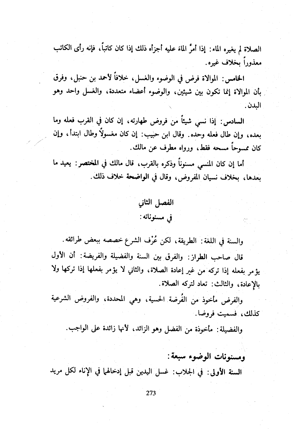 الصَّلَاةِ لَمْ يُغَيِّرْهُ الْمَاءُ إِذَا أَمَرَّ الْمَاءَ عَلَيْهِ أَجْزَأَهُ ذَلِكَ إِذَا كَانَ كَاتِبًا فَإِنَّهُ رَأَى الْكَاتِبَ مَعْذُورًا بِخِلَافِ غَيْرِهِ الْخَامِسُ الْمُوَالَاةُ فَرْضٌ فِي الْوُضُوءِ وَالْغَسْلِ خِلَافًا لِأَحْمَدَ بْنِ حَنْبَلٍ وَفُرِّقَ بِأَنَّ الْمُوَالَاةَ إِنَّمَا تَكُونُ بَيْنَ شَيْئَيْنِ وَالْوُضُوءُ أَعْضَاءٌ مُتَعَدِّدَةٌ وَالْغَسْلُ وَاحِدٌ وَهُوَ الْبَدَنُ السَّادِسُ إِذَا نَسِيَ شَيْئًا مِنْ فُرُوضِ طَهَارَتِهِ إِنْ كَانَ فِي الْقُرْبِ فَعَلَهُ وَمَا بَعْدَهُ وَإِنْ طَالَ فَعَلَهُ وَحْدَهُ وَقَالَ ابْنُ حَبِيبٍ إِنْ كَانَ مَغْسُولًا وَطَالَ ابْتَدَأَ وَإِنْ كَانَ مَمْسُوحًا مَسَحَهُ فَقَطْ وَرَوَاهُ مُطَرِّفٌ عَنْ مَالِكٍ أَمَّا إِنْ كَانَ الْمَنْسِيُّ مَسْنُونًا وَذَكَرَهُ بِالْقُرْبِ قَالَ مَالِكٌ فِي الْمُخْتَصَرِ يُعِيدُ مَا بَعْدَهَا بِخِلَافِ نِسْيَانِ الْمَفْرُوضِ وَقَالَ فِي الْوَاضِحَةِ خلاف ذَلِك