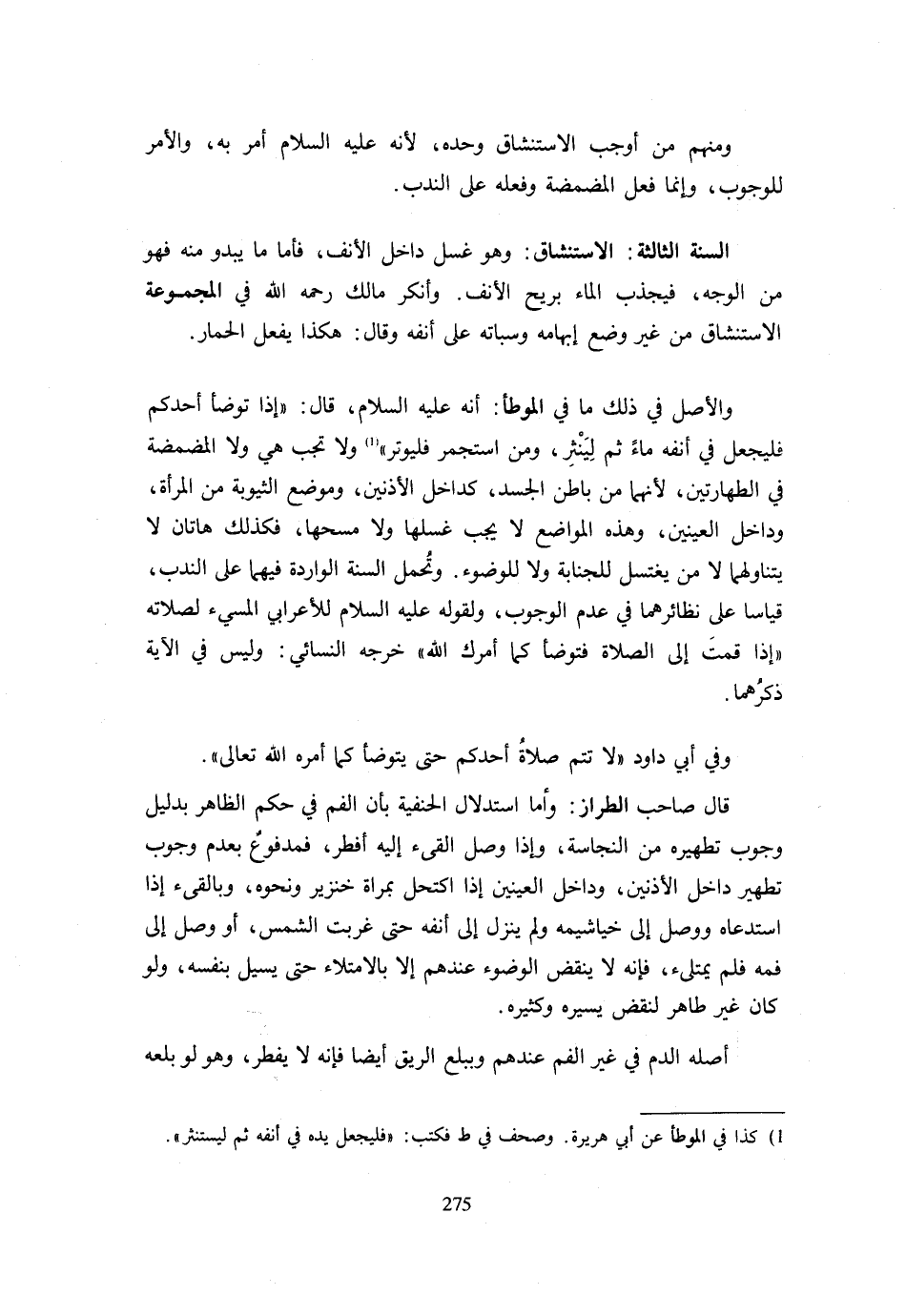 إِذَا تَوَضَّأَ أَحَدُكُمْ فَلْيَجْعَلْ فِي أَنْفِهِ مَاءً ثُمَّ لْيَنْثُرْ وَمَنِ اسْتَجْمَرَ فَلْيُوتِرْ وَلَا تَجِبُ هِيَ وَلَا الْمَضْمَضَةُ فِي الطَّهَارَتَيْنِ لِأَنَّهُمَا مِنْ بَاطِنِ الْجَسَدِ كَدَاخِلِ الْأُذُنَيْنِ وَمَوْضِعِ الثُّيُوبَةِ مِنَ الْمَرْأَةِ وَدَاخِلِ الْعَيْنَيْنِ وَهَذِهِ الْمَوَاضِعُ لَا يَجِبُ غَسْلُهَا وَلَا مَسْحُهَا فَكَذَلِكَ هَاتَانِ لَا يتناولهما مَنْ يَغْتَسِلُ لِلْجَنَابَةِ وَلَا لِلْوُضُوءِ وَتُحْمَلُ السُّنَّةُ الْوَارِدَةُ فِيهِمَا عَلَى النَّدْبِ قِيَاسًا عَلَى نَظَائِرِهِمَا فِي عَدَمِ الْوُجُوبِ وَلِقَوْلِهِ عَلَيْهِ السَّلَامُ لِلْأَعْرَابِيِّ الْمُسِيءِ لِصَلَاتِهِ