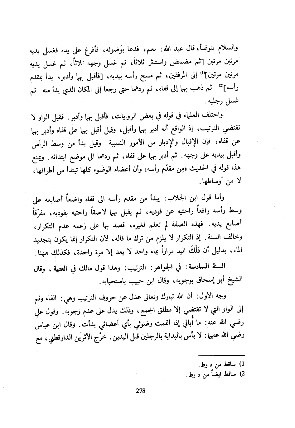 مِنْ مُقَدَّمِ رَأْسِهِ وَأَنَّ أَعْضَاءَ الْوُضُوءِ كُلَّهَا تُبْتَدَأُ مِنْ أَطْرَافِهَا لَا مِنْ أَوْسَاطِهَا. وَأَمَّا قَوْلُ ابْنِ الْجَلَّابِ يَبْدَأُ مِنْ مُقَدَّمِ رَأْسِهِ إِلَى قَفَاهُ وَاضِعا أَصَابِعه عَلَى وَسَطِ رَأْسِهِ رَافِعًا رَاحَتَيْهِ عَنْ فَوْدَيْهِ ثُمَّ يُقْبِلُ بِهِمَا لَاصِقًا رَاحَتَيْهِ بِفَوْدَيْهِ مُفَرِّقًا أَصَابِعَ يَدَيْهِ فَهَذِهِ الصِّفَةُ لَمْ تُعْلَمْ لِغَيْرِهِ قَصَدَ بِهَا عَلَى زَعْمِهِ عَدَمَ التَّكْرَارِ وَخَالَفَ السُّنَّةَ إِذِ التَّكْرَارُ لَا يَلْزَمُ مِنْ تَرْكِ مَا قَالَهُ لِأَنَّ التَّكْرَارَ إِنَّمَا يَكُونُ بِتَجْدِيدِ الْمَاءِ بِدَلِيلِ أَنَّ دَلْكَ الْيَدِ مِرَارًا بِمَاءٍ وَاحِدٍ لَا يُعَدُّ إِلَّا مَرَّةً وَاحِدَةً فَكَذَلِكَ هَهُنَا. السُّنَّةُ السَّادِسَةُ فِي الْجَوَاهِرِ التَّرْتِيبُ وَهَذَا قَوْلُ مَالِكٍ فِي الْعُتْبِيَّةِ وَقَالَ الشَّيْخُ أَبُو إِسْحَاقَ بِوُجُوبِهِ وَقَالَ ابْنُ حَبِيبٍ بِاسْتِحْبَابِهِ. وَجْهُ الْأَوَّلِ أَنَّ اللَّهَ تَبَارَكَ وَتَعَالَى عَدَلَ عَنْ حُرُوفِ التَّرْتِيبِ وَهِيَ الْفَاءُ وَثُمَّ إِلَى الْوَاوِ الَّتِي لَا تَقْتَضِي إِلَّا مُطْلَقَ الْجَمْعِ وَذَلِكَ يَدُلُّ عَلَى عَدَمِ وُجُوبِهِ وَقَوْلُ عَلِيٍّ رَضِيَ اللَّهُ عَنْهُ مَا أُبَالِي إِذَا أَتْمَمْتُ وُضُوئِي بِأَيِّ أَعْضَائِي بَدَأْتُ وَقَالَ ابْنُ عَبَّاسٍ رَضِيَ اللَّهُ عَنْهُمَا لَا بَأْسَ بِالْبِدَايَةِ بِالرِّجْلَيْنِ قَبْلَ الْيَدَيْنِ خَرَّجَ الْأَثَرَيْنِ الدَّارَقُطْنِيُّ مَعَ