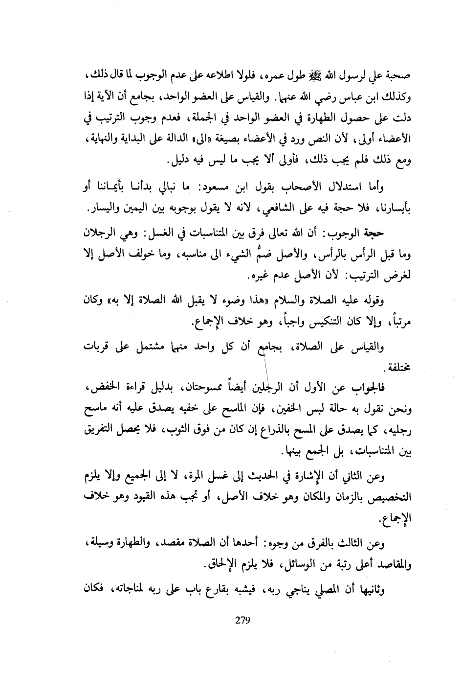 صُحْبَةِ عَلِيٍّ لِرَسُولِ اللَّهِ - صَلَّى اللَّهُ عَلَيْهِ وَسَلَّم َ - طُولَ عُمُرِهِ فَلَوْلَا اطِّلَاعُهُ عَلَى عَدَمِ الْوُجُوبِ لَمَا قَالَ ذَلِكَ وَكَذَلِكَ ابْنُ عَبَّاسٍ رَضِيَ اللَّهُ عَنْهُمَا وَالْقِيَاسُ عَلَى الْعُضْوِ الْوَاحِدِ بِجَامِعِ أَنَّ الْآيَةَ إِذَا دَلَّتْ عَلَى حُصُولِ الطَّهَارَةِ فِي الْعُضْوِ الْوَاحِدِ فِي الْجُمْلَةِ فَعَدَمُ وُجُوبِ التَّرْتِيبِ فِي الْأَعْضَاءِ أَوْلَى لِأَنَّ النَّصَّ وَرَدَ فِي الْأَعْضَاءِ بِصِيغَةِ إِلَى الدَّالَّةِ عَلَى الْبِدَايَةِ وَالنِّهَايَةِ وَمَعَ ذَلِكَ فَلَمْ يَجِبْ ذَلِكَ فَأَوْلَى أَلَّا يَجِبَ مَا لَيْسَ فِيهِ دَلِيلٌ. وَأَمَّا اسْتِدْلَالُ الْأَصْحَابِ بِقَوْلِ ابْنِ مَسْعُودٍ مَا نُبَالِي بَدَأْنَا بِأَيْمَانِنَا أَوْ بِأَيْسَارِنَا فَلَا حُجَّةَ فِيهِ على الشَّافِعِي لِأَنَّهُ لَا يَقُولُ بِوُجُوبِهِ بَيْنَ الْيَمِينِ وَالْيَسَارِ. حُجَّةُ الْوُجُوبِ أَنَّ اللَّهَ تَعَالَى فَرَّقَ بَيْنَ الْمُتَنَاسِبَاتِ فِي الْغَسْلِ وَهِيَ الرِّجْلَانِ وَمَا قَبْلَ الرَّأْسِ بِالرَّأْسِ وَالْأَصْلُ ضَمُّ الشَّيْءِ إِلَى مُنَاسِبِهِ وَمَا خُولِفَ الْأَصْلُ إِلَّا لِغَرَضِ التَّرْتِيبِ لِأَنَّ الْأَصْلَ عَدَمُ غَيْرِهِ. وَقَوْلُهُ عَلَيْهِ الصَّلَاةُ وَالسَّلَامُ