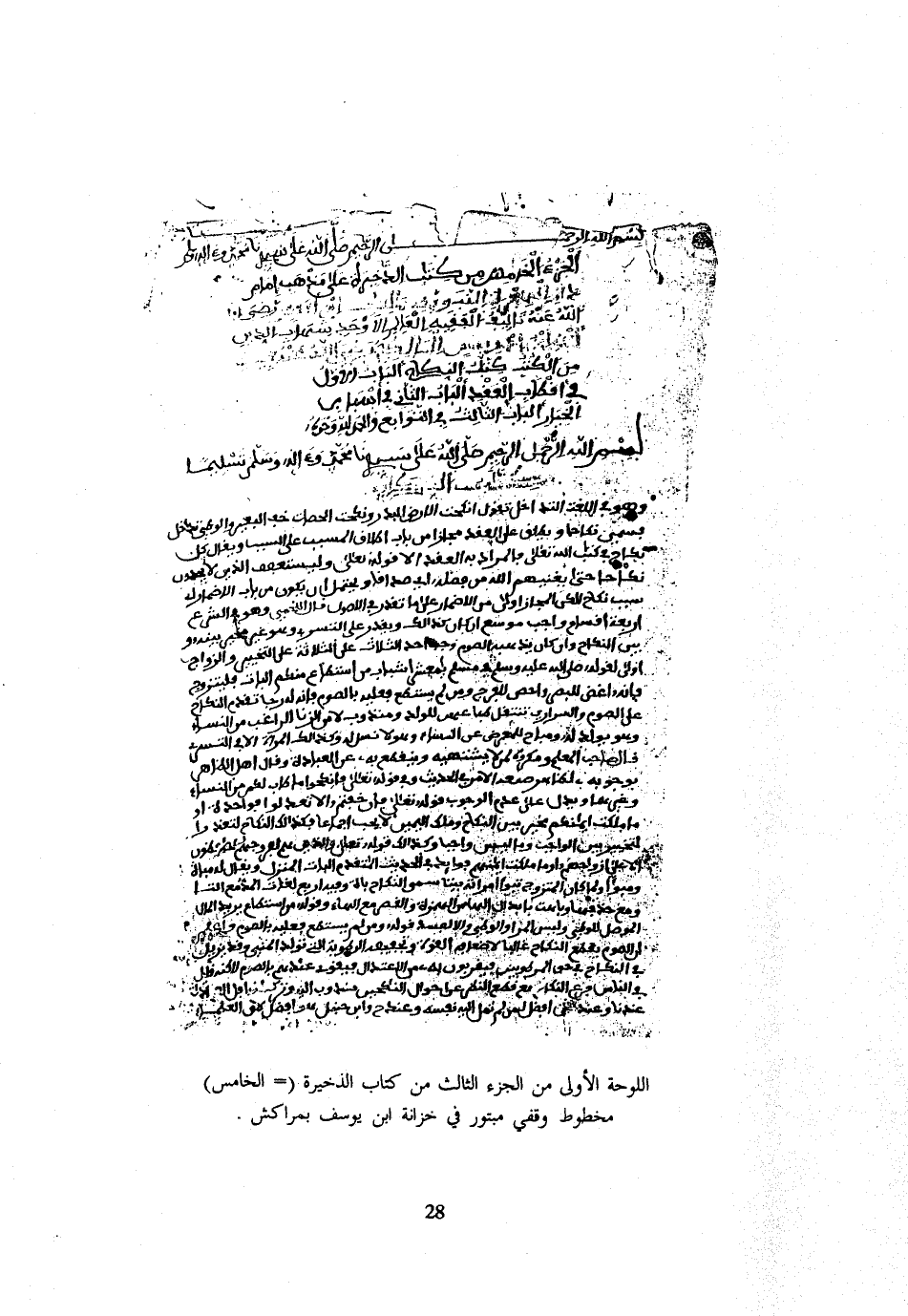 اللوحة الأولى من الْجُزْء الثَّالِث من كتاب الذَّخِيرَة الْخَامِس مخطوط وقفي مبتور فِي خزانَة ابْن يُوسُف بمراكش