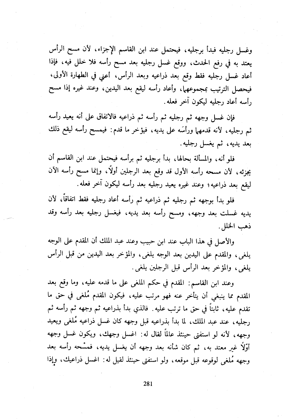 وَغَسْلَ رِجْلَيْهِ فَبَدَأَ بِرِجْلَيْهِ فَيَحْتَمِلُ عِنْدَ ابْنِ الْقَاسِمِ الْإِجْزَاءَ لِأَنَّ مَسْحَ الرَّأْسِ يُعْتَدُّ بِهِ فِي رَفْعِ الْحَدَثِ وَوَقَعَ غَسْلُ رِجْلَيْهِ بَعْدَ مَسْحِ رَأْسِهِ فَلَا خَلَلَ فِيهِ فَإِذَا أَعَادَ غَسْلَ رِجْلَيْهِ فَقَطْ وَقَعَ بَعْدَ ذِرَاعَيْهِ وَبَعْدَ الرَّأْسِ أَعْنِي فِي الطَّهَارَةِ الْأُولَى فَيَحْصُلُ التَّرْتِيبُ بِمَجْمُوعِهِمَا وَأَعَادَ رَأْسَهُ لِيَقَعَ بَعْدَ الْيَدَيْنِ وَعِنْدَ غَيْرِهِ إِذَا مَسَحَ رَأْسَهُ أَعَادَ رِجْلَيْهِ لِيَكُونَ آخِرَ فِعْلِهِ. فَإِنْ غَسَلَ وَجْهَهُ ثُمَّ رِجْلَيْهِ ثُمَّ رَأْسِهِ ثُمَّ ذِرَاعَيْهِ فَالِاتِّفَاقُ عَلَى أَنَّهُ يُعِيدُ رَأْسَهُ ثُمَّ رِجْلَيْهِ لِأَنَّهُ قَدَّمَهُمَا وَرَأْسَهُ عَلَى يَدَيْهِ فَيُؤَخِّرُ مَا قُدِّمَ فَيَمْسَحُ رَأْسَهُ لِيَقَعَ ذَلِكَ بَعْدَ يَدَيْهِ ثُمَّ يَغْسِلُ رِجْلَيْهِ. فَلَوْ أَنَّهُ وَالْمَسْأَلَةُ بِحَالِهَا بَدَأَ بِرِجْلَيْهِ ثُمَّ بِرَأْسِهِ فَيَحْتَمِلُ عِنْدَ ابْنِ الْقَاسِمِ أَنْ يُجْزِئَهُ لِأَنَّ مَسْحَهُ رَأْسَهُ الْأَوَّلَ قَدْ وَقَعَ بَعْدَ الرِّجْلَيْنِ أَوَّلًا وَإِنَّمَا مَسَحَ رَأْسَهُ الْآنَ لِيَقَعَ بَعْدَ ذِرَاعَيْهِ وَعِنْدَ غَيْرِهِ يُعِيدُ رِجْلَيْهِ بَعْدَ رَأسه ليَكُون آخر فعله. فول بَدَأَ بِوَجْهِهِ ثُمَّ رِجْلَيْهِ ثُمَّ ذِرَاعَيْهِ ثُمَّ رَأْسِهِ أَعَادَ رِجْلَيْهِ فَقَطِ اتِّفَاقًا لِأَنَّ يَدَيْهِ غُسِلَتْ بَعْدَ وَجْهِهِ وَمَسَحَ رَأْسَهُ بَعْدَ يَدَيْهِ فَيَغْسِلُ رِجْلَيْهِ بَعْدَ رَأْسِهِ وَقَدْ ذَهَبَ الْخَلَلُ. وَالْأَصْلُ فِي هَذَا الْبَابِ عِنْدَ ابْنِ حَبِيبٍ وَعِنْدَ عَبْدِ الْمَلِكِ أَنَّ الْمُقَدَّمَ عَلَى الْوَجْهِ يُلْغَى وَالْمُقَدَّمَ عَلَى الْيَدَيْنِ بَعْدَ الْوَجْهِ يُلْغَى وَالْمُؤَخَّرَ بَعْدَ الْيَدَيْنِ مِنْ قَبْلِ الرَّأْسِ يُلْغَى وَالْمُؤَخَّرَ بَعْدَ الرَّأْسِ قَبْلَ الرِّجْلَيْنِ يُلْغَى. وَعِنْدَ ابْنِ الْقَاسِمِ الْمُقَدَّمُ فِي حُكْمِ الْمُلْغَى عَلَى مَا قَدَّمَهُ عَلَيْهِ وَمَا وَقَعَ بَعْدَ الْمُقَدَّمِ مِمَّا يَنْبَغِي أَنْ يَتَأَخَّرَ عَنْهُ فَهُوَ مُرَتَّبٌ عَلَيْهِ فَيَكُونُ الْمُقَدَّمُ مُلْغًى فِي حَقِّ مَا تَقَدَّمَ عَلَيْهِ ثَابِتًا فِي حَقِّ مَا تَرَتَّبَ عَلَيْهِ فَالَّذِي بَدَأَ بِذِرَاعَيْهِ ثُمَّ وَجْهِهِ ثُمَّ رَأْسِهِ ثُمَّ رِجْلَيْهِ عِنْدَ عَبْدِ الْمَلِكِ لَمَّا بَدَأَ بِذِرَاعَيْهِ قَبْلَ وَجْهِهِ كَانَ غَسْلُ ذِرَاعَيْهِ مُلْغًى وَيُعِيدُ وَجْهَهُ لِأَنَّهُ لَوِ اسْتَفْتَى حِينَئِذٍ عَالِمًا لَقَالَ لَهُ اغْسِلْ وَجْهَكَ وَيَكُونُ غَسْلُ وَجْهِهِ أَوَّلًا غَيْرَ مُعْتَدٍّ بِهِ ثُمَّ كَانَ شَأْنُهُ بَعْدَ وَجْهِهِ أَنْ يَغْسِلَ يَدَيْهِ فَمَسْحُهُ رَأسه بعد وَجهه ملغى للوقوعه قَبْلَ مَوْقِعِهِ وَلَوِ اسْتَفْتَى حِينَئِذٍ لَقِيلَ لَهُ اغْسِلْ ذِرَاعَيْكَ وَإِذَا أُلْغِيَ مَسْحُ رَأْسِهِ كَانَ الصَّوَابُ أَنْ يَغْسِلَ ذِرَاعَيْهِ فَغَسْلُ رِجْلَيْهِ وَالْحَالَةُ هَذِهِ مُلْغًى لِوُقُوعِهِ فِي غَيْرِ مَوْضِعِهِ فَلَمْ يَبْقَ إِلَّا الْوَجْهُ فَيُعِيدُ مِنْ ذَلِكَ إِلَى آخِرِ وُضُوئِهِ وَعِنْدَ ابْنِ الْقَاسِمِ لَمَّا قَدَّمَ يَدَيْهِ عَلَى الْوَجْهِ كَانَ ذَلِكَ مُلْغًى فِي حَقِّ الْوَجْهِ فَيَقَعُ مَسْحُ رَأْسِهِ بَعْدَ الْيَدَيْنِ وَالْوَجْهِ وَذَلِكَ مَوْضِعُهُ فَرَتَّبَ الرَّأْسَ عَلَى سَبْقِ الْيَدَيْنِ لَهُ وَالرِّجْلَيْنِ عَلَى الرَّأْسِ وَيَبْقَى الْخَلَلُ بَيْنَ الْيَدَيْنِ وَالْوَجْهِ فَقَطْ فَإِذَا أَعَادَ غَسْلَ يَدَيْهِ انْجَبَرَ الْخَلَلُ. وَإِذَا بَدَأَ بِذِرَاعَيْهِ ثُمَّ رَأْسِهِ ثُمَّ وَجْهِهِ ثُمَّ رِجْلَيْهِ ف