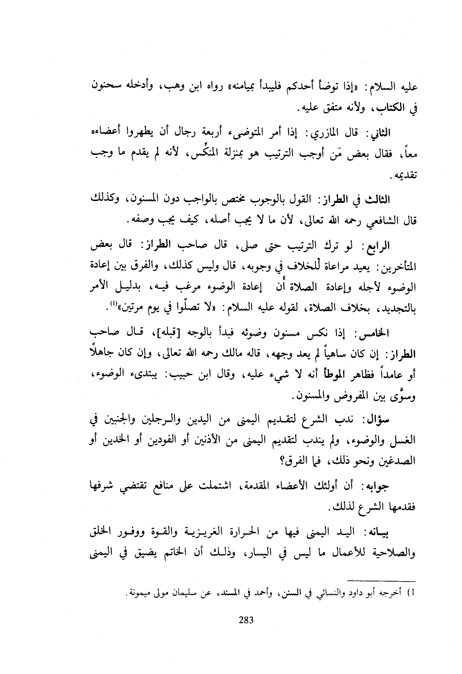 لَا تُصَلُّوا فِي يَوْمٍ مَرَّتَيْنِ. الْخَامِسُ إِذَا نَكَّسَ مَسْنُونُ وُضُوئِهِ فَبَدَأَ بِالْوَجْهِ قَبْلَهُ قَالَ صَاحِبُ الطَّرَّازِ إِنْ كَانَ سَاهِيًا لم يعد وَجهه قَالَ مَالِكٌ رَحِمَهُ اللَّهُ تَعَالَى وَإِنْ كَانَ جَاهِلًا أَوْ عَامِدًا فَظَاهِرُ الْمُوَطَّأِ أَنَّهُ لَا شَيْءَ عَلَيْهِ وَقَالَ ابْنُ حَبِيبٍ يَبْتَدِئُ الْوُضُوءَ وَسَوَّى بَيْنَ الْمَفْرُوضِ وَالْمَسْنُونِ. سُؤَالٌ نَدَبَ الشَّرْعُ لِتَقْدِيمِ الْيُمْنَى مِنَ الْيَدَيْنِ وَالرِّجْلَيْنِ وَالْجَنْبَيْنِ فِي الْغَسْلِ وَالْوُضُوءِ وَلَمْ يَنْدُبْ لِتَقْدِيمِ الْيُمْنَى مِنَ الْأُذُنَيْنِ أَوِ الْفَوْدَيْنِ أَوِ الْخَدَّيْنِ أَوِ الصُّدْغَيْنِ وَنَحْوِ ذَلِكَ فَمَا الْفَرْقُ؟ جَوَابُهُ أَنَّ أُولَئِكَ الْأَعْضَاءَ الْمُقَدَّمَةَ اشْتَمَلَتْ عَلَى مَنَافِعَ تَقْتَضِي شَرَفَهَا فَقَدَّمَهَا الشَّرْعُ لِذَلِكَ. بَيَانُهُ الْيَدُ الْيُمْنَى فِيهَا مِنَ الْحَرَارَةِ الْغَرِيزِيَّةِ وَالْقُوَّةِ وَوُفُورِ الْخَلْقِ وَالصَّلَاحِيَّةِ لِلْأَعْمَالِ مَا لَيْسَ فِي الْيَسَارِ وَذَلِكَ أَنَّ الْخَاتَمَ يَضِيقُ فِي الْيُمْنَى