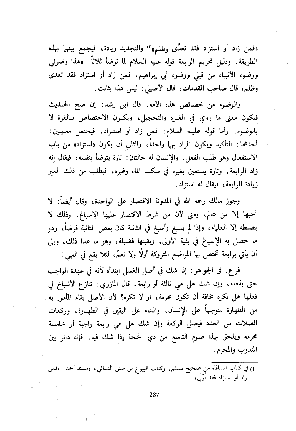 هَذَا وُضُوئِي وَوُضُوءُ الْأَنْبِيَاءِ مِنْ قَبْلِي وَوُضُوءُ أَبِي إِبْرَاهِيمَ فَمَنْ زَادَ أَوِ اسْتَزَادَ فَقَدْ تَعَدَّى وَظَلَمَ قَالَ صَاحِبُ الْمُقَدِّمَاتِ قَالَ الْأَصِيلِيُّ لَيْسَ هَذَا بِثَابِتٍ. وَالْوُضُوءُ مِنْ خَصَائِصِ هَذِهِ الْأُمَّةِ قَالَ ابْنُ رُشْدٍ إِنْ صَحَّ الْحَدِيثُ فَيَكُونُ مَعْنَى مَا رُوِيَ فِي الْغُرَّةِ وَالتَّحْجِيلِ وَيَكُونُ الِاخْتِصَاصُ بِالْغُرَّةِ لَا بِالْوُضُوءِ وَأَمَّا قَوْلُهُ عَلَيْهِ السَّلَامُ فَمَنْ زَادَ أَوِ اسْتَزَادَ فَيَحْتَمِلُ مَعْنَيَيْنِ أَحَدُهُمَا التَّأْكِيدُ وَيَكُونُ الْمُرَادُ بِهِمَا وَاحِدًا وَالثَّانِي أَنْ يَكُونَ اسْتَزَادَ مِنْ بَابِ الِاسْتِفْعَالِ وَهُوَ طَلَبُ الْفِعْلِ وَالْإِنْسَانُ لَهُ حَالَتَانِ تَارَةً يَتَوَضَّأُ بِنَفْسِهِ فَيُقَالُ إِنَّهُ زَادَ الرَّابِعَةَ وَتَارَةً يَسْتَعِينُ بِغَيْرِهِ فِي سَكْبِ الْمَاءِ وَغَيْرِهِ فَيَطْلُبُ مِنْ ذَلِكَ الْغَيْرِ زِيَادَةَ الرَّابِعَةِ فَيُقَالُ لَهُ اسْتَزَادَ. وَجَوَّزَ مَالِكٌ رَحِمَهُ اللَّهُ فِي الْمُدَوَّنَةِ الِاقْتِصَارَ عَلَى الْوَاحِدَةِ وَقَالَ أَيْضًا لَا أُحِبُّهَا إِلَّا مِنْ عَالِمٍ يَعْنِي لِأَنَّ مِنْ شَرط الِاقْتِصَار عَلَيْهَا الإسباغ وَذَلِكَ لَا بضبطه إِلَّا الْعُلَمَاءُ وَإِذَا لَمْ يُسْبِغْ وَأَسْبَغَ فِي الثَّانِيَةِ كَانَ بَعْضُ الثَّانِيَةِ فَرْضًا وَهُوَ مَا حَصَلَ بِهِ الْإِسْبَاغُ فِي بَقِيَّةِ الْأُولَى وَبَقِيَّتُهَا فَضِيلَةٌ وَهُوَ مَا عَدَا ذَلِكَ وَإِلَى أَنْ يَأْتِيَ بِرَابِعَةٍ تَخْتَصُّ بِهَا الْمَوَاضِعُ الْمَتْرُوكَةُ أَوَّلًا وَلَا تَعُمُّ لِئَلَّا يَقَعَ فِي النَّهْيِ. فَرْعٌ فِي الْجَوَاهِرِ إِذَا شَكَّ فِي أَصْلِ الْغَسْلِ ابْتَدَأَهُ لِأَنَّهُ فِي عُهْدَةِ الْوَاجِبِ حَتَّى يَفْعَلَهُ وَإِنْ شَكَّ هَلْ هِيَ ثَالِثَةٌ أَوْ رَابِعَةٌ قَالَ الْمَازِرِيُّ تَنَازَعَ الْأَشْيَاخُ فِي فِعْلِهَا هَلْ تُكْرَهُ مَخَافَةَ أَنْ تَكُونَ مُحَرَّمَةً أَوْ لَا تُكْرَهُ لِأَنَّ الْأَصْلَ بَقَاءُ الْمَأْمُورِ بِهِ مِنَ الطَّهَارَةِ مُتَوَجِّهًا عَلَى الْإِنْسَانِ وَالْبِنَاءُ عَلَى الْيَقِينِ فِي الطَّهَارَة وركعات الصلات مِنَ الْعَدَدِ فَيُصَلِّي الرَّكْعَةَ وَإِنْ شَكَّ هَلْ هِيَ رَابِعَةٌ وَاجِبَةٌ أَوْ خَامِسَةٌ مُحَرَّمَةٌ وَيَلْحَقُ بِهَذَا صَوْمُ التَّاسِعِ مِنْ ذِي الْحِجَّةِ إِذَا شَكَّ فِيهِ فَإِنَّهُ دَائِرٌ بَيْنَ الْمَنْدُوبِ وَالْمُحَرَّمِ