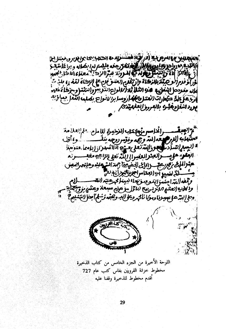 اللوحة الْأَخِيرَة من الْجُزْء الْخَامِس من كتاب الذَّخِيرَة مخطوط خزانَة الْقرَوِيين بفاس كتب عَام 727 أقدم مخطوط للذخيرة وقفنا عَلَيْهِ