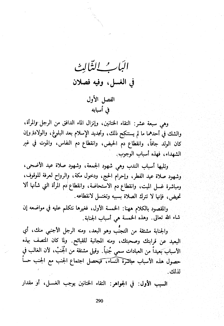 وَهِيَ سَبْعَةَ عَشَرَ الْتِقَاءُ الْخِتَانَيْنِ وَإِنْزَالُ الْمَاءِ الدَّافِقِ مِنَ الرَّجُلِ وَالْمَرْأَةِ وَالشَّكُّ فِي أَحَدِهِمَا مَا لَمْ يُسْتَنْكَحْ ذَلِكَ وَتَجْدِيدُ الْإِسْلَامِ بَعْدَ الْبُلُوغِ وَالْوِلَادَةُ وَإِنْ كَانَ الْوَلَدُ جَافًّا وَانْقِطَاعُ دَمِ الْحَيْضِ وَانْقِطَاعُ دَمِ النِّفَاسِ وَالْمَوْتُ فِي غَيْرِ الشُّهَدَاءِ فَهَذِهِ أَسْبَابُ الْوُجُوبِ وَتَلِيهَا أَسْبَابُ النَّدْبِ وَهِيَ شُهُودُ الْجُمُعَةِ وَشُهُودُ صَلَاةِ عِيدِ الْأَضْحَى وَشُهُودُ صَلَاةِ عِيدِ الْفِطْرِ وَإِحْرَامُ الْحَجِّ وَدُخُولُ مَكَّةَ وَالرَّوَاحُ لِعَرَفَةَ لِلْوُقُوفِ وَمُبَاشَرَةُ غُسْلِ الْمَيِّتِ وَانْقِطَاعُ دَمِ الِاسْتِحَاضَةِ وَانْقِطَاعُ دَمِ الْمَرْأَةِ الَّتِي شَأْنُهَا أَلَّا تَحِيضَ فَإِنَّهَا لَا تَتْرُكُ الصَّلَاةَ بِسَبَبِهِ وَتَغْتَسِلُ لِانْقِطَاعِهِ وَالْمَقْصُود بالْكلَام هَهُنَا الْخَمْسَةُ الْأُوَلُ فَغَيْرُهَا نَتَكَلَّمُ عَلَيْهِ فِي مَوَاضِعِهِ إِنْ شَاءَ اللَّهُ تَعَالَى وَهَذِهِ الْخَمْسَةُ هِيَ أَسْبَابُ الْجَنَابَةِ وَالْجَنَابَةُ مُشْتَقَّةٌ مِنَ التَّجَنُّبِ وَهُوَ الْبُعْدُ وَمِنْهُ الرَّجُلُ الْأَجْنَبِيُّ مِنْكَ أَيِ الْبَعِيدُ عَنْ قَرَابَتِكَ وَصُحْبَتِكَ وَمِنْهُ الْمَجَانَبَةُ لِلْقَبَائِحِ وَلَمَّا كَانَ الْمُتَّصِفُ بِهَذِهِ الْأَسْبَابِ بَعِيدًا مِنَ الْعِبَادَاتِ سُمِّيَ جُنُبًا وَقِيلَ مُشْتَقَّةٌ مِنَ الْجَنْبِ لِأَنَّ الْغَالِبَ فِي حُصُولِ هَذِهِ الْأَسْبَابِ مُبَاشَرَةُ النِّسَاءِ فَيَحْصُلُ اجْتِمَاعُ الْجَنْبِ مَعَ الْجَنْبِ حِسًّا لِذَلِكَ السَّبَبُ الْأَوَّلُ فِي الْجَوَاهِرِ الْتِقَاءُ الْخِتَانَيْنِ يُوجِبُ الْغُسْلَ أَوْ مِقْدَارُ