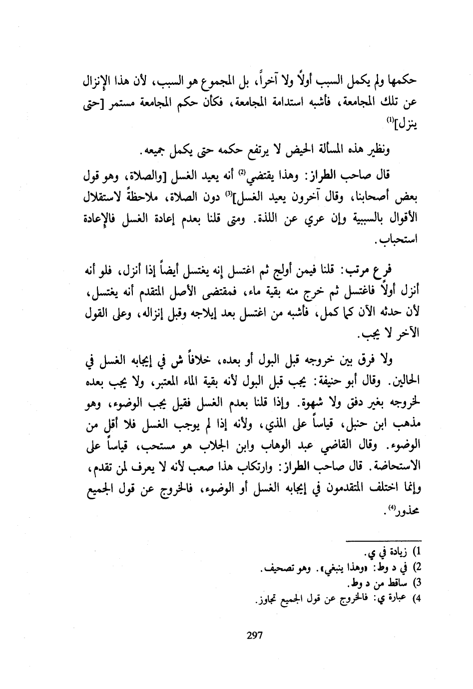 حُكْمُهَا وَلَمْ يُكْمُلِ السَّبَبُ أَوَّلًا وَلَا آخِرًا بَلِ الْمَجْمُوعُ هُوَ السَّبَبُ لِأَنَّ هَذَا الْإِنْزَالَ عَنْ تِلْكَ الْمُجَامَعَةِ فَأَشْبَهَ اسْتِدَامَةَ الْمُجَامَعَةِ فَكَأَنَّ حُكْمَ الْمُجَامَعَةِ مُسْتَمِرٌّ حَتَّى يُنْزِلَ وَنَظِيرُ هَذِهِ الْمَسْأَلَةِ الْحَيْضُ لَا يَرْتَفِعُ حُكْمُهُ حَتَّى يَكْمُلَ جَمِيعُهُ قَالَ صَاحِبُ الطَّرَّازِ وَهَذَا يَقْتَضِي أَنَّهُ يُعِيدُ الْغُسْلَ وَالصَّلَاةَ وَهُوَ قَوْلُ بَعْضِ أَصْحَابِنَا وَقَالَ آخَرُونَ يُعِيدُ الْغُسْلَ دُونَ الصَّلَاةِ مُلَاحَظَةً لِاسْتِقْلَالِ الْأَقْوَالِ بِالسَّبَبِيَّةِ وَإِنْ عُرِّيَ عَنِ اللَّذَّةِ وَمَتَى قُلْنَا بِعَدَمِ إِعَادَةِ الْغُسْلِ فَالْإِعَادَةُ اسْتِحْبَابٌ فَرْعٌ مُرَتَّبٌ قُلْنَا فِيمَنْ أَوْلَجَ ثُمَّ اغْتَسَلَ إِنَّهُ يَغْتَسِلُ أَيْضًا إِذَا أَنْزَلَ فَلَوْ أَنَّهُ أَنْزَلَ أَوَّلًا فَاغْتَسَلَ ثُمَّ خَرَجَ مِنْهُ بَقِيَّةُ مَاءٍ فَمُقْتَضَى الْأَصْلِ الْمُتَقَدِّمِ أَنَّهُ يَغْتَسِلُ لِأَنَّ حَدثهُ الْآن كَمَا كمل فَأَشْبَهَ مَنِ اغْتَسَلَ بَعْدَ إِيلَاجِهِ وَقَبْلَ إِنْزَالِهِ وَعَلَى الْقَوْلِ الْآخَرِ لَا يَجِبُ وَلَا فَرْقَ بَيْنَ خُرُوجِهِ قَبْلَ الْبَوْلِ أَوْ بَعْدَهُ خِلَافًا ش فِي إِيجَابِهِ الْغُسْلَ فِي الْحَالَيْنِ وَقَالَ أَبُو حنيفَة يَجِبُ قَبْلَ الْبَوْلِ لِأَنَّهُ بَقِيَّةُ الْمَاءِ الْمُعْتَبَرِ وَلَا يَجِبُ بَعْدَهُ لِخُرُوجِهِ بِغَيْرِ دَفْقٍ وَلَا شَهْوَةٍ وَإِذَا قُلْنَا بِعَدَمِ الْغُسْلِ فَقِيلَ يَجِبُ الْوُضُوءُ وَهُوَ مَذْهَبُ ابْنِ حَنْبَلٍ قِيَاسًا عَلَى الْمَذْيِ وَلِأَنَّهُ إِذَا لَمْ يُوجِبِ الْغُسْلَ فَلَا أقل من الْوُضُوءِ وَقَالَ الْقَاضِي عَبْدُ الْوَهَّابِ وَابْنُ الْجَلَّابِ هُوَ مُسْتَحَبٌّ قِيَاسًا عَلَى الِاسْتِحَاضَةِ قَالَ صَاحِبُ الطَّرَّازِ وَارْتِكَابُ هَذَا صَعْبٌ لِأَنَّهُ لَا يَعْرِفُ لِمَنْ تَقَدَّمَ وَإِنَّمَا اخْتَلَفَ الْمُتَقَدِّمُونَ فِي إِيجَابِهِ الْغُسْلَ أَوِ الْوُضُوءَ فَالْخُرُوجُ عَنْ قَوْلِ الْجَمِيعِ مَحْذُور