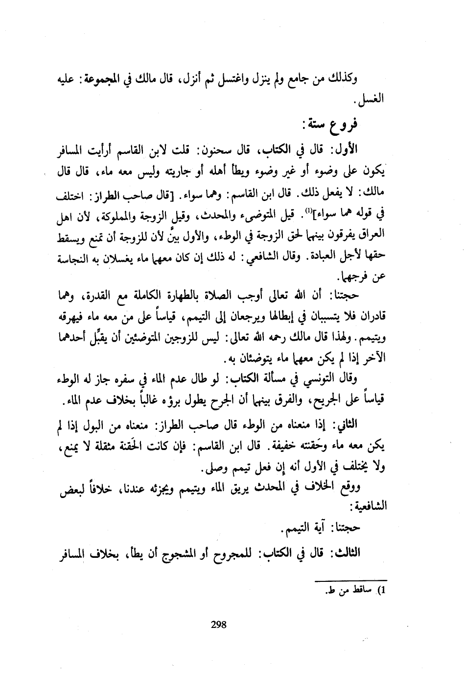 وَكَذَلِكَ مَنْ جَامَعَ وَلَمْ يُنْزِلْ وَاغْتَسَلَ ثُمَّ أَنْزَلَ قَالَ مَالِكٌ فِي الْمَجْمُوعَةِ عَلَيْهِ الْغُسْلُ فُرُوعٌ سِتَّةٌ الْأَوَّلُ قَالَ فِي الْكِتَابِ قَالَ سَحْنُونُ قُلْتُ لِابْنِ الْقَاسِمِ أَرَأَيْتَ الْمُسَافِرَ يَكُونُ عَلَى وُضُوءٍ أَوْ غَيْرِ وُضُوءٍ وَيَطَأُ أَهْلَهُ أَوْ جَارِيَتَهُ وَلَيْسَ مَعَهُ مَاءٌ قَالَ قَالَ مَالِكٌ لَا يَفْعَلُ ذَلِكَ قَالَ ابْنُ الْقَاسِمِ وهما سَوَاء قَالَ صَاحب الطّراز اخْتُلِفَ فِي قَوْلِهِ هُمَا سَوَاءٌ قِيلَ الْمُتَوَضِّئُ وَالْمُحْدِثُ وَقِيلَ الزَّوْجَةُ الْمَمْلُوكَةُ لِأَنَّ أَهْلَ الْعِرَاقِ يُفَرِّقُونَ بَيْنَهُمَا لِحَقِّ الزَّوْجَةِ فِي الْوَطْءِ وَالْأَوَّلُ بَيِّنٌ لِأَنَّ لِلزَّوْجَةِ أَنْ تَمْنَعَ وَيَسْقُطَ حَقُّهَا لأجل الْعِبَادَة وَقَالَ الشَّافِعِي لَهُ ذَلِكَ إِنْ كَانَ مَعَهُمَا مَاءٌ يَغْسِلَانِ بِهِ النَّجَاسَةَ عَنْ فَرْجِهِمَا حُجَّتُنَا أَنَّ اللَّهَ تَعَالَى أَوْجَبَ الصَّلَاةَ بِالطَّهَارَةِ الْكَامِلَةِ مَعَ الْقُدْرَةِ وَهُمَا قَادِرَانِ فَلَا يَتَسَبَّبَانِ فِي إِبْطَالِهَا وَيَرْجِعَانِ إِلَى لبتيمم قِيَاسًا عَلَى مَنْ مَعَهُ مَاءٌ فَيُهْرِقُهُ وَيَتَيَمَّمُ وَلِهَذَا قَالَ مَالِكٌ رَحِمَهُ اللَّهُ تَعَالَى لَيْسَ لِلزَّوْجَيْنِ الْمُتَوَضِّئَيْنِ أَنْ يُقَبِّلَ أَحَدُهُمَا الْآخَرَ إِذَا لم يكن مَعَهُمَا مَاء يتوضئان بِهِ وَقَالَ التُّونُسِيُّ فِي مَسْأَلَةِ الْكِتَابِ لَوْ طَالَ عَدَمُ الْمَاءِ فِي سَفَرِهِ جَازَ لَهُ الْوَطْءُ قِيَاسًا عَلَى الْجَرِيحِ وَالْفَرْقُ بَيْنَهُمَا أَنَّ الْجرْح يطول بُرْؤُهُ غَالِبا خلافًا عَدَمِ الْمَاءِ الثَّانِي إِذَا مَنَعْنَاهُ مِنَ الْوَطْءِ قَالَ صَاحِبُ الطَّرَّازِ مَنَعْنَاهُ مِنَ الْبَوْلِ إِذَا لَمْ يَكُنْ مَعَهُ مَاءٌ وَحَقْنَتُهُ خَفِيفَةٌ قَالَ ابْن الْقَاسِم فَإِذا كَانَتِ الْحَقْنَةُ مُثْقَلَةً لَا يُمْنَعُ وَلَا يُخْتَلَفُ فِي الْأَوَّلِ أَنَّهُ إِنْ فَعَلَ تَيَمَّمَ وَصَلَّى وَوَقع الْخلاف فِي الْمُحدث بريق الْمَاءَ وَيَتَيَمَّمُ وَيُجْزِئُهُ عِنْدَنَا خِلَافًا لِبَعْضِ الشَّافِعِيَّةِ حُجَّتُنَا آيَةُ التَّيَمُّمِ الثَّالِثُ قَالَ فِي الْكِتَابِ لِلْمَجْرُوحِ أَوِ الْمَشْجُوجِ أَنْ يَطَأَ بِخِلَافِ الْمُسَافِرِ