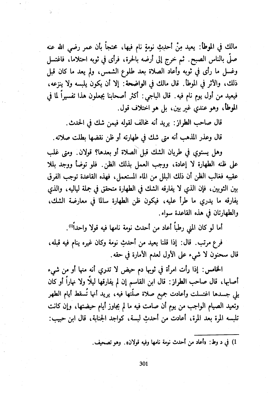 مَالِكٌ فِي الْمُوَطَّأِ يُعِيدُ مَنْ أَحْدَثَ نَوْمَةً نَامَ فِيهَا مُحْتَجًّا بِأَنَّ عُمَرَ رَضِيَ اللَّهُ عَنْهُ صَلَّى بِالنَّاسِ الصُّبْحَ ثُمَّ خَرَجَ إِلَى أَرْضِهِ بِالْحَرَّةِ فَرَأَى فِي ثَوْبِهِ احْتِلَامًا فَاغْتَسَلَ وَغَسَلَ مَا رَأَى فِي ثَوْبِهِ وَأَعَادَ الصَّلَاةَ بَعْدَ طُلُوعِ الشَّمْسِ وَلَمْ يُعِدْ مَا كَانَ قَبْلَ ذَلِكَ وَالْأَثَرُ فِي الْمُوَطَّأِ قَالَ مَالِكٌ فِي الْوَاضِحَةِ إِلَّا أَنْ يَكُونَ يَلْبَسُهُ وَلَا يَنْزِعُهُ فَيُعِيدُ مِنْ أَوَّلِ يَوْمٍ نَامَ فِيهِ قَالَ الْبَاجِيُّ أَكْثَرُ أَصْحَابِنَا يَجْعَلُونَ هَذَا تَفْسِيرًا لِمَا فِي الْمُوَطَّأِ وَهُوَ عِنْدِي غَيْرُ بَيِّنٍ بَلْ هُوَ اخْتِلَافُ قَوْلٍ. قَالَ صَاحِبُ الطَّرَّازِ يُرِيدُ أَنَّهُ مُخَالِفٌ لِقَوْلِهِ فِيمَنْ شَكَّ فِي الْحَدَثِ. قَالَ وَعُذْرُ الْمَذْهَبِ أَنَّهُ مَتَى شَكَّ فِي طَهَارَتِهِ أَوْ ظَنَّ نَقْضَهَا بَطَلَتْ صَلَاتُهُ. وَهَلْ يَسْتَوِي فِي طَرَيَانِ الشَّكِّ قَبْلَ الصَّلَاةِ أَوْ بَعْدَهَا قَوْلَانِ وَمَتَى غَلَبَ عَلَى ظَنِّهِ الطَّهَارَةُ لَا إِعَادَةَ وَوَجَبَ الْعَمَلُ بِذَلِكَ الظَّنِّ فَلَو تَوَضَّأ وَوجد بللاعقيبه فَغَالِبُ الظَّنِّ أَنَّ ذَلِكَ الْبَلَلَ مِنَ الْمَاءِ الْمُسْتَعْمَلِ فَهَذِهِ الْقَاعِدَةُ تُوجِبُ الْفَرْقَ بَيْنَ الثَّوْبَيْنِ فَإِنَّ الَّذِي لَا يُفَارِقُهُ الشَّكُّ فِي الطَّهَارَةِ مُتَحَقِّقٌ فِي جُمْلَةِ لَيَالِيهِ وَالَّذِي يُفَارِقُهُ مَا يَدْرِي مَا طَرَأَ عَلَيْهِ فَيَكُونُ ظَنُّ الطَّهَارَةِ سَالِمًا فِي مُعَارَضَةِ الشَّكِّ وَالطَّهَارَتَانِ فِي هَذِهِ الْقَاعِدَةِ سَوَاءٌ. أَمَّا لَوْ كَانَ الْمَنِيُّ رَطْبًا أَعَادَ مِنْ أَحْدَثِ نَوْمَةٍ نَامَهَا فِيهِ قَوْلًا وَاحِدًا. فَرْعٌ مُرَتَّبٌ قَالَ إِذَا قُلْنَا يُعِيدُ مِنْ أَحْدَثِ نَوْمَةٍ وَكَانَ غَيْرُهُ يَنَامُ فِيهِ قَبْلَهُ قَالَ سَحْنُونُ لَا شَيْءَ عَلَى الْأَوَّلِ لِعَدَمِ الْأَمَارَةِ فِي حَقِّهِ. الْخَامِسُ إِذَا رَأَتِ امْرَأَةٌ فِي ثَوْبِهَا دَمَ حَيْضٍ لَا تَدْرِي أَنَّهُ مِنْهَا أَوْ مِنْ شَيْءٍ أَصَابَهَا قَالَ صَاحِبُ الطَّرَّازِ قَالَ ابْنُ الْقَاسِمِ إِنْ لَمْ يُفَارِقْهَا لَيْلًا وَلَا نَهَارًا أَوْ كَانَ يَلِي جَسَدَهَا اغْتَسَلَتْ وَأَعَادَتْ جَمِيعَ صَلَاةٍ صَلَّتْهَا فِيهِ يُرِيدُ أَنَّهَا تُسْقِطُ أَيَّامَ الطُّهْرِ وَتُعِيدُ الصِّيَامَ الْوَاجِبَ مِنْ يَوْمِ أَنْ صَامَتْ فِيهِ مَا لَمْ يُجَاوِزْ أَيَّامَ حَيْضَتِهَا وَإِنْ كَانَتْ تَلْبَسُهُ الْمَرَّةَ بَعْدَ الْمَرَّةِ أَعَادَتْ مِنْ أَحْدَثِ لُبْسَةٍ كَوَاجِدِ الْجَنَابَةِ قَالَ ابْنُ حَبِيبٍ