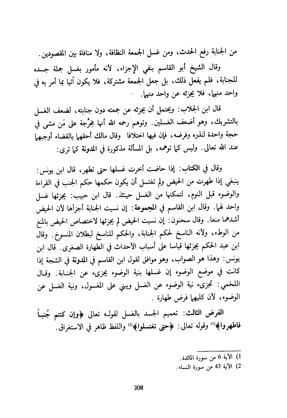 مِنَ الْجَنَابَةِ رَفْعُ الْحَدَثِ وَمِنْ غُسْلِ الْجُمُعَةِ النَّظَافَةُ وَلَا مُنَافَاةَ بَيْنَ الْمَقْصُودَيْنِ. وَقَالَ الشَّيْخُ أَبُو الْقَاسِم يَنْفِي الْإِجْزَاءِ لِأَنَّهُ مَأْمُورٌ بِغُسْلِ جُمْلَةِ جَسَدِهِ لِلْجَنَابَةِ فَلَمْ يَفْعَلْ ذَلِكَ بَلْ جَعَلَ الْجُمُعَةَ مُشْتَرَكَةً فَلَا يَكُونُ آتِيًا بِمَا أُمِرَ بِهِ فِي وَاحِدٍ مِنْهُمَا فَلَا يُجْزِئُهُ عَنْ وَاحِدٍ مِنْهُمَا. قَالَ ابْنُ الْجَلَّابِ وَيُحْتَمَلُ أَنْ يُجْزِئَهُ عَنْ جُمُعَتِهِ دُونَ جَنَابَتِهِ لِضَعْفِ الْغُسْلِ بِالتَّشْرِيكِ وَهُوَ أَضْعَفُ الْغُسْلَيْنِ وَتَوَهَّمَ رَحِمَهُ اللَّهُ أَنَّهَا مُخَرَّجَةٌ عَلَى مَنْ مَشَى فِي حَجَّةٍ وَاحِدَةٍ لِنَذْرِهِ وَفَرْضِهِ فَإِنَّ فِيهَا اخْتِلَافًا وَقَالَ مَالِكٌ أَحَقُّهُمَا بِالْقَضَاءِ أَوْجَبُهُمَا عِنْدَ اللَّهِ تَعَالَى وَلَيْسَ كَمَا تَوَهَّمَهُ بَلِ الْمَسْأَلَةُ مَذْكُورَةٌ فِي الْمُدَوَّنَةِ كَمَا تَرَى. وَقَالَ فِي الْكِتَابِ إِذَا حَاضَتْ أَخَّرَتْ غُسْلَهَا حَتَّى تَطْهُرَ قَالَ ابْنُ يُونُسَ يَنْبَغِي إِذَا طَهُرَتْ مِنَ الْحَيْضِ وَلَمْ تَغْتَسِلْ أَنْ يَكُونَ حُكْمُهَا حُكْمَ الْجُنُبِ فِي الْقِرَاءَةِ وَالْوُضُوءِ قَبْلَ النَّوْمِ لِتَمَكُّنِهَا مِنَ الْغُسْلِ حِينَئِذٍ قَالَ ابْنُ حَبِيبٍ يُجْزِئُهَا غُسْلٌ وَاحِدٌ لَهُمَا وَقَالَ ابْنُ الْقَاسِمِ فِي الْمَجْمُوعَةِ إِنْ نَسِيَتِ الْجَنَابَةَ أَجْزَأَهَا لِأَنَّ الْحَيْضَ أَشَدُّهُمَا مَنْعًا وَقَالَ سَحْنُونُ إِنْ نَسِيَتِ الْحَيْضَ لَمْ يُجْزِئْهَا لِاخْتِصَاصِ الْحَيْضِ بِالْمَنْعِ مِنَ الْوَطْءِ وَلِأَنَّهُ النَّاسِخُ لِحُكْمِ الْجَنَابَةِ وَالْحُكْمُ لِلنَّاسِخِ لِبُطْلَانِ الْمَنْسُوخِ وَقَالَ ابْنُ عَبْدِ الْحَكَمِ يُجْزِئُهَا قِيَاسًا عَلَى أَسْبَابِ الْأَحْدَاثِ فِي الطَّهَارَةِ الصُّغْرَى قَالَ ابْنُ يُونُسَ وَهَذَا هُوَ الصَّوَابُ وَهُوَ مُوَافِقٌ لِقَوْلِ ابْنِ الْقَاسِمِ فِي الْمُدَوَّنَة فِي الشَّجَّة إِذا كَانَت مَوْضِعَ الْوُضُوءِ إِنْ غَسَلَهَا بِنِيَّةِ الْوُضُوءِ يُجْزِئُ عَنِ الْجَنَابَةِ وَقَالَ اللَّخْمِيُّ تُجْزِئُ نِيَّةُ الْوُضُوءِ عَنِ الْغُسْلِ وَيَبْنِي عَلَى الْمَغْسُولِ وَنِيَّةُ الْغُسْلِ عَنِ الْوُضُوءِ لِأَنَّ كِلَيْهِمَا فَرْضُ طَهَارَةٍ. الْفَرْضُ الثَّالِثُ تَعْمِيمُ الْجَسَدِ بِالْغُسْلِ لِقَوْلِهِ تَعَالَى {وَإِنْ كُنْتُم جنبا فاطهروا} وَقَوله تَعَالَى {حَتَّى تغتسلوا} وَاللَّفْظُ ظَاهِرٌ فِي الِاسْتِغْرَاقِ.