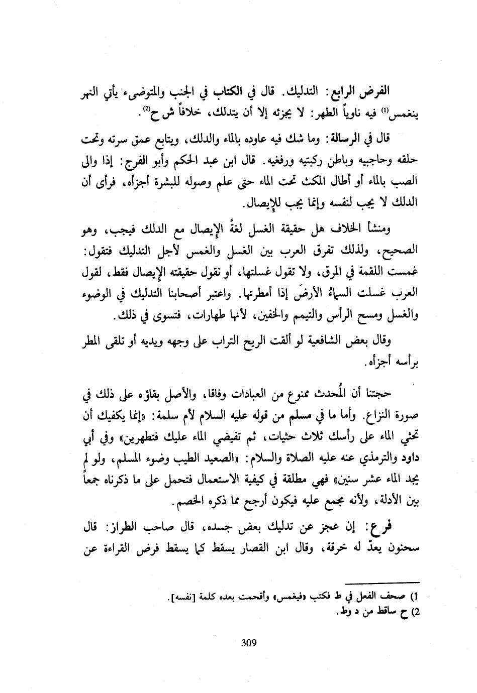 الْفَرْضُ الرَّابِعُ التَّدْلِيكُ قَالَ فِي الْكِتَابِ فِي الْجُنُبِ وَالْمُتَوَضِّئِ يَأْتِي النَّهْرَ يَنْغَمِسُ فِيهِ نَاوِيًا الطُّهْرَ لَا يُجْزِئُهُ إِلَّا أَنْ يَتَدَلَّكَ خِلَافًا ش ح. قَالَ فِي الرِّسَالَةِ وَمَا شَكَّ فِيهِ عَاوَدَهُ بِالْمَاءِ وَالدَّلْكِ وَيُتَابِعُ عُمْقَ سُرَّتِهِ وَتَحْتَ حَلْقِهِ وَحَاجِبَيْهِ وَبَاطِنَ رُكْبَتَيْهِ وَرُفْغَيْهِ قَالَ ابْنُ عَبْدِ الْحَكَمِ وَأَبُو الْفَرَجِ إِذَا وَالَى الصَّبَّ بِالْمَاءِ أَوْ أَطَالَ الْمُكْثَ تَحْتَ الْمَاءِ حَتَّى عَلِمَ وُصُولَهُ لِلْبَشَرَةِ أَجْزَأَهُ فَرَأَى أَنَّ الدَّلْكَ لَا يَجِبُ لِنَفْسِهِ وَإِنَّمَا يَجِبُ لِلْإِيصَالِ. وَمَنْشَأُ الْخِلَافِ هَلْ حَقِيقَةُ الْغُسْلِ لُغَةً الْإِيصَالُ مَعَ الدَّلْكِ فَيَجِبُ وَهُوَ الصَّحِيحُ وَلِذَلِكَ تُفَرِّقُ الْعَرَبُ بَيْنَ الْغَسْلِ وَالْغَمْسِ لِأَجْلِ التَّدْلِيكِ فَتَقُولُ غَمَسْتُ اللُّقْمَةَ فِي الْمَرَقِ وَلَا تَقُولُ غَسَلْتُهَا أَوْ نَقُولُ حَقِيقَتُهُ الْإِيصَالُ فَقَطْ لِقَوْلِ الْعَرَبِ غَسَلَتِ السَّمَاءُ الْأَرْضَ إِذَا أَمْطَرَتْهَا وَاعْتَبَرَ أَصْحَابُنَا التَّدْلِيكَ فِي الْوُضُوءِ وَالْغُسْلِ وَمَسْحِ الرَّأْسِ وَالتَّيَمُّمِ وَالْخُفَّيْنِ لِأَنَّهَا طَهَارَاتٌ فَتُسَوَّى فِي ذَلِكَ. وَقَالَ بَعْضُ الشَّافِعِيَّةِ لَوْ أَلْقَتِ الرِّيحُ التُّرَابَ عَلَى وَجْهِهِ وَيَدَيْهِ أَوْ تَلَقَّى الْمَطَرَ بِرَأْسِهِ أَجْزَأَهُ. حُجَّتُنَا أَنَّ الْمُحْدِثَ مَمْنُوعٌ مِنَ الْعِبَادَاتِ وِفَاقًا وَالْأَصْلُ بَقَاؤُهُ عَلَى ذَلِكَ فِي صُورَةِ النِّزَاعِ وَأَمَّا مَا فِي مُسْلِمٍ مِنْ قَوْلِهِ عَلَيْهِ السَّلَامُ لِأُمِّ سَلَمَةَ