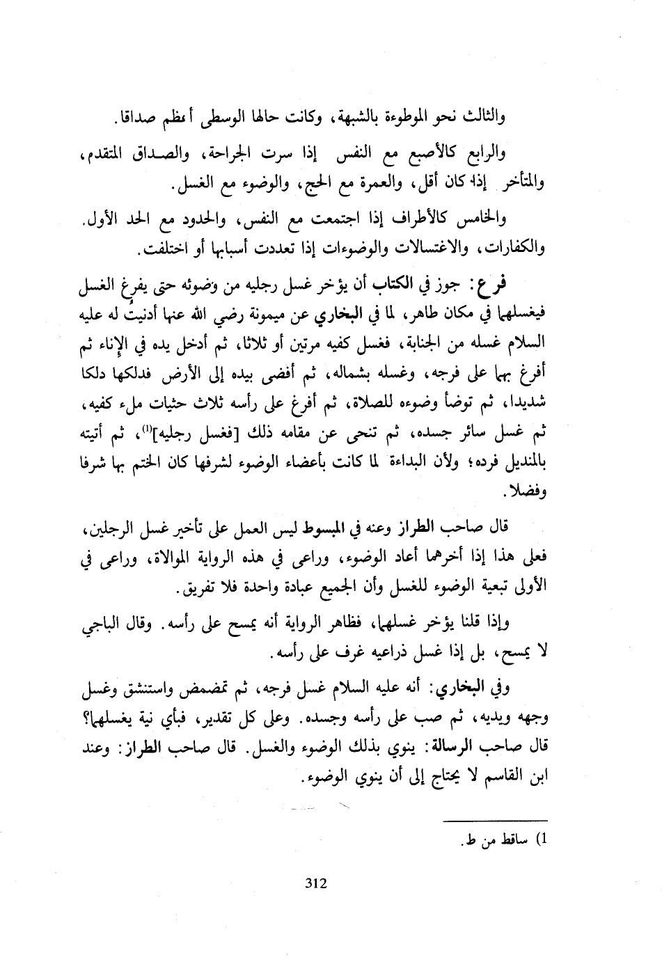 وَالثَّالِثُ نَحْوَ الْمَوْطُوءَةِ بِالشُّبْهَةِ وَكَانَتْ حَالُهَا الْوُسْطَى أَعْظَمَ صَدَاقًا. وَالرَّابِعُ كَالْأُصْبُعِ مَعَ النَّفْسِ إِذَا سَرَتِ الْجِرَاحَةُ وَالصَّدَاقِ الْمُتَقَدِّمِ وَالْمُتَأَخِّرِ إِذَا كَانَ أَقَلَّ وَالْعُمْرَةِ مَعَ الْحَجِّ وَالْوُضُوءِ مَعَ الْغُسْلِ. وَالْخَامِسُ كَالْأَطْرَافِ إِذَا اجْتَمَعَتْ مَعَ النَّفْسِ وَالْحُدُودِ مَعَ الْحَدِّ الْأَوَّلِ وَالْكَفَّارَاتِ وَالِاغْتِسَالَاتِ وَالْوُضُوءَاتِ إِذَا تَعَدَّدَتْ أَسْبَابُهَا أَوِ اخْتَلَفَتْ. فَرْعٌ جَوَّزَ فِي الْكِتَابِ أَنْ يُؤَخِّرَ غَسْلَ رِجْلَيْهِ مِنْ وُضُوئِهِ حَتَّى يَفْرُغَ الْغُسْلُ فَيَغْسِلَهُمَا فِي مَكَانٍ طَاهِرٍ لما فِي البُخَارِيّ من مَيْمُونَةَ رَضِيَ اللَّهُ عَنْهَا أَدْنَيْتُ لَهُ عَلَيْهِ السَّلَامُ غُسْلَهُ مِنَ الْجَنَابَةِ فَغَسَلَ كَفَّيْهِ مَرَّتَيْنِ أَوْ ثَلَاثًا ثُمَّ أَدْخَلَ يَدَهُ فِي الْإِنَاءِ ثُمَّ أَفْرَغَ بِهِمَا عَلَى فَرْجِهِ وَغَسَلَهُ بِشِمَالِهِ ثُمَّ أَفْضَى بِيَدِهِ إِلَى الْأَرْضِ فَدَلَكَهَا دَلْكًا شَدِيدًا ثُمَّ تَوَضَّأَ وُضُوءَهُ لِلصَّلَاةِ ثُمَّ أَفْرَغَ عَلَى رَأْسِهِ ثَلَاثَ حَثَيَاتٍ مَلْءَ كَفَّيْهِ ثُمَّ غَسَلَ سَائِرَ جَسَدِهِ ثُمَّ تَنَحَّى عَنْ مَقَامِهِ ذَلِكَ فَغَسَلَ رِجْلَيْهِ ثُمَّ أَتَيْتُهُ بِالْمِنْدِيلِ فَرَدَّهُ وَلِأَنَّ الْبَدَاءَةَ لَمَّا كَانَتْ بِأَعْضَاءِ الْوُضُوءِ لِشَرَفِهَا كَانَ الْخَتْمُ بِهَا شَرَفًا وَفَضْلًا. قَالَ صَاحِبُ الطَّرَّازِ وَعَنْهُ فِي الْمَبْسُوطِ لَيْسَ الْعَمَلُ عَلَى تَأْخِيرِ غَسْلِ الرِّجْلَيْنِ فَعَلَى هَذَا إِذَا أَخَّرَهُمَا أَعَادَ الْوُضُوءَ وَرَاعَى فِي هَذِهِ الرِّوَايَةِ الْمُوَالَاةَ وَرَاعَى فِي الْأُولَى تَبَعِيَّةَ الْوُضُوءِ لِلْغُسْلِ وَأَنَّ الْجَمِيعَ عِبَادَةٌ وَاحِدَةٌ فَلَا تَفْرِيقَ. وَإِذَا قُلْنَا يُؤَخِّرُ غَسْلَهُمَا فَظَاهِرُ الرِّوَايَةِ أَنَّهُ يَمْسَحُ عَلَى رَأْسِهِ وَقَالَ الْبَاجِيُّ لَا يَمْسَحُ بَلْ إِذَا غَسَلَ ذِرَاعَيْهِ غَرَفَ عَلَى رَأْسِهِ. وَفِي الْبُخَارِيِّ أَنَّهُ عَلَيْهِ السَّلَامُ غَسَلَ فَرْجَهُ ثُمَّ تَمَضْمَضَ واستنشق وَغسل وَجهه وَيَديه ثمَّ صب عَلَى رَأْسِهِ وَجَسَدِهِ وَعَلَى كُلِّ تَقْدِيرٍ فَبِأَيِّ نِيَّةٍ يَغْسِلُهُمَا قَالَ صَاحِبُ الرِّسَالَةِ يَنْوِي بِذَلِكَ الْوُضُوءَ وَالْغُسْلَ قَالَ صَاحِبُ الطَّرَّازِ وَعِنْدَ ابْنِ الْقَاسِمِ لَا يَحْتَاجُ إِلَى أَنْ يَنْوِيَ الْوُضُوءَ.