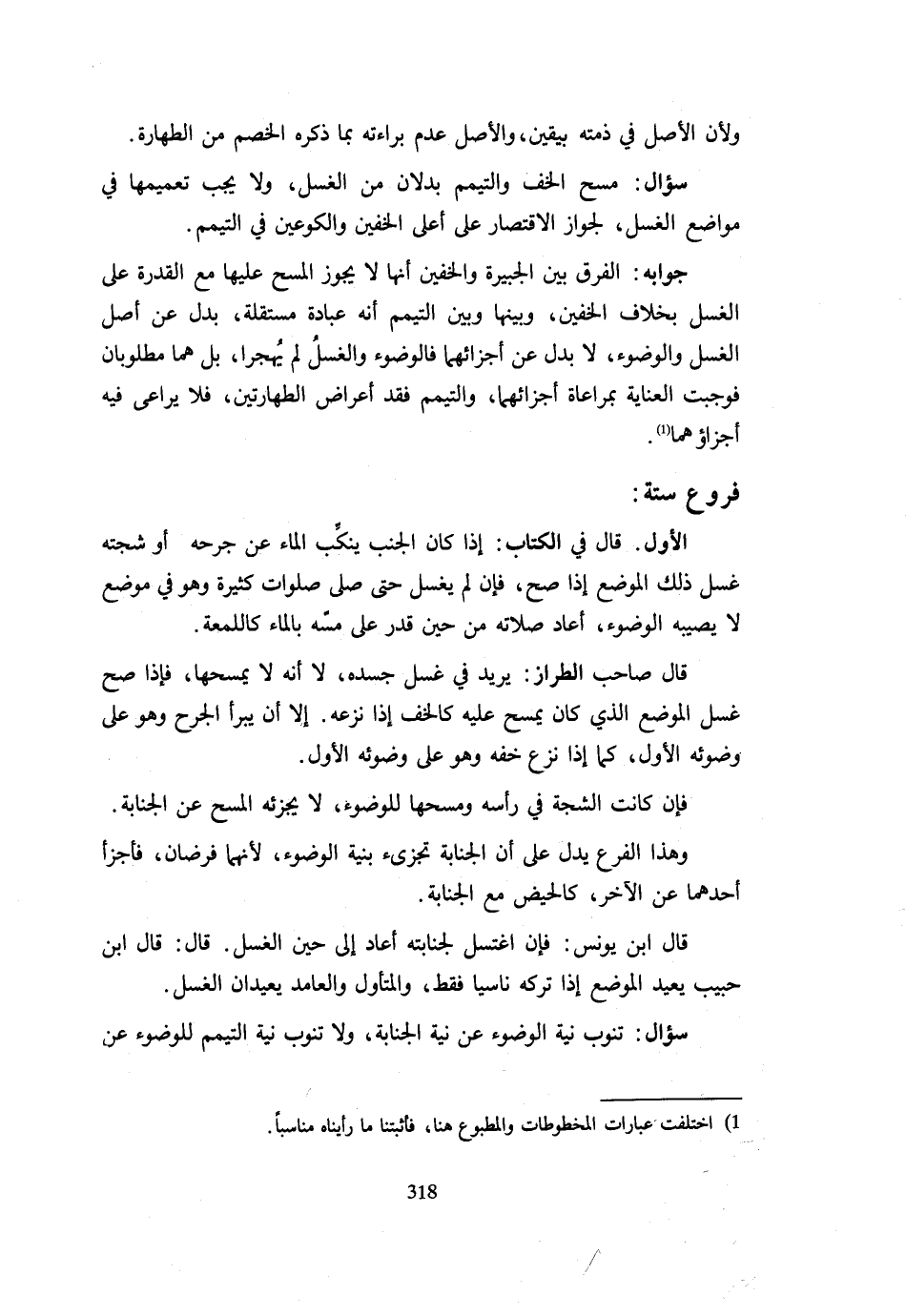 وَلِأَنَّ الْأَصْلَ فِي ذِمَّتِهِ بِيَقِينٍ وَالْأَصْلُ عَدَمُ بَرَاءَتِهِ بِمَا ذَكَرَهُ الْخَصْمُ مِنَ الطَّهَارَةِ. سُؤَالٌ مَسْحُ الْخُفِّ وَالتَّيَمُّمُ بَدَلَانِ مِنَ الْغُسْلِ وَلَا يَجِبُ تَعْمِيمُهَا فِي مَوَاضِعِ الْغَسْلِ لِجَوَازِ الِاقْتِصَارِ عَلَى أَعْلَى الْخُفَّيْنِ وَالْكُوعَيْنِ فِي التَّيَمُّمِ. جَوَابُهُ الْفَرْقُ بَيْنَ الْجَبِيرَةِ وَالْخُفَّيْنِ أَنَّهَا لَا يَجُوزُ الْمَسْحُ عَلَيْهَا مَعَ الْقُدْرَةِ عَلَى الْغَسْلِ بِخِلَافِ الْخُفَّيْنِ وَبَيْنَهَا وَبَيْنَ التَّيَمُّمِ أَنَّهُ عِبَادَةٌ مُسْتَقِلَّةٌ بَدَلٌ عَنْ أَصْلِ الْغُسْلِ وَالْوُضُوءِ لَا بَدَلَ عَنْ أَجْزَائِهِمَا فَالْوُضُوءُ وَالْغُسْلُ لَمْ يُهْجَرَا بَلْ هُمَا مَطْلُوبَانِ فَوَجَبَتِ الْعِنَايَةُ بِمُرَاعَاةِ أَجْزَائِهِمَا وَالتَّيَمُّمُ فَقَدَ أَعْرَاضَ الطَّهَارَتَيْنِ فَلَا يُرَاعَى فِيهِ أَجْزَاؤُهُمَا. فُرُوعٌ سِتَّةٌ: الْأَوَّلُ قَالَ فِي الْكِتَابِ إِذَا كَانَ الْجُنُبُ يَنْكَبُّ الْمَاءُ عَنْ جُرْحِهِ أَوْ شَجَّتِهِ غَسَلَ ذَلِكَ الْمَوْضِعَ إِذَا صَحَّ فَإِنْ لم يغسل حَتَّى صَلَوَاتٍ كَثِيرَةً وَهُوَ فِي مَوْضِعٍ لَا يُصِيبُهُ الْوُضُوءُ أَعَادَ صَلَاتَهُ مِنْ حِينِ قَدَرَ عَلَى مَسِّهِ بِالْمَاءِ كَاللُّمْعَةِ. قَالَ صَاحِبُ الطَّرَّازِ يُرِيدُ فِي غَسْلِ جَسَدِهِ لَا أَنَّهُ لَا يَمْسَحُهَا فَإِذا صَحَّ غسل الْموضع الَّذِي كَانَ بمسح عَلَيْهِ كَالْخُفِّ إِذَا نَزَعَهُ إِلَّا أَنْ يَبْرَأَ الْجُرْحُ وَهُوَ عَلَى وُضُوئِهِ الْأَوَّلِ كَمَا إِذَا نَزَعَ خُفَّهُ وَهُوَ عَلَى وُضُوئِهِ الْأَوَّلِ فَإِنْ كَانَتِ الشَّجَّةُ فِي رَأْسِهِ وَمَسَحَهَا لِلْوُضُوءِ لَا يُجْزِئُهُ الْمَسْحُ عَنِ الْجَنَابَةِ وَهَذَا الْفَرْعُ يَدُلُّ عَلَى أَنَّ الْجَنَابَةَ تُجْزِئُ بِنِيَّةِ الْوُضُوءِ لِأَنَّهُمَا فَرْضَانِ فَأَجْزَأَ أَحَدُهُمَا عَنِ الْآخَرِ كَالْحَيْضِ مَعَ الْجَنَابَةِ قَالَ ابْنُ يُونُسَ فَإِنِ اغْتَسَلَ لِجَنَابَتِهِ أَعَادَ حِينَ الْغُسْلِ قَالَ قَالَ ابْنُ حَبِيبٍ يُعِيدُ الْمَوْضِعَ إِذَا تَرَكَهُ نَاسِيًا فَقَطْ وَالْمُتَأَوِّلُ وَالْعَامِدُ يُعِيدَانِ الْغُسْلَ. سُؤَالٌ تَنُوبُ نِيَّةُ الْوُضُوءِ عَنْ نِيَّةِ الْجَنَابَةِ وَلَا تَنُوبُ نِيَّةُ التَّيَمُّمِ للْوُضُوء عَن